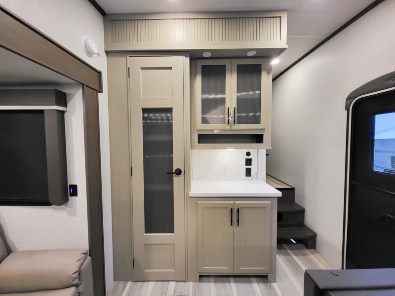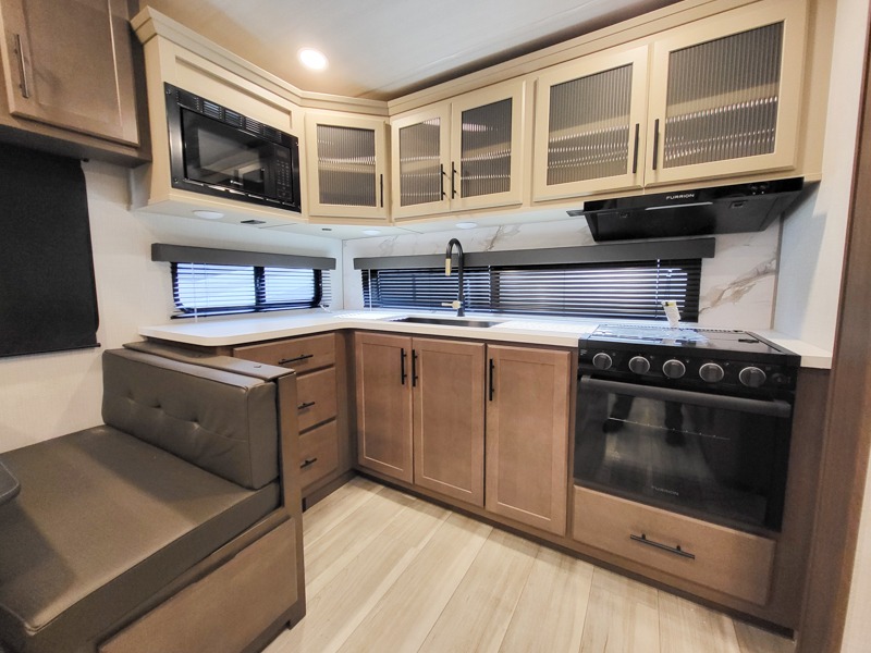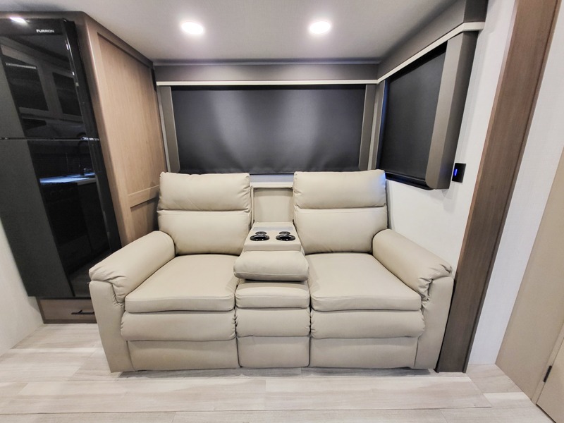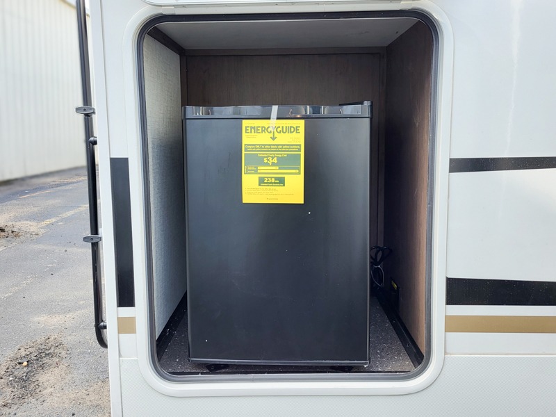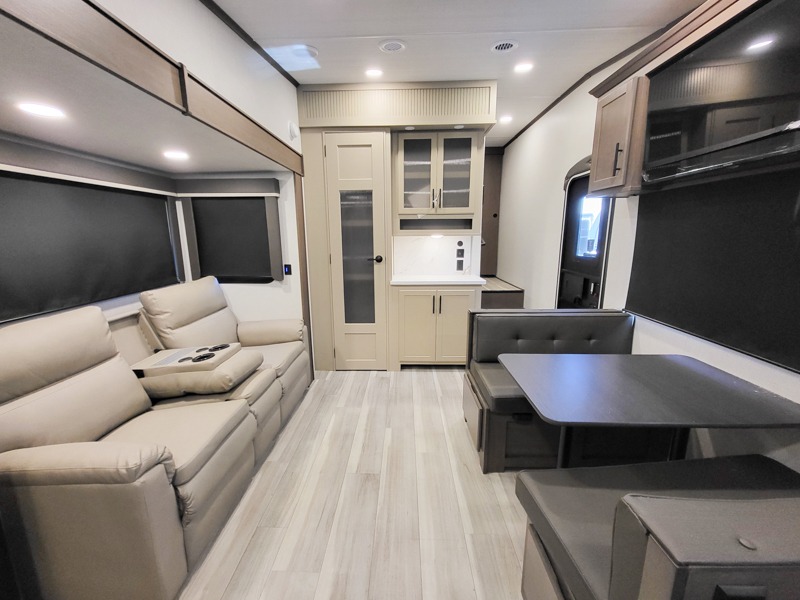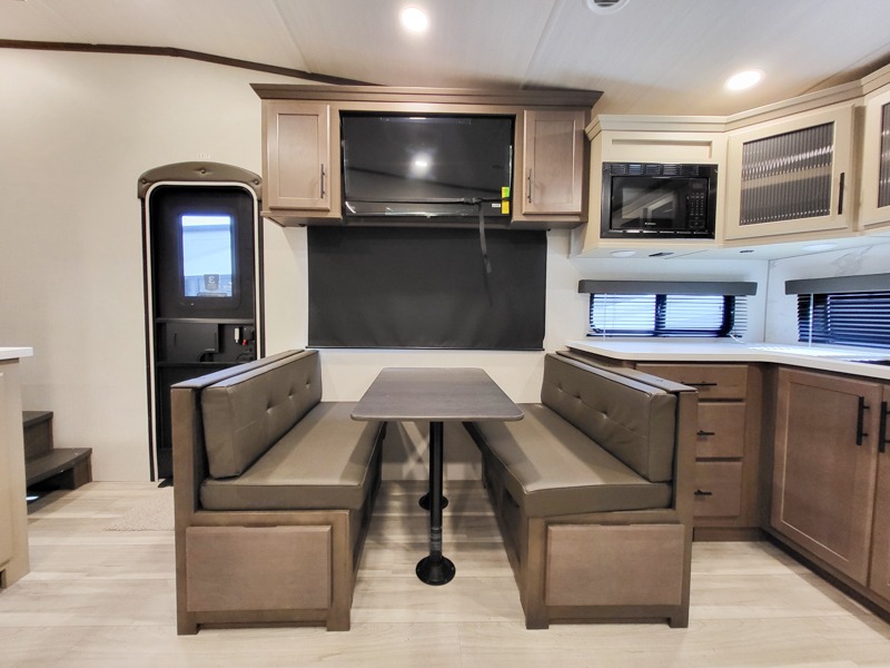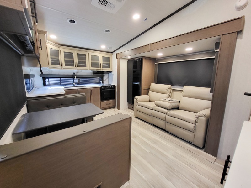 You'll love camping in this rear kitchen fifth wheel that can sleep five to six! Up front, you will enjoy a private bedroom with a king bed and bedside wardrobe/nightstands as well as a wardrobe with washer and dryer prep. A complete bath provides a large shower, toilet and sink, plus linen storage which you are sure to appreciate as you travel. There are plenty of options for this unit making it easy to customize to your use and style. The theater seating and free standing dinette options can be selected in place of the sleeper sofa and booth dinette if you prefer. There is also a 16' awning to create even more living space to enjoy, and the unobstructed pass-through storage compartment can easily house all of your outdoor camping gear like lawn chairs and yard games.