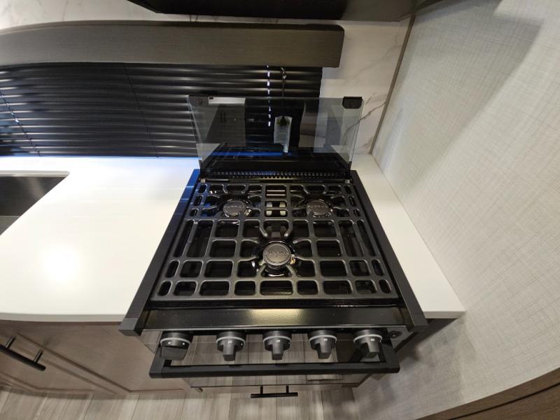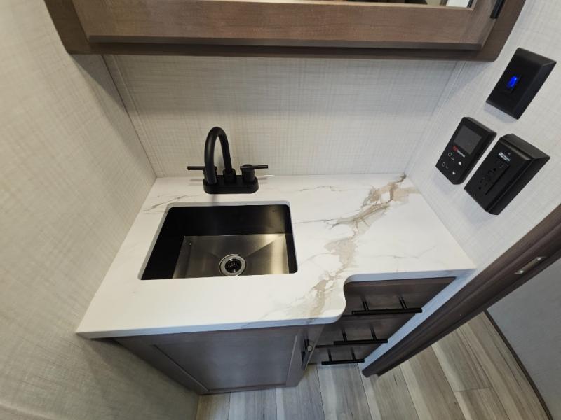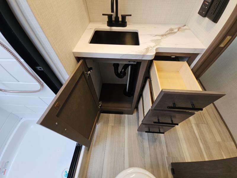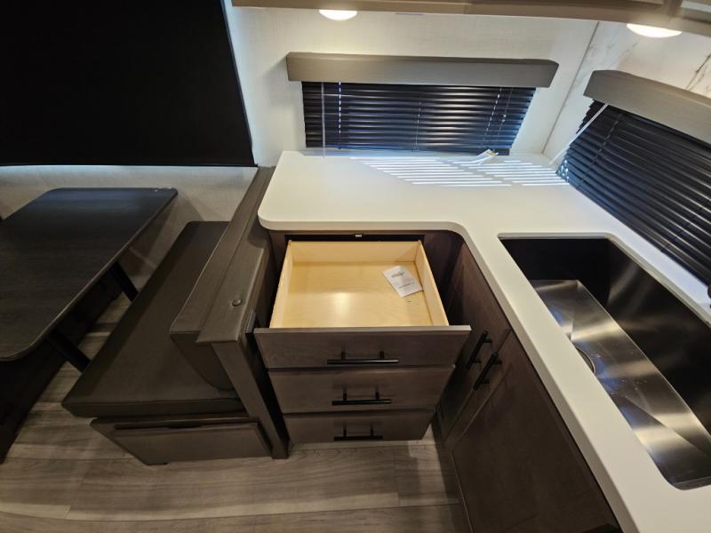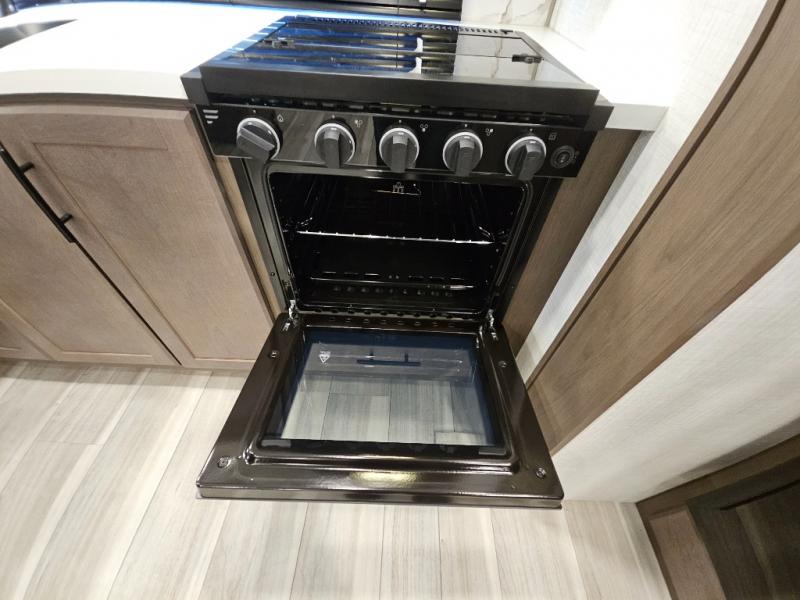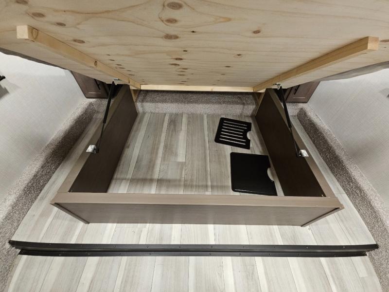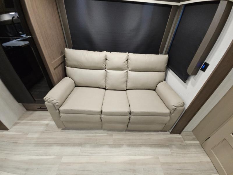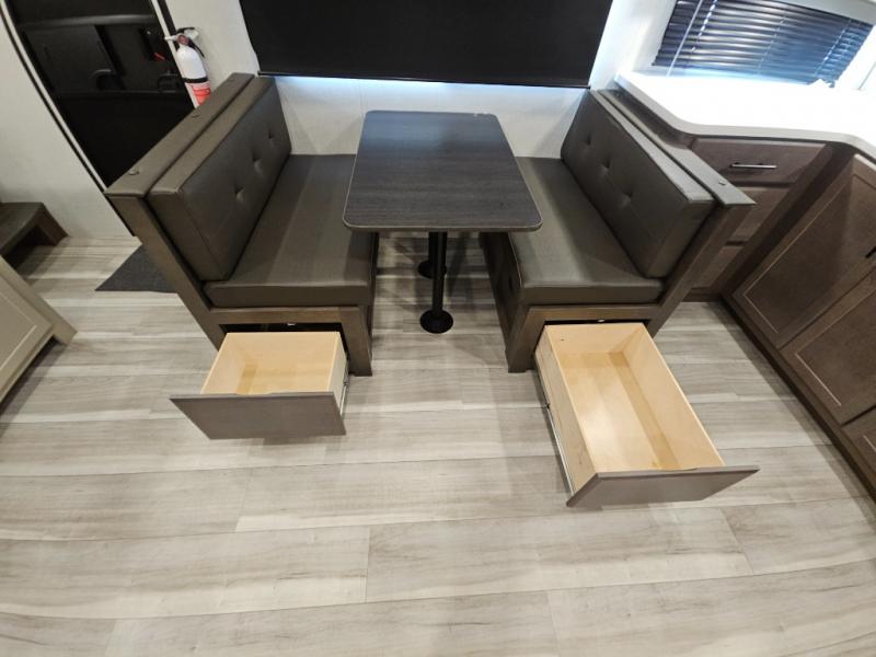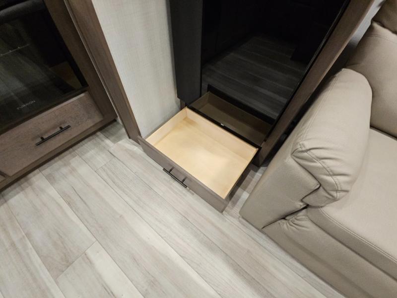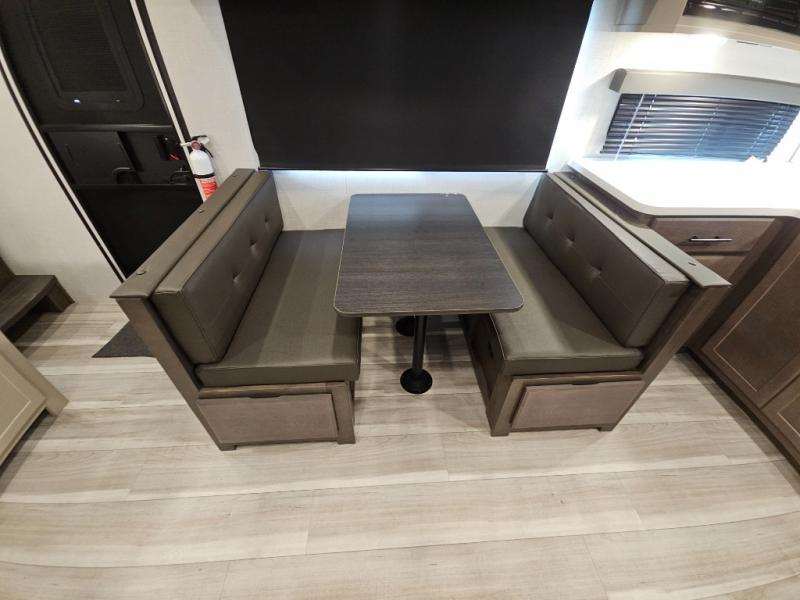 You'll love camping in this rear kitchen fifth wheel that can sleep five to six! Up front, you will enjoy a private bedroom with a king bed and bedside wardrobe/nightstands as well as a wardrobe with washer and dryer prep. A complete bath provides a large shower, toilet and sink, plus linen storage which you are sure to appreciate as you travel. There are plenty of options for this unit making it easy to customize to your use and style. The theater seating and free standing dinette options can be selected in place of the sleeper sofa and booth dinette if you prefer. There is also a 16' awning to create even more living space to enjoy, and the unobstructed pass-through storage compartment can easily house all of your outdoor camping gear like lawn chairs and yard games.