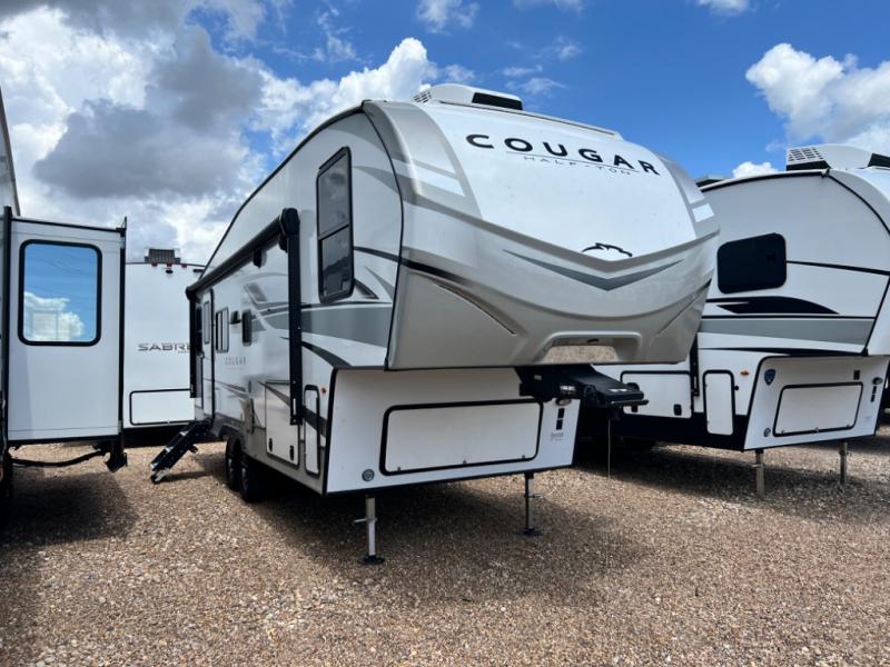 The Keystone Cougar Half-Ton fifth wheel and travel trailers are known as one of America's favorites for a reason! Some of those reasons are the exclusive features that come from Keystone, like the Winegard Air 360+ omni-directional rooftop antenna, the in-floor heating ducts, and the HyperCore composite wall construction with Vixen Fibrogloss high-gloss finish. The Cougar Half-Ton has a Climate Guard protection package with heat-deflecting white sidewalls, two roof attic vents, PEX plumbing and more to enjoy four season camping. Inside, you'll love the dimmable lighting, night roller shades throughout, shower skylight, and bedside USB outlets to keep your electronics charged.