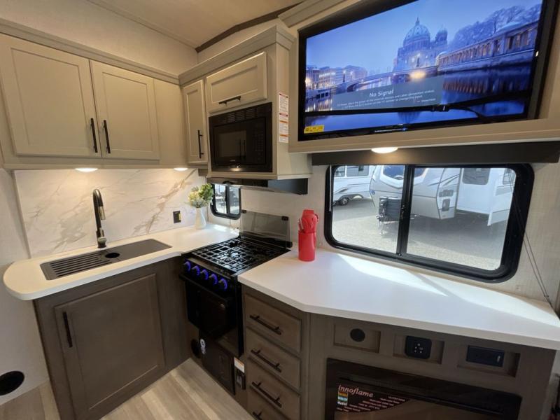 It's got a cozy bedroom up front for maximum chill-out, a kitchen ready for your culinary experiments (or just really good toast). With dimmable LED ligts it's built super cozy with movie nights in mind. Plus, with its "Climate Guard protection" and "HyperCore composite walls," it's basically an RV that's secretly a fortress... but a really comfy one.
