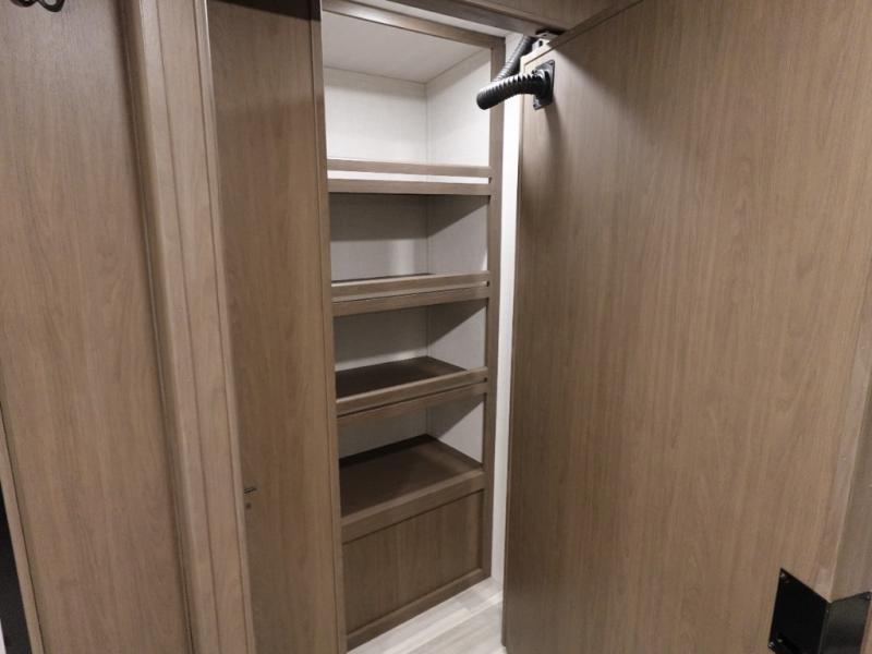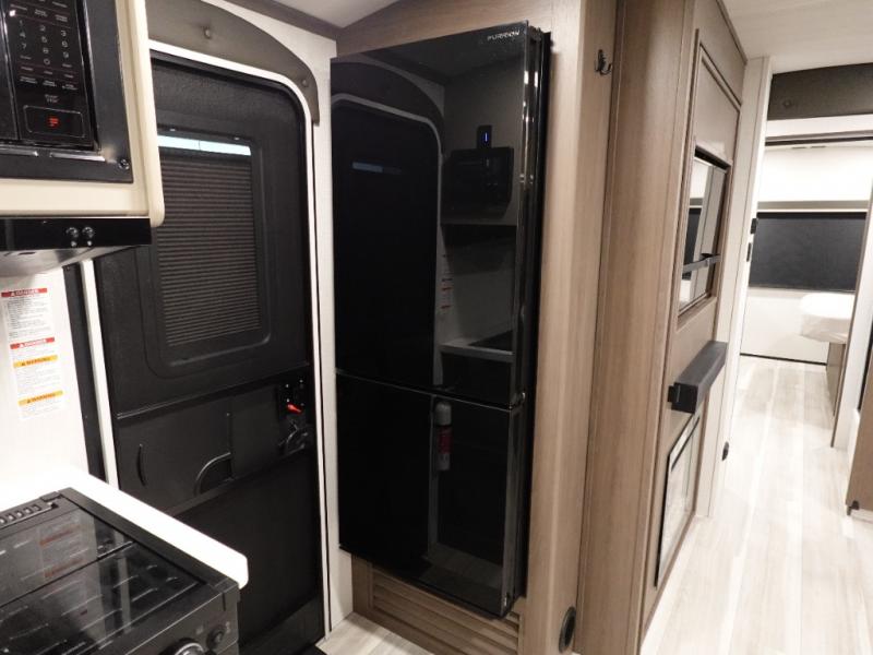 With a private bedroom, this Cougar Half-Ton travel trailer shows that you can still be comfortable even while you're away from home! The bed slides out to provide more interior space and there is a wardrobe opposite near the private entry door. The main entry up front leads into a spacious combined kitchen and living area with the front kitchen offering plenty of counter space and overhead storage. There is a 12-volt refrigerator to the left of the entry door, and access to a walk-in pantry is right around the corner from the pivoting entertainment center opposite a theater sofa and booth dinette slide. This unit also features a full-width walk-thru bath giving you plenty of room to shower and change.