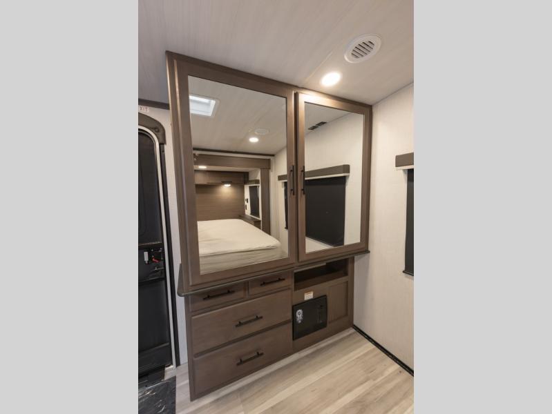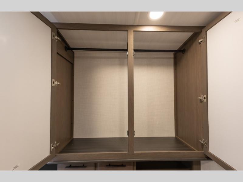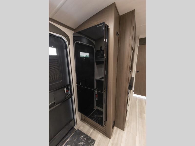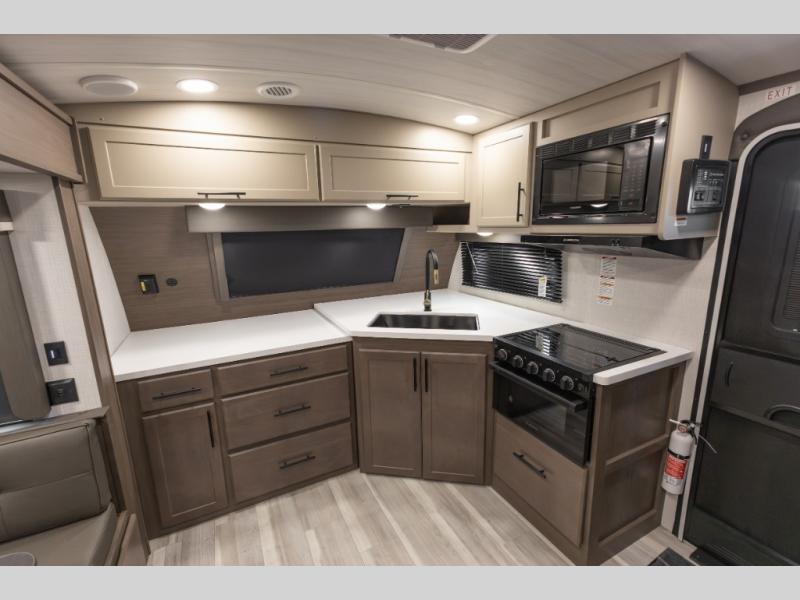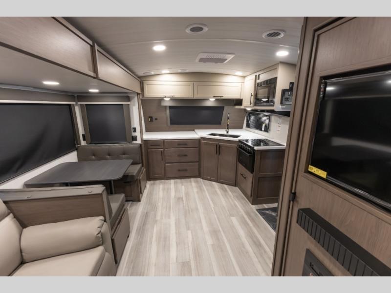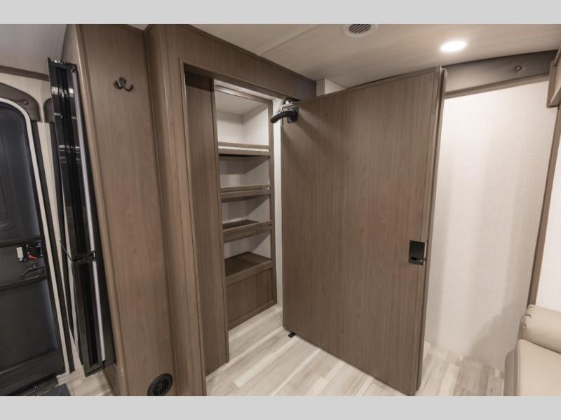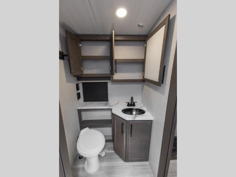 With a queen-size bed and a king bed option, this Cougar Half-Ton travel trailer shows that you can still be comfortable even while you're away from home! The bed slides out to provide more interior space and there is a wardrobe opposite near the private entry door. The main entry up front leads into a spacious combined kitchen and living area with the front kitchen offering plenty of counter space and overhead storage. There is a 12-volt refrigerator to the left of the entry door, and access to a walk-in pantry is right around the corner from the pivoting entertainment center opposite a tri-fold sofa sleeper and booth dinette slide. This unit also features a full-width walk-thru bath giving you plenty of room to shower and change.