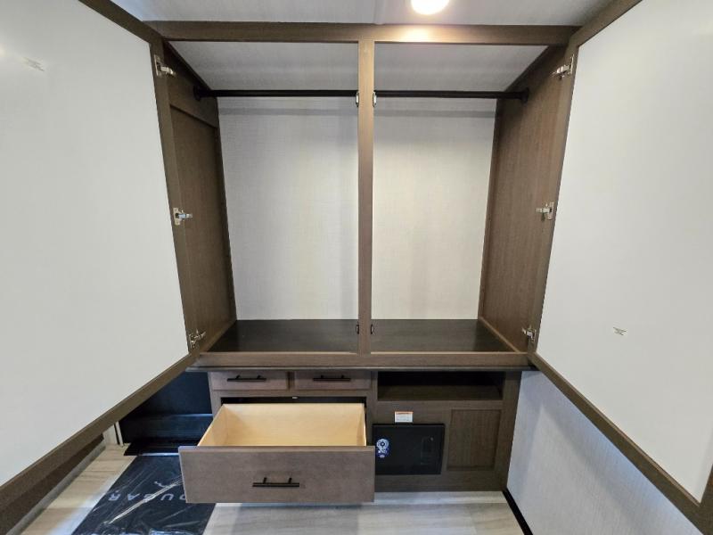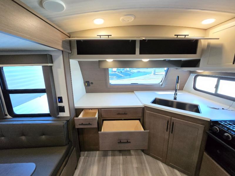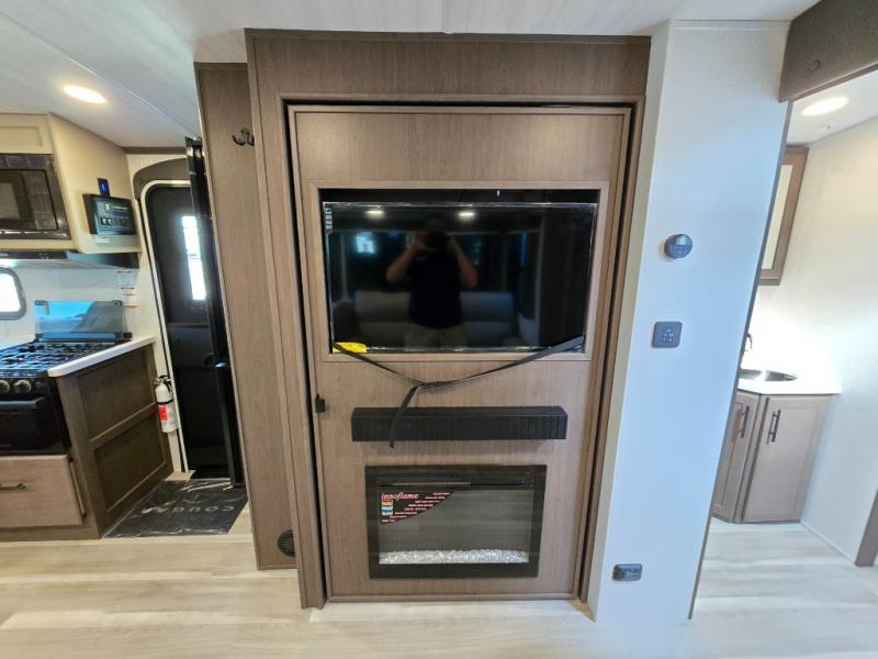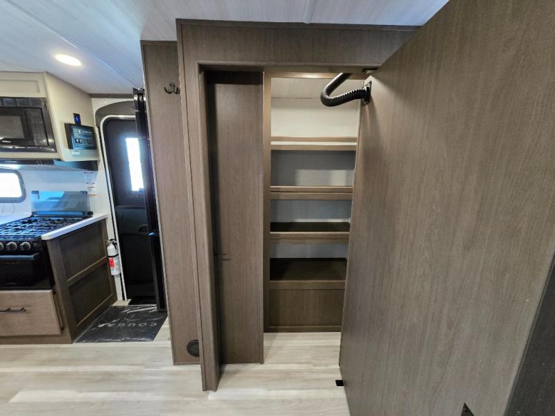 With a queen-size bed and a king bed option, this Cougar Half-Ton travel trailer shows that you can still be comfortable even while you're away from home! The bed slides out to provide more interior space and there is a wardrobe opposite near the private entry door. The main entry up front leads into a spacious combined kitchen and living area with the front kitchen offering plenty of counter space and overhead storage. There is a 12-volt refrigerator to the left of the entry door, and access to a walk-in pantry is right around the corner from the pivoting entertainment center opposite a tri-fold sofa sleeper and booth dinette slide. This unit also features a full-width walk-thru bath giving you plenty of room to shower and change.
