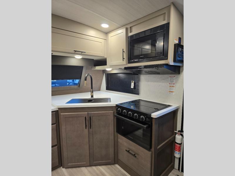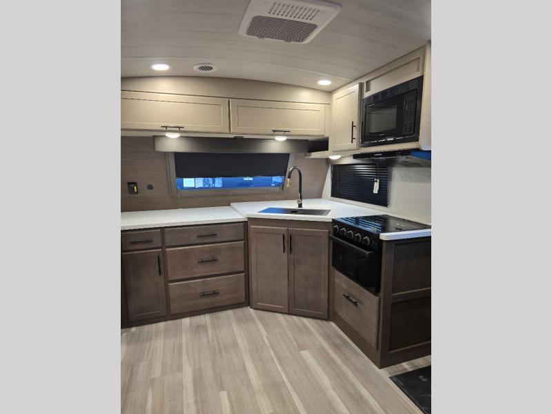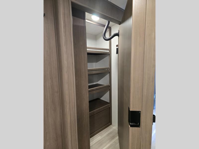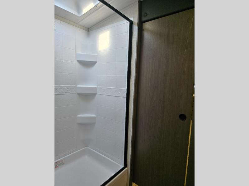 With a queen-size bed and a king bed option, this Cougar Half-Ton travel trailer shows that you can still be comfortable even while you're away from home! The bed slides out to provide more interior space and there is a wardrobe opposite near the private entry door. The main entry up front leads into a spacious combined kitchen and living area with the front kitchen offering plenty of counter space and overhead storage. There is a 12-volt refrigerator to the left of the entry door, and access to a walk-in pantry is right around the corner from the pivoting entertainment center opposite a tri-fold sofa sleeper and booth dinette slide. This unit also features a full-width walk-thru bath giving you plenty of room to shower and change.