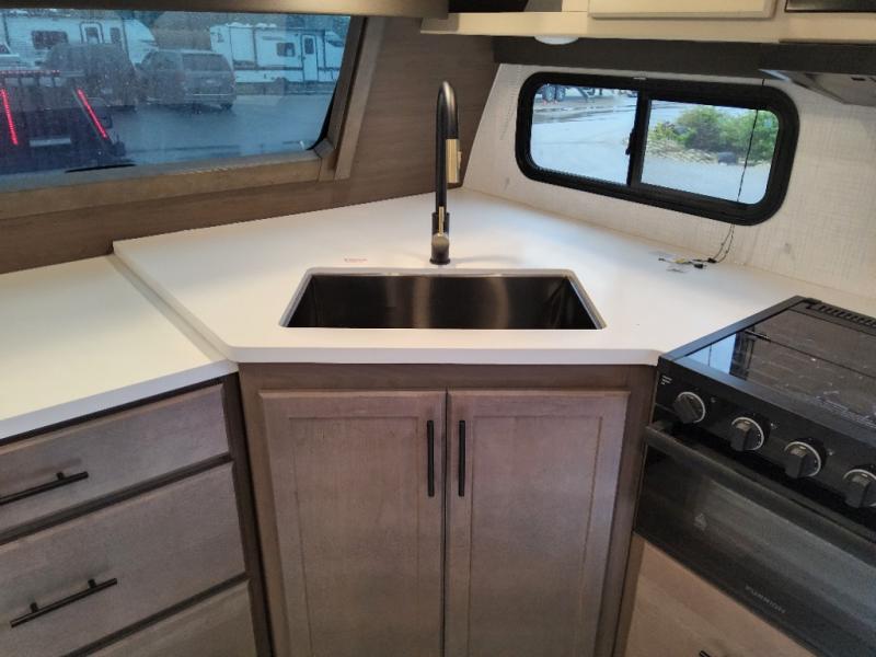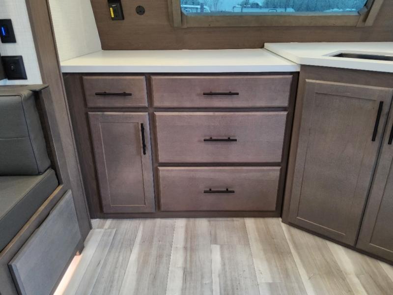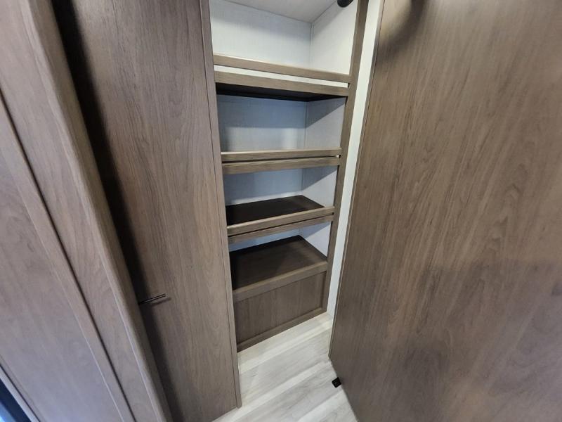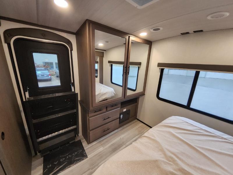 With a queen-size bed and a king bed option, this Cougar Half-Ton travel trailer shows that you can still be comfortable even while you're away from home! The bed slides out to provide more interior space and there is a wardrobe opposite near the private entry door. The main entry up front leads into a spacious combined kitchen and living area with the front kitchen offering plenty of counter space and overhead storage. There is a 12-volt refrigerator to the left of the entry door, and access to a walk-in pantry is right around the corner from the pivoting entertainment center opposite a tri-fold sofa sleeper and booth dinette slide. This unit also features a full-width walk-thru bath giving you plenty of room to shower and change.