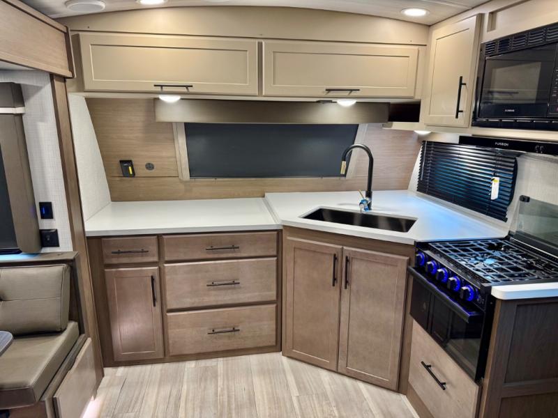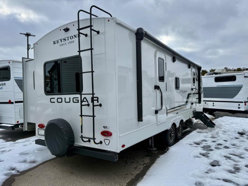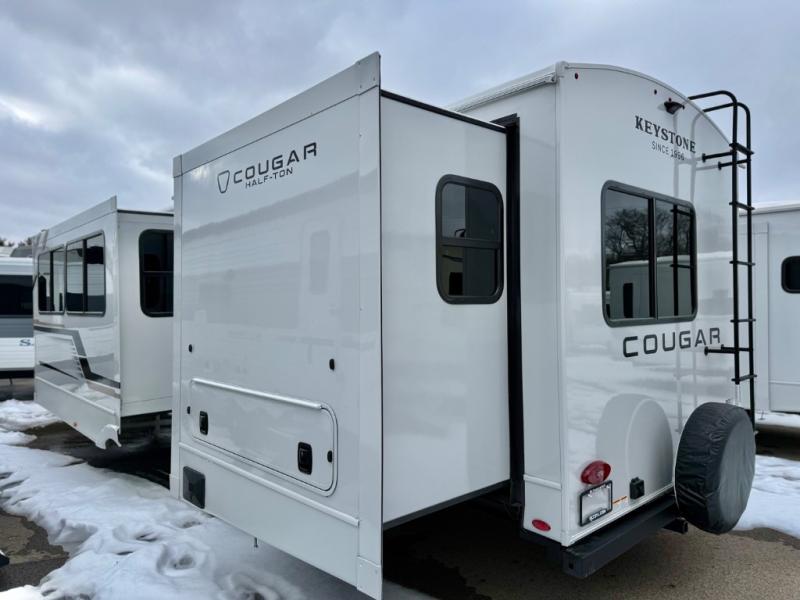 The Keystone Cougar Half-Ton fifth wheel and travel trailers are known as one of America's favorites for a reason! Some of those reasons are the exclusive features that come from Keystone, like the Winegard Air 360+ omni-directional rooftop antenna, the in-floor heating ducts, and the HyperCore composite wall construction with Vixen Fibrogloss high-gloss finish. The Cougar Half-Ton has a Climate Guard protection package with heat-deflecting white sidewalls, two roof attic vents, PEX plumbing and more to enjoy four season camping. Inside, you'll love the dimmable lighting, night roller shades throughout, shower skylight, and bedside USB outlets to keep your electronics charged.