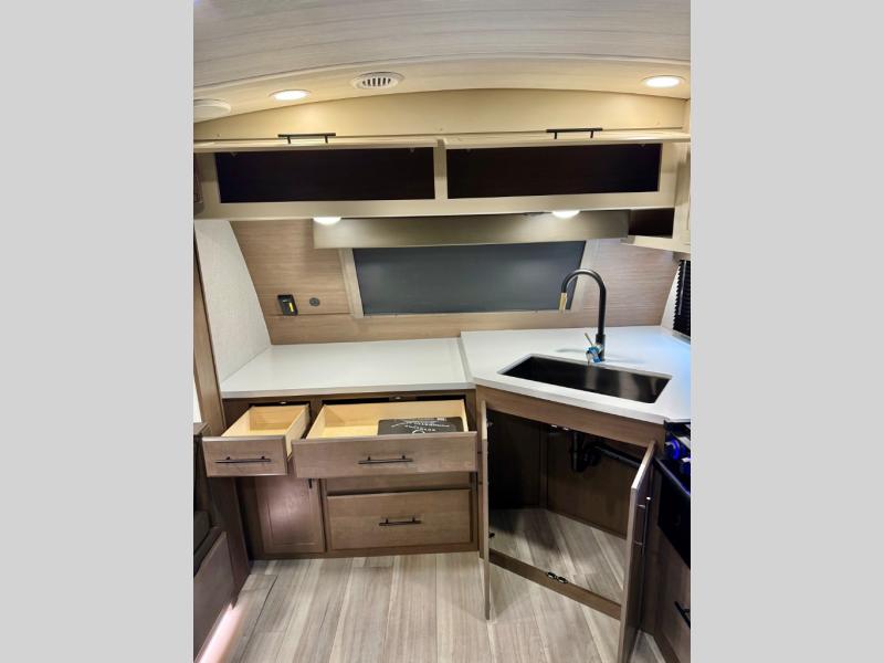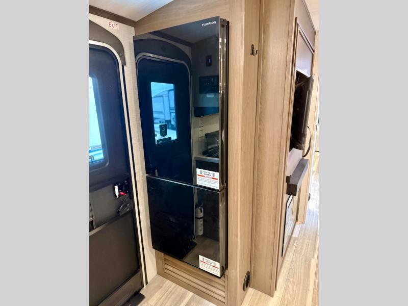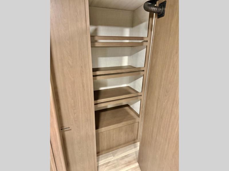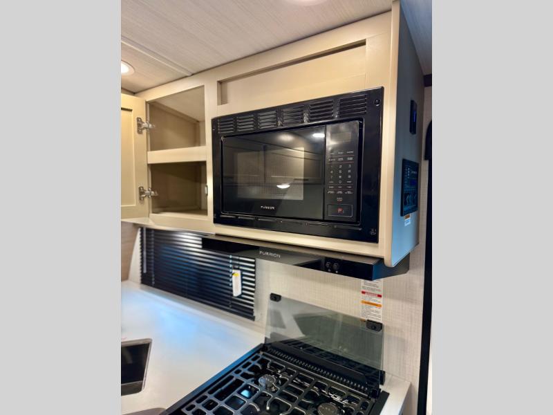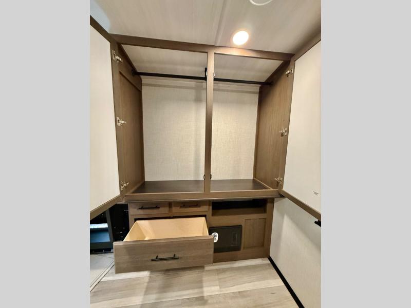 With a queen-size bed and a king bed option, this Cougar Half-Ton travel trailer shows that you can still be comfortable even while you're away from home! The bed slides out to provide more interior space and there is a wardrobe opposite near the private entry door. The main entry up front leads into a spacious combined kitchen and living area with the front kitchen offering plenty of counter space and overhead storage. There is a 12-volt refrigerator to the left of the entry door, and access to a walk-in pantry is right around the corner from the pivoting entertainment center opposite a tri-fold sofa sleeper and booth dinette slide. This unit also features a full-width walk-thru bath giving you plenty of room to shower and change.