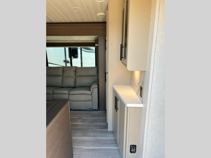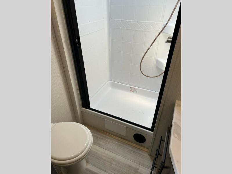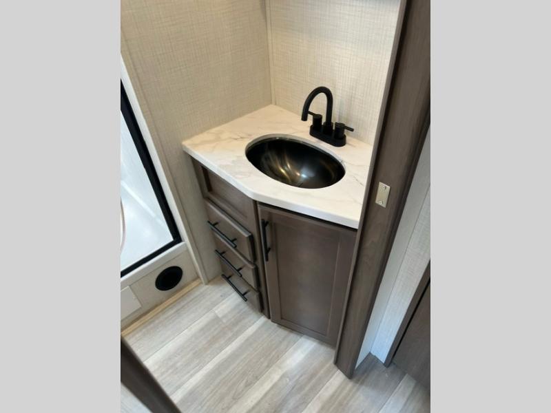 If you're ready for fun summers at the lake, make your adventures complete with this travel trailer in tow. The rear kitchen includes ample counter space to prep burgers, and you can take your preparations outside with the outdoor kitchen prep area. If the weather is nice, you might just want to eat outside too under the 18' power awning, or dine inside at the booth dinette. There is also a tri-fold sleeper sofa within the large slide out and an LED HDTV for movie nights. You'll find plenty of storage throughout, including a kitchen pantry, overhead cabinets, plus dual bedroom nighstands on either side of the king bed!