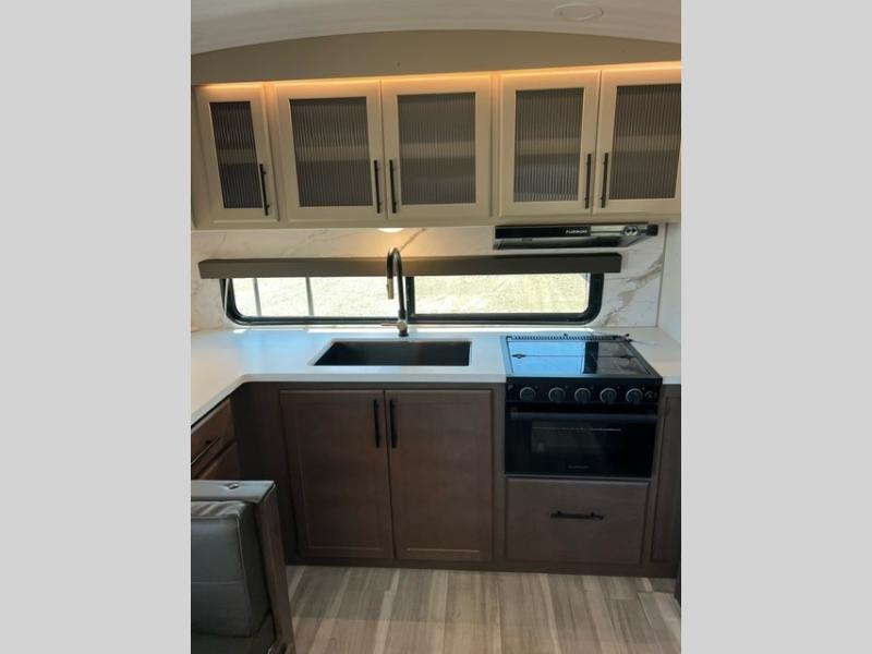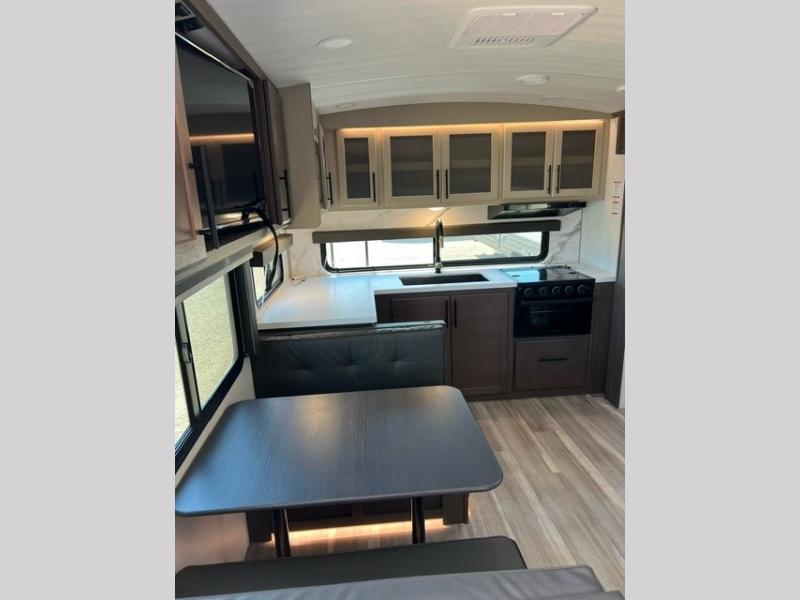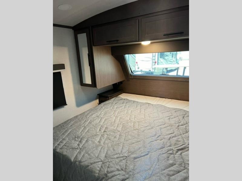 If you're ready for fun summers at the lake, make your adventures complete with this travel trailer in tow. The rear kitchen includes ample counter space to prep burgers, and you can take your preparations outside with the outdoor kitchen prep area. If the weather is nice, you might just want to eat outside too under the 18' power awning, or dine inside at the booth dinette. There is also a tri-fold sleeper sofa within the large slide out and an LED HDTV for movie nights. You'll find plenty of storage throughout, including a kitchen pantry, overhead cabinets, plus dual bedroom nightstands on either side of the king bed!