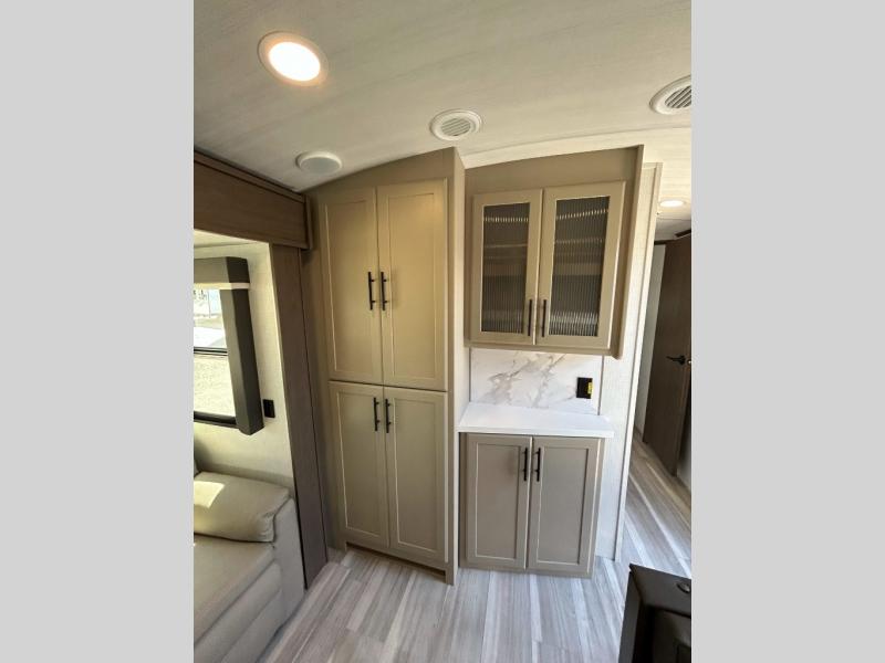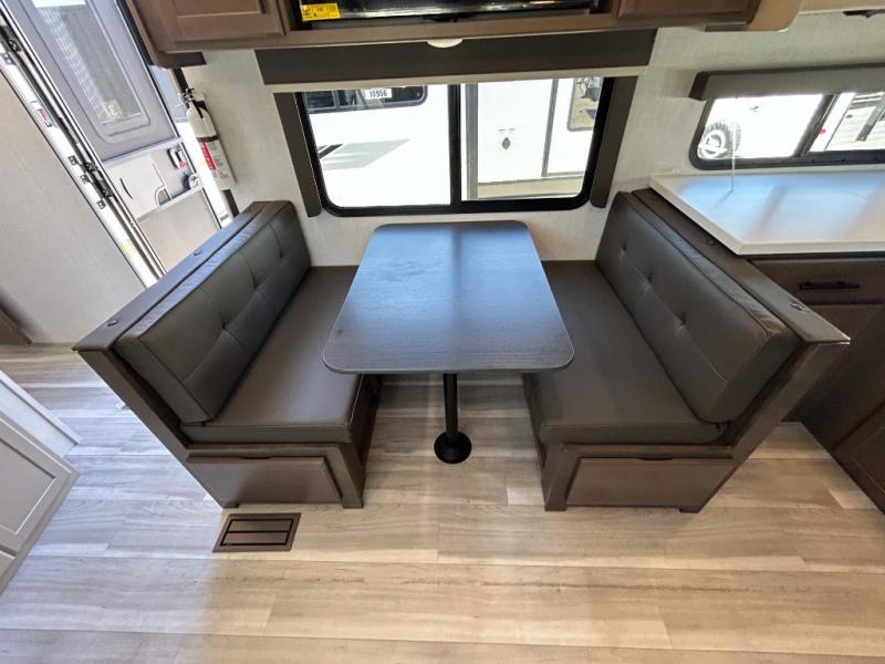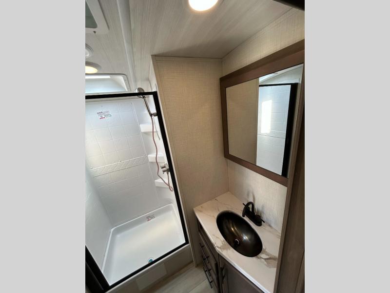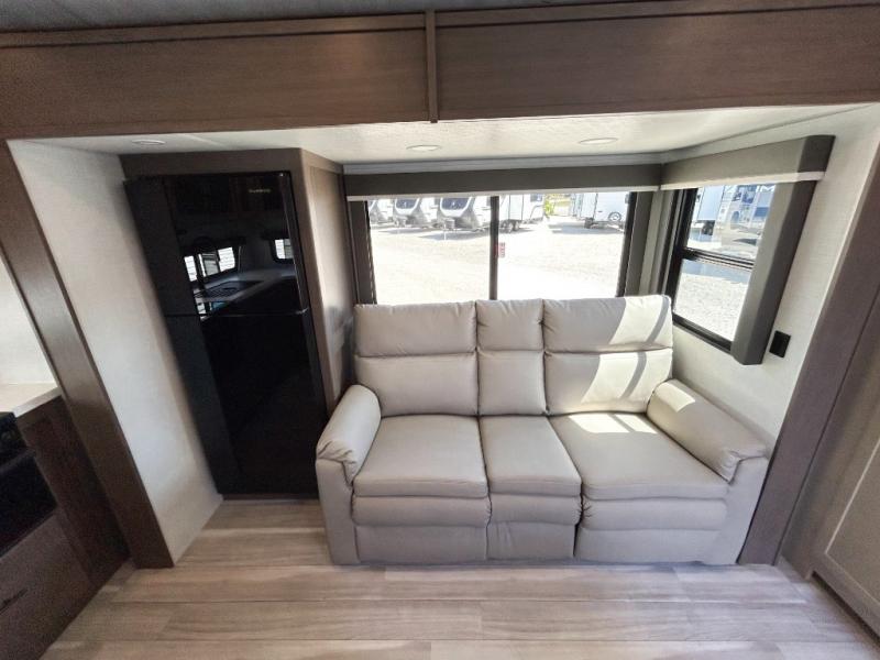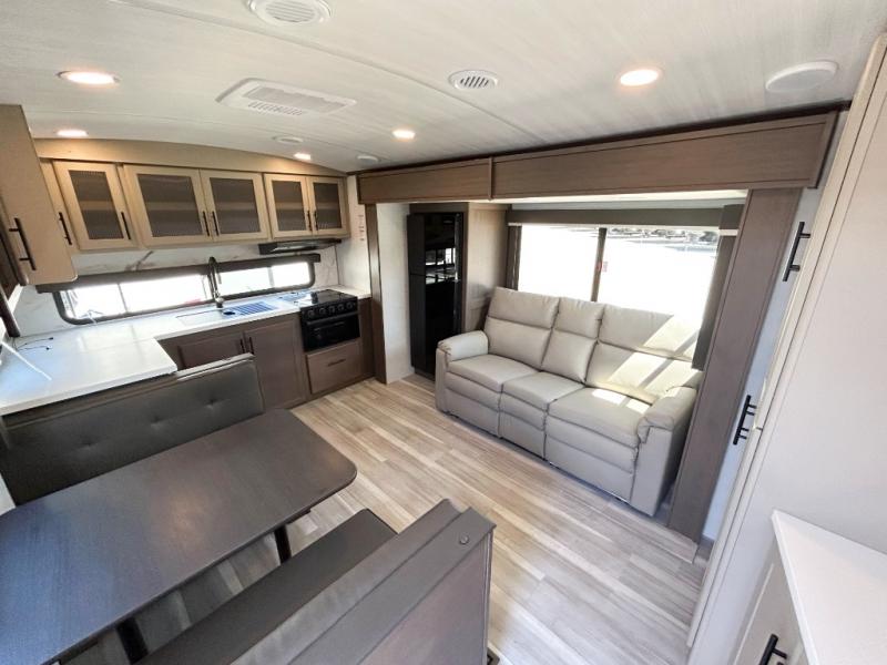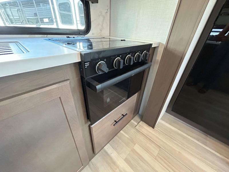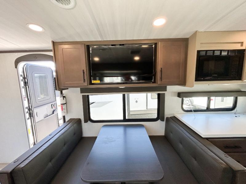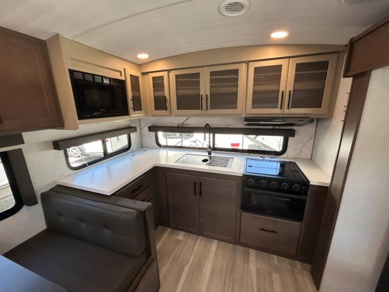 If you're ready for fun summers at the lake, make your adventures complete with this travel trailer in tow. The rear kitchen includes ample counter space to prep burgers, and you can take your preparations outside with the outdoor kitchen prep area. If the weather is nice, you might just want to eat outside too under the 18' power awning, or dine inside at the booth dinette. There is also a tri-fold sleeper sofa within the large slide out and an LED HDTV for movie nights. You'll find plenty of storage throughout, including a kitchen pantry, overhead cabinets, plus dual bedroom nighstands on either side of the king bed!