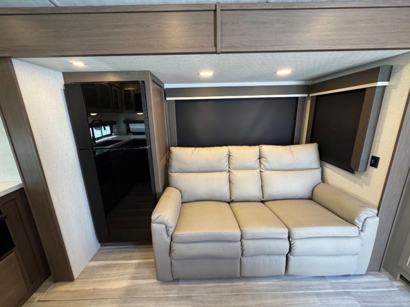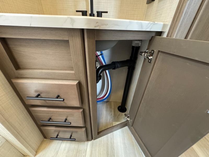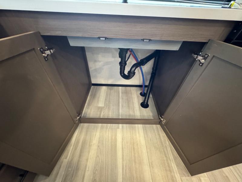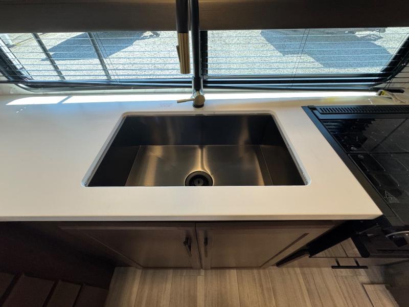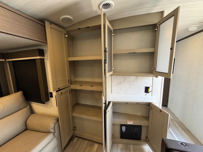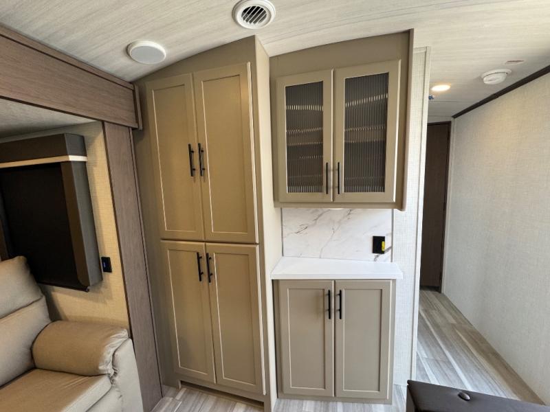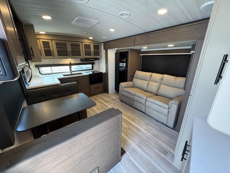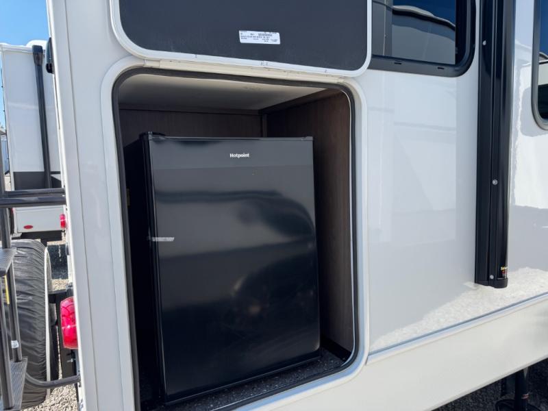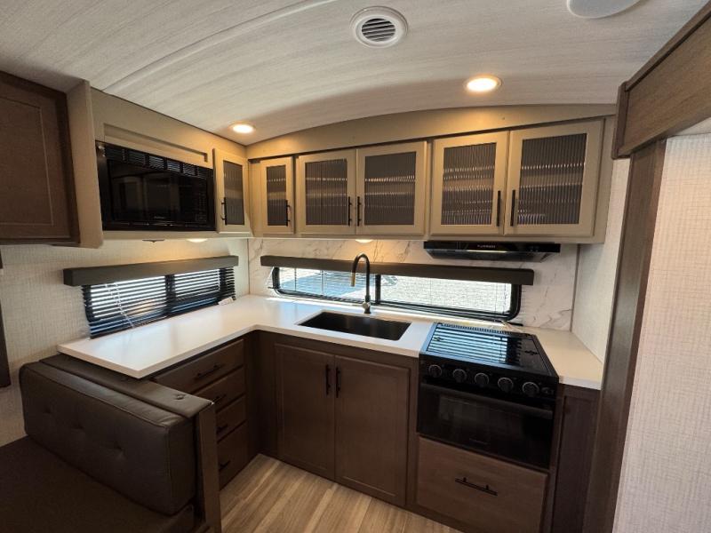 If you're ready for fun summers at the lake, make your adventures complete with this travel trailer in tow. The rear kitchen includes ample counter space to prep burgers, and you can take your preparations outside with the outdoor kitchen prep area. If the weather is nice, you might just want to eat outside too under the 18' power awning, or dine inside at the booth dinette. There is also a tri-fold sleeper sofa within the large slide out and an LED HDTV for movie nights. You'll find plenty of storage throughout, including a kitchen pantry, overhead cabinets, plus dual bedroom nighstands on either side of the king bed!