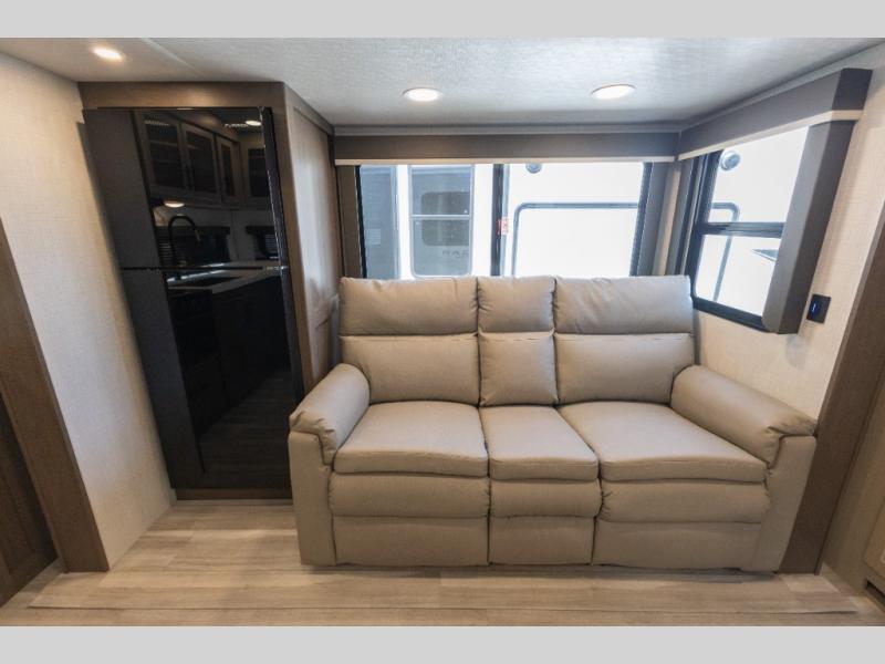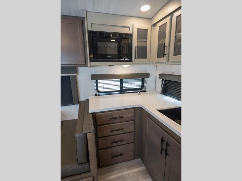 If you're ready for fun summers at the lake, make your adventures complete with this travel trailer in tow. The rear kitchen includes ample counter space to prep burgers, and you can take your preparations outside with the outdoor kitchen prep area. If the weather is nice, you might just want to eat outside too under the 18' power awning, or dine inside at the booth dinette. There is also a tri-fold sleeper sofa within the large slide out and an LED HDTV for movie nights. You'll find plenty of storage throughout, including a kitchen pantry, overhead cabinets, plus dual bedroom nighstands on either side of the king bed!