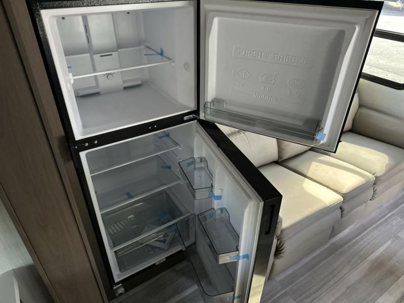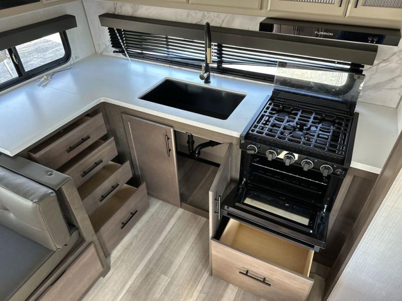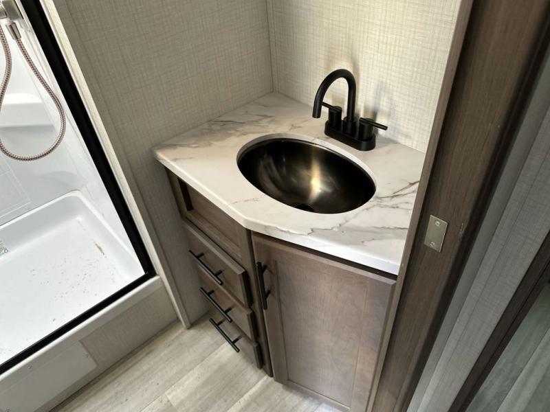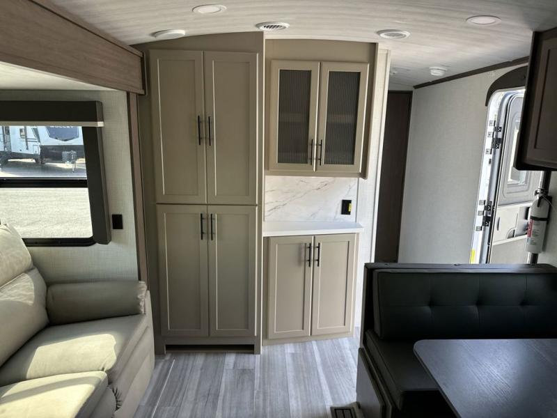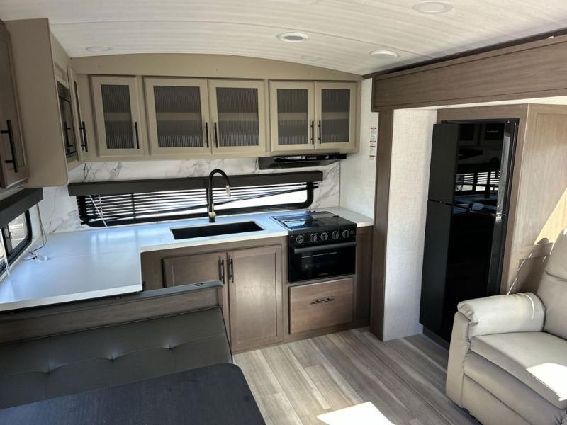 If you're ready for fun summers at the lake, make your adventures complete with this travel trailer in tow. The rear kitchen includes ample counter space to prep burgers, and you can take your preparations outside with the outdoor kitchen prep area. If the weather is nice, you might just want to eat outside too under the 18' power awning, or dine inside at the booth dinette. There is also a tri-fold sleeper sofa within the large slide out and an LED HDTV for movie nights. You'll find plenty of storage throughout, including a kitchen pantry, overhead cabinets, plus dual bedroom nighstands on either side of the king bed!