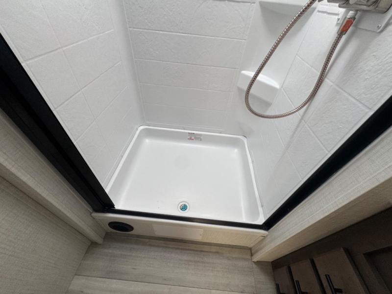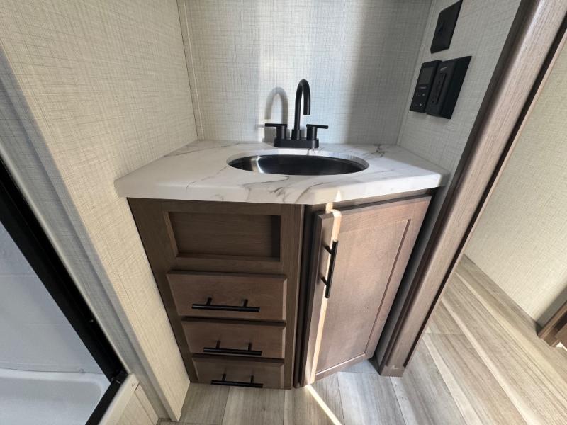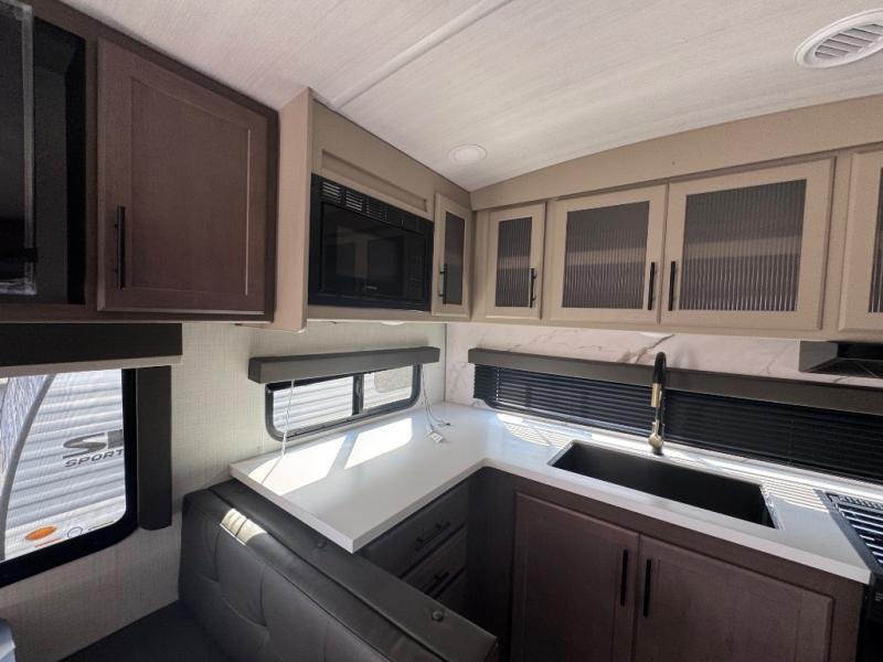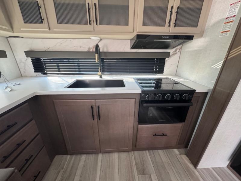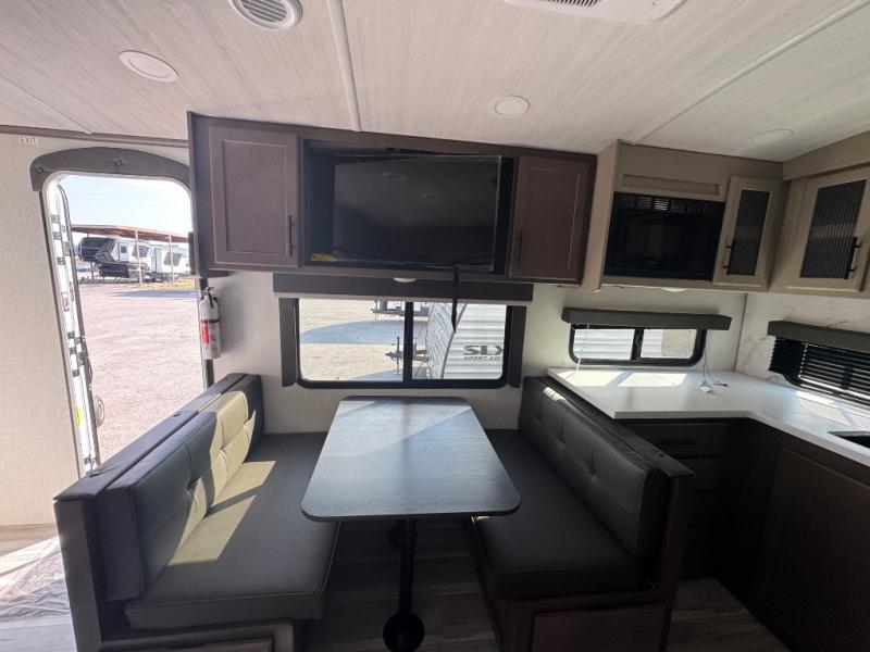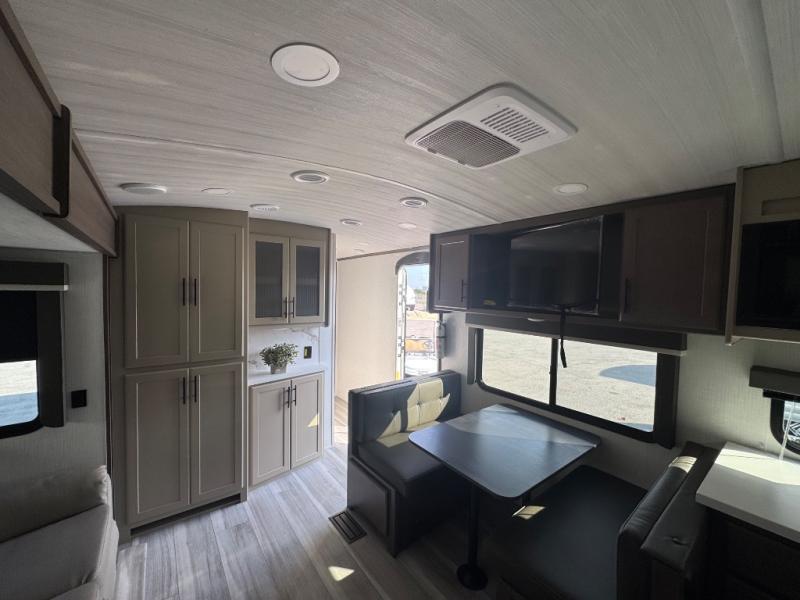 If you're ready for fun summers at the lake, make your adventures complete with this travel trailer in tow. The rear kitchen includes ample counter space to prep burgers, and you can take your preparations outside with the outdoor kitchen prep area. If the weather is nice, you might just want to eat outside too under the 18' power awning, or dine inside at the booth dinette. There is also a tri-fold sleeper sofa within the large slide out and an LED HDTV for movie nights. You'll find plenty of storage throughout, including a kitchen pantry, overhead cabinets, plus dual bedroom nighstands on either side of the king bed!