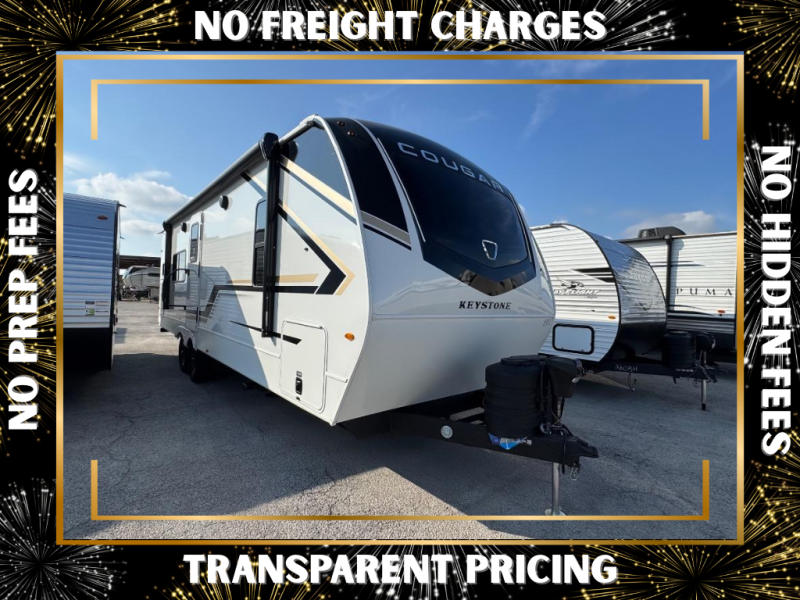 The Keystone Cougar Half-Ton fifth wheel and travel trailers are known as one of America's favorites for a reason! Some of those reasons are the exclusive features that come from Keystone, like the Winegard Air 360+ omni-directional rooftop antenna, the in-floor heating ducts, and the HyperCore composite wall construction with Vixen Fibrogloss high-gloss finish. The Cougar Half-Ton has a Climate Guard protection package with heat-deflecting white sidewalls, two roof attic vents, PEX plumbing and more to enjoy four season camping. Inside, you'll love the dimmable lighting, night roller shades throughout, shower skylight, and bedside USB outlets to keep your electronics charged.