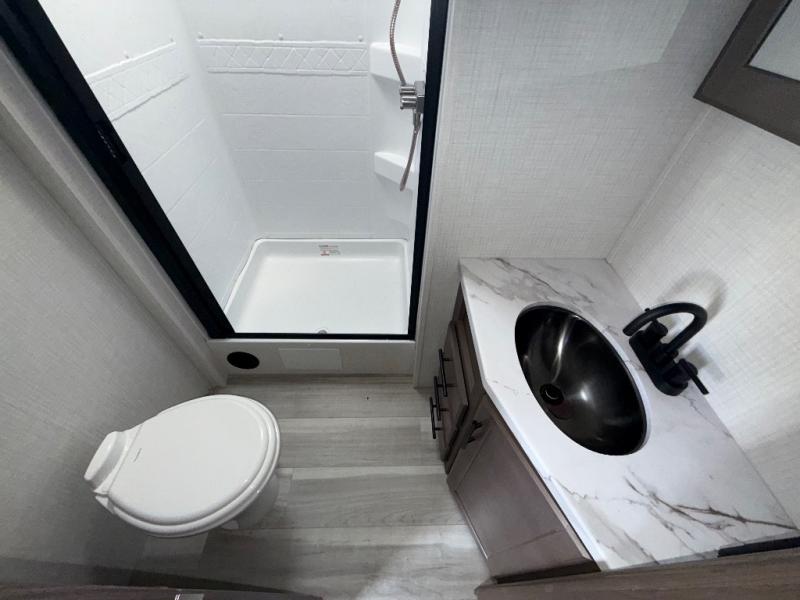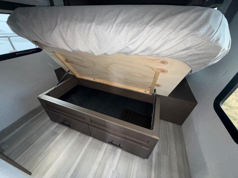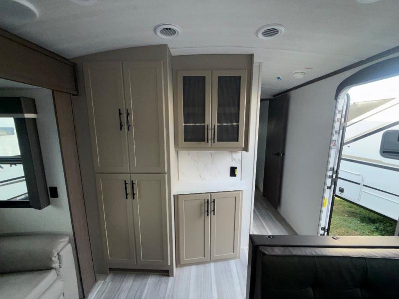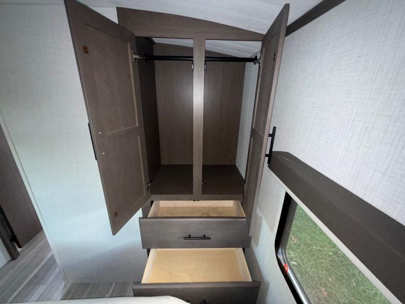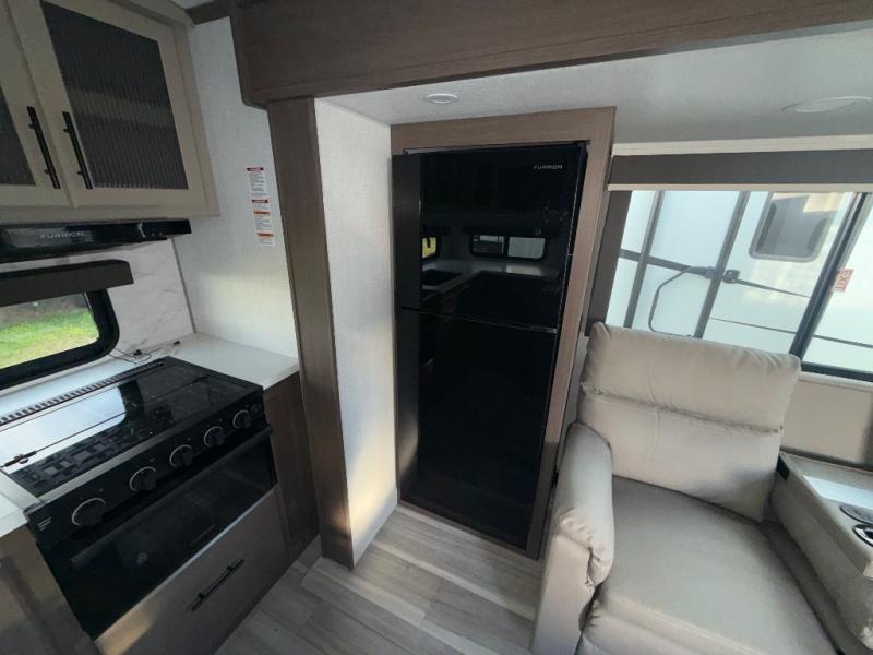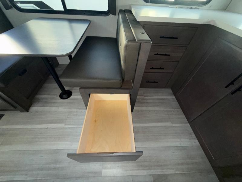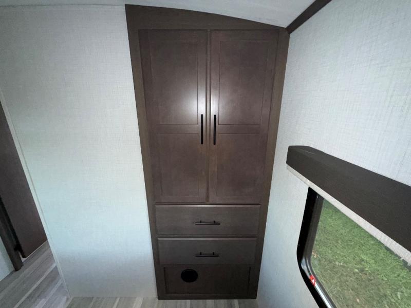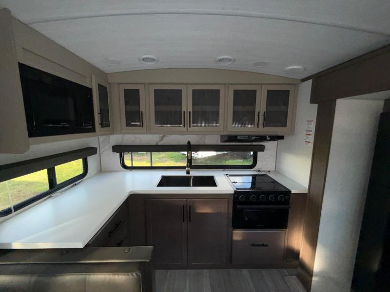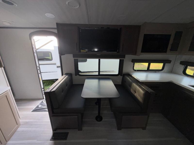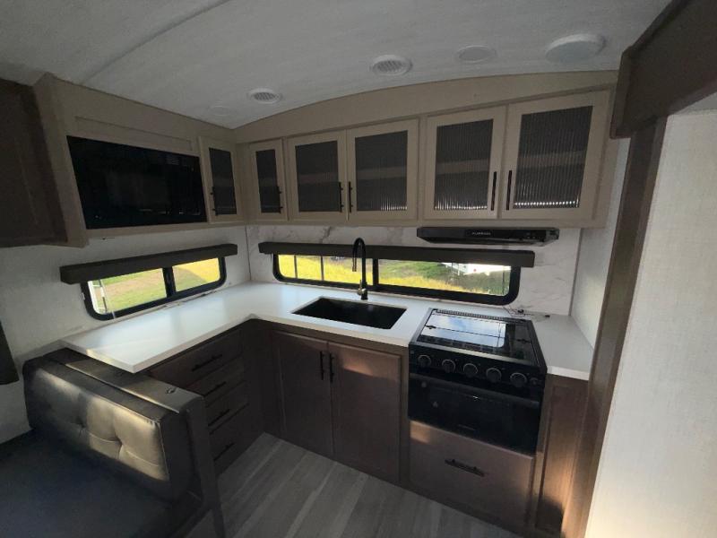 If you're ready for fun summers at the lake, make your adventures complete with this travel trailer in tow. The rear kitchen includes ample counter space to prep burgers, and you can take your preparations outside with the outdoor kitchen prep area. If the weather is nice, you might just want to eat outside too under the 18' power awning, or dine inside at the booth dinette. There is also a tri-fold sleeper sofa within the large slide out and an LED HDTV for movie nights. You'll find plenty of storage throughout, including a kitchen pantry, overhead cabinets, plus dual bedroom nighstands on either side of the king bed!
