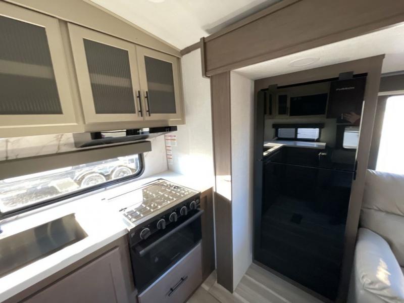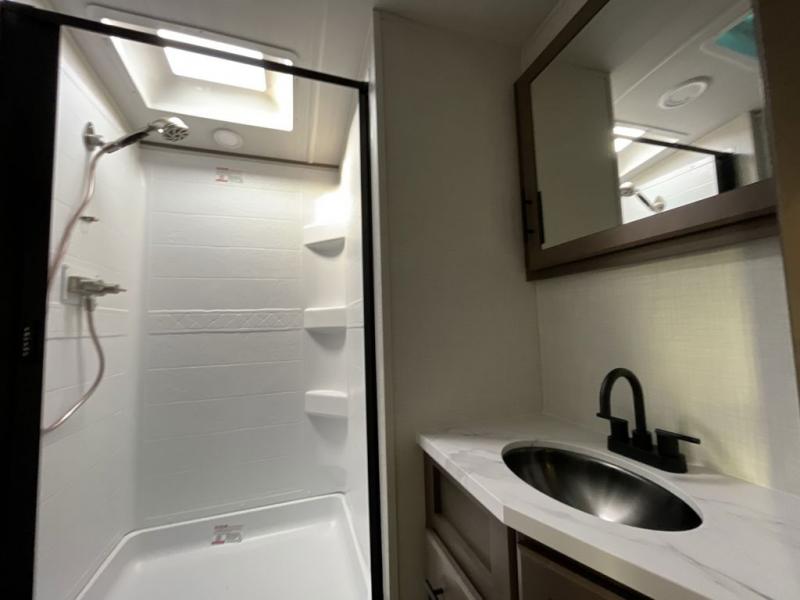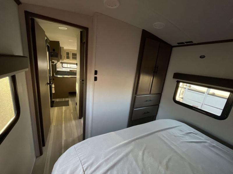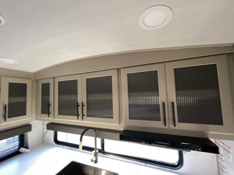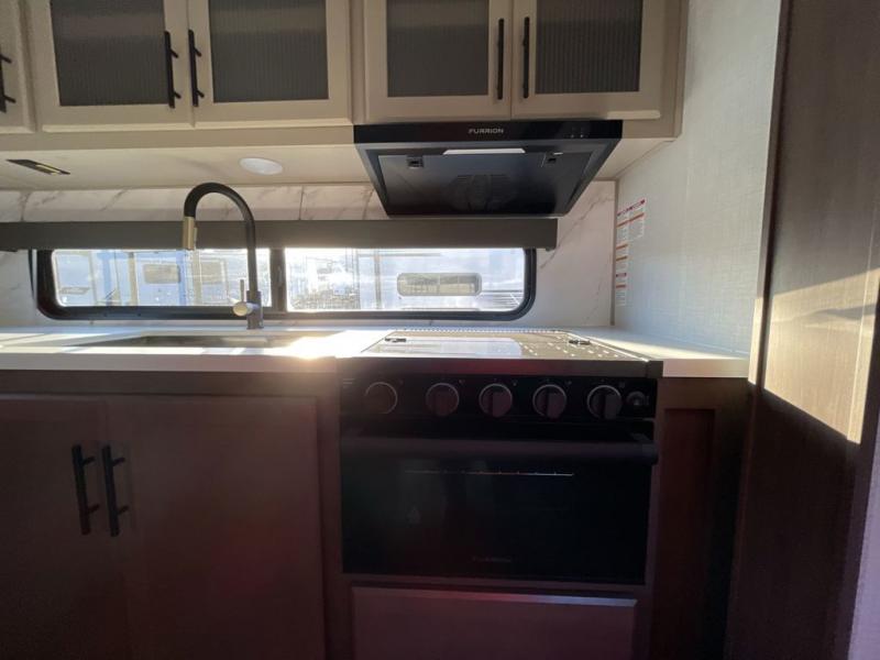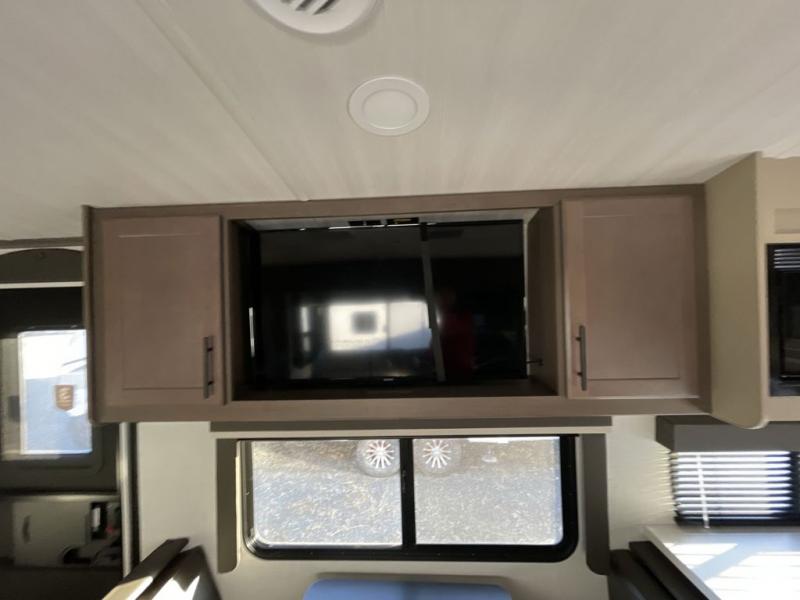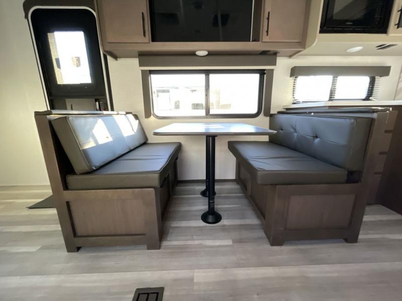 If you're ready for fun summers at the lake, make your adventures complete with this travel trailer in tow. The rear kitchen includes ample counter space to prep burgers, and you can take your preparations outside with the outdoor kitchen prep area. If the weather is nice, you might just want to eat outside too under the 18' power awning, or dine inside at the booth dinette. There is also a tri-fold sleeper sofa within the large slide out and an LED HDTV for movie nights. You'll find plenty of storage throughout, including a kitchen pantry, overhead cabinets, plus dual bedroom nightstands on either side of the king bed!