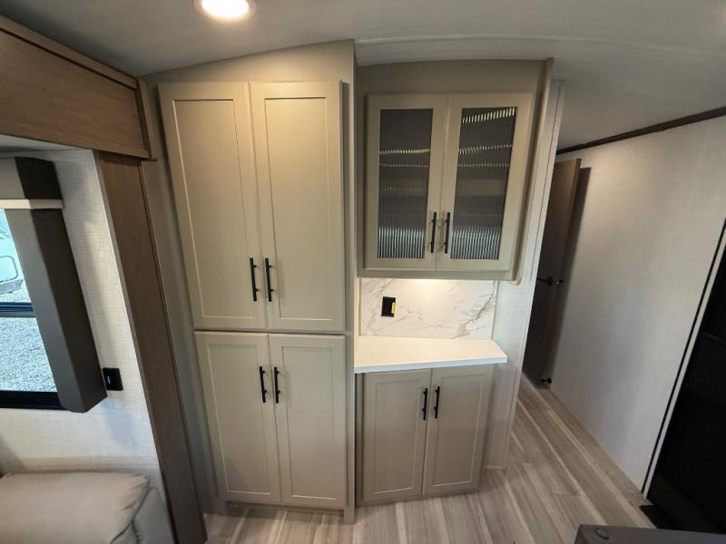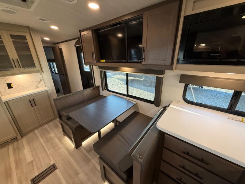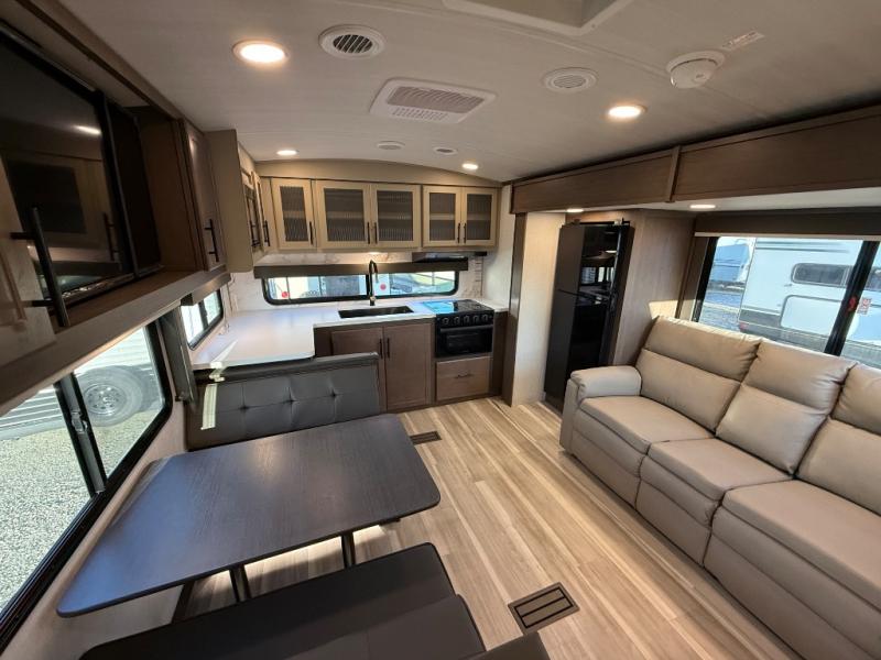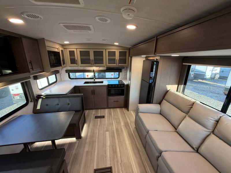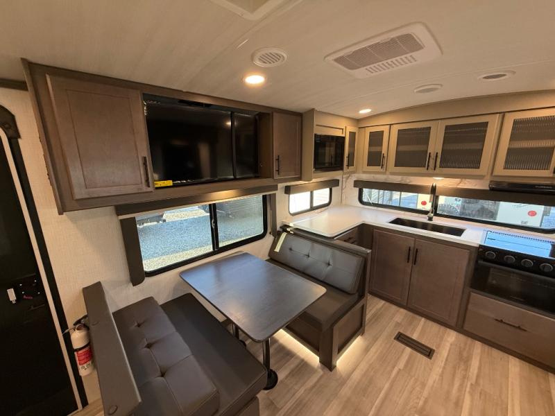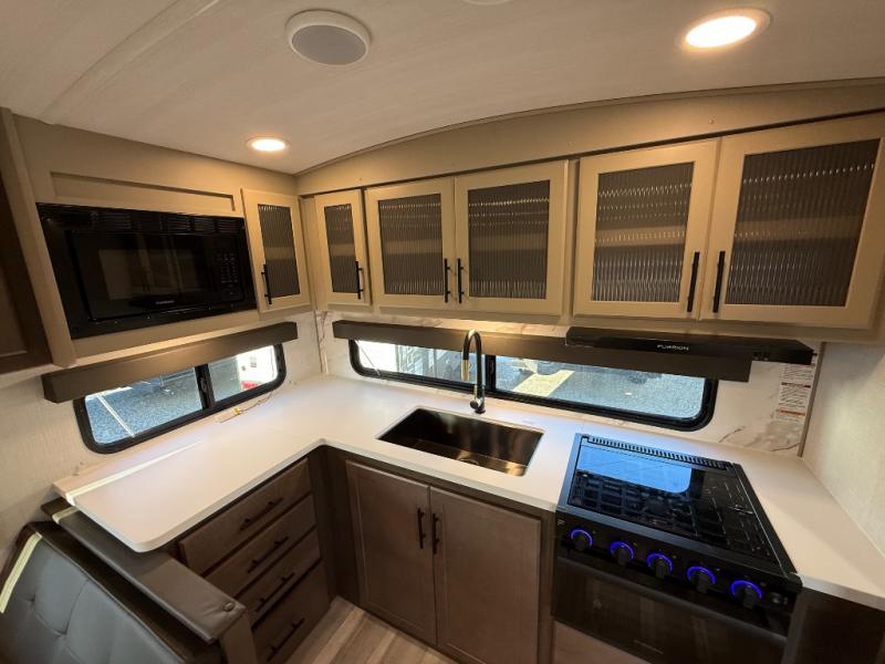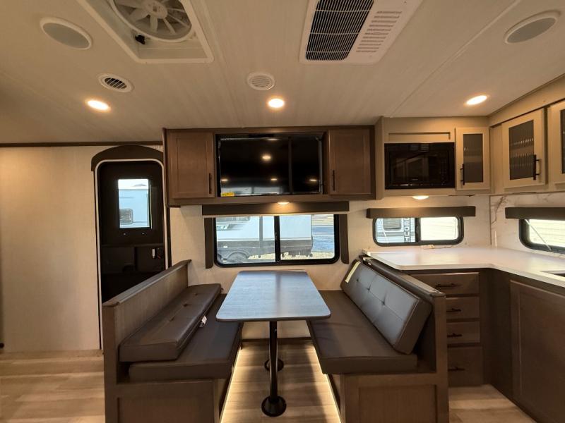 If you're ready for fun summers at the lake, make your adventures complete with this travel trailer in tow. The rear kitchen includes ample counter space to prep burgers, and you can take your preparations outside with the outdoor kitchen prep area. If the weather is nice, you might just want to eat outside too under the 18' power awning, or dine inside at the booth dinette. There is also a tri-fold sleeper sofa within the large slide out and an LED HDTV for movie nights. You'll find plenty of storage throughout, including a kitchen pantry, overhead cabinets, plus dual bedroom nightstands on either side of the king bed!