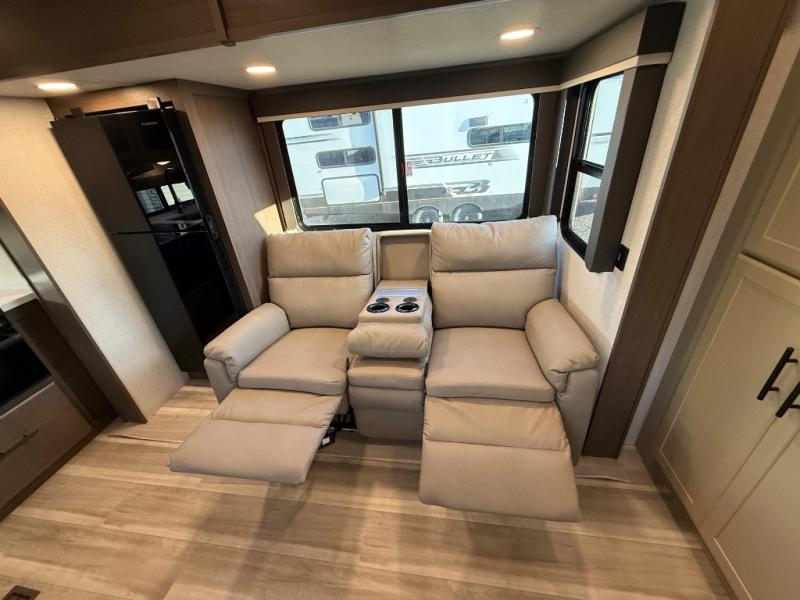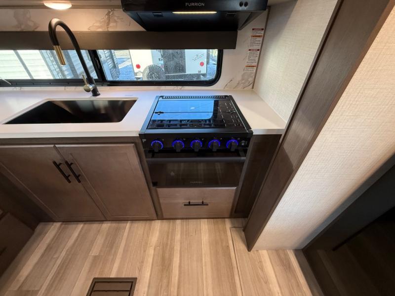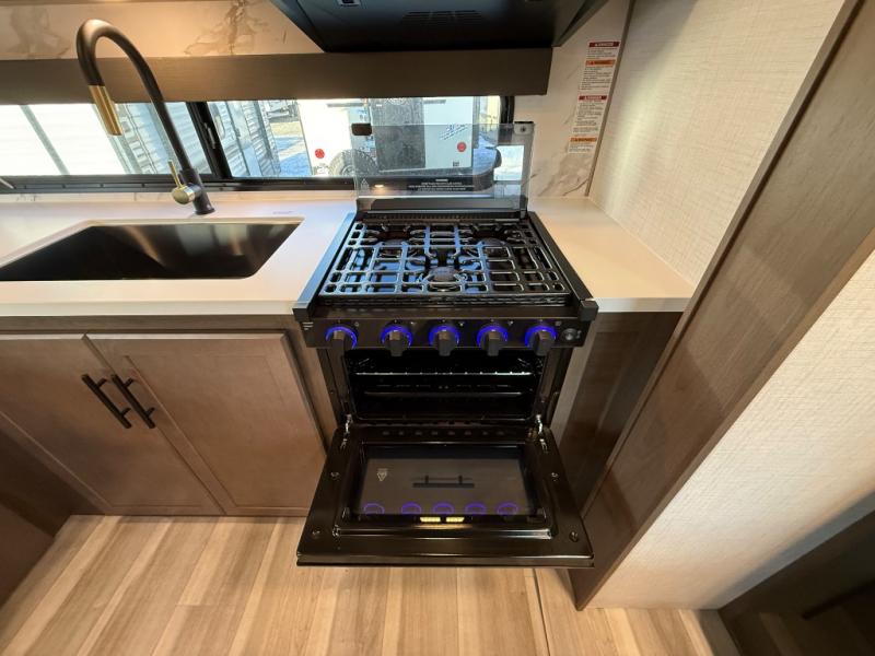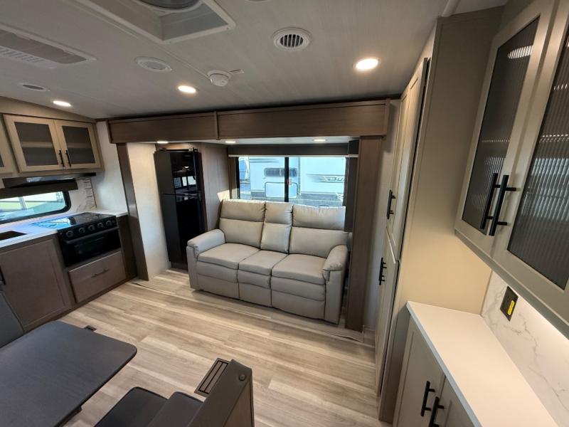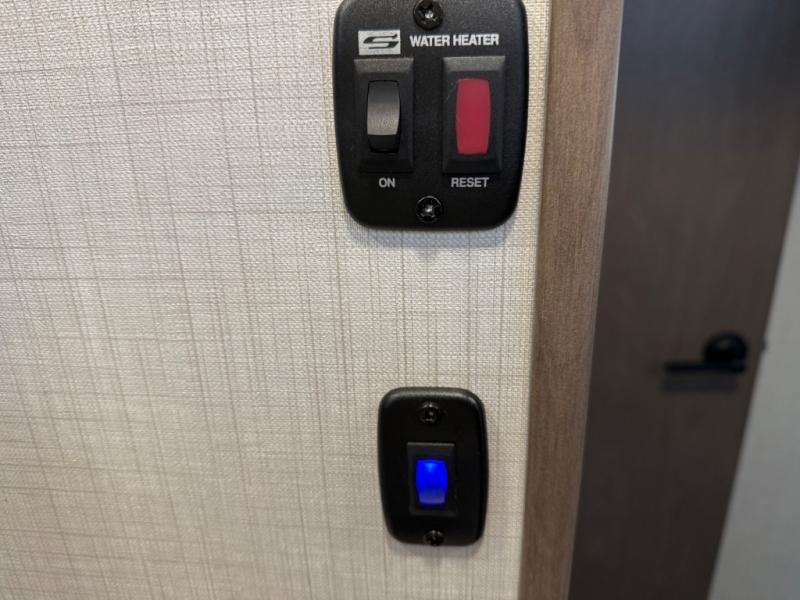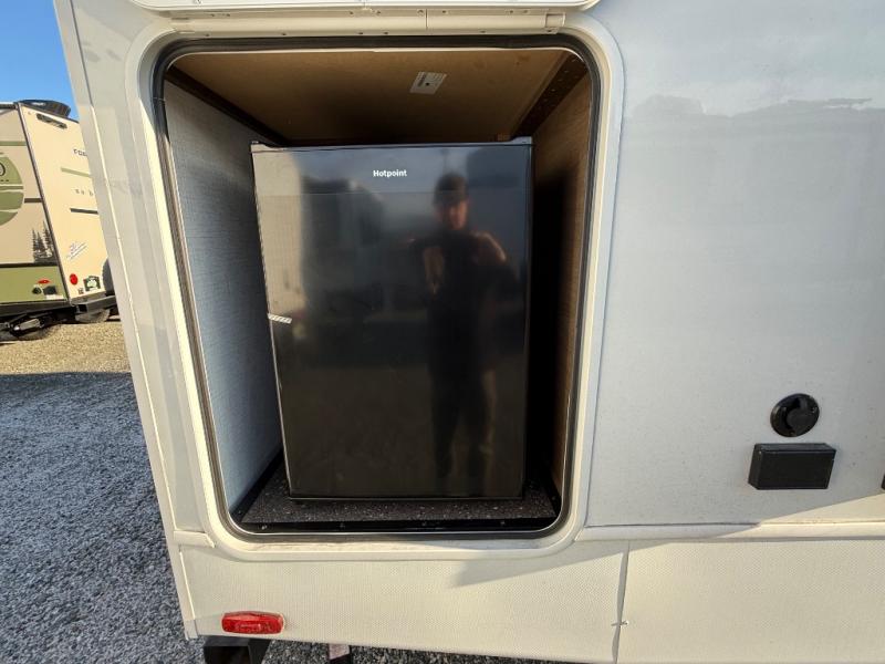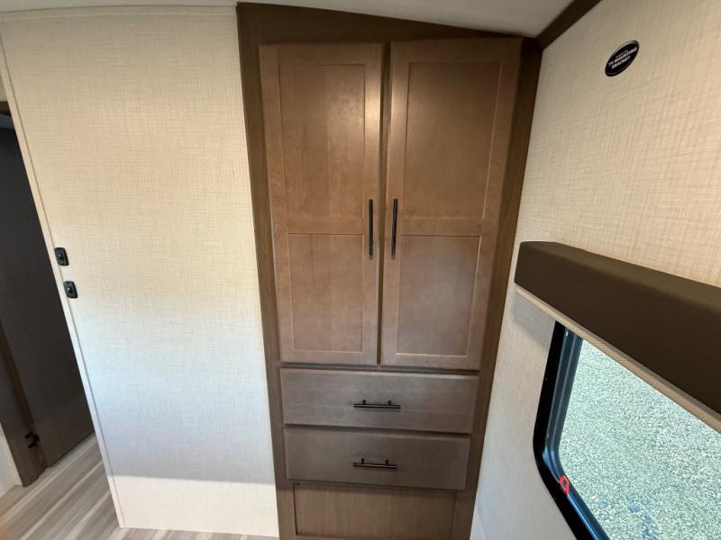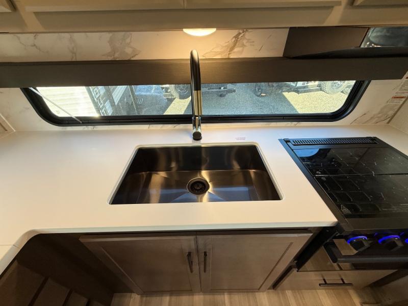 If you're ready for fun summers at the lake, make your adventures complete with this travel trailer in tow. The rear kitchen includes ample counter space to prep burgers, and you can take your preparations outside with the outdoor kitchen prep area. If the weather is nice, you might just want to eat outside too under the 18' power awning, or dine inside at the booth dinette. There is also a tri-fold sleeper sofa within the large slide out and an LED HDTV for movie nights. You'll find plenty of storage throughout, including a kitchen pantry, overhead cabinets, plus dual bedroom nightstands on either side of the king bed!