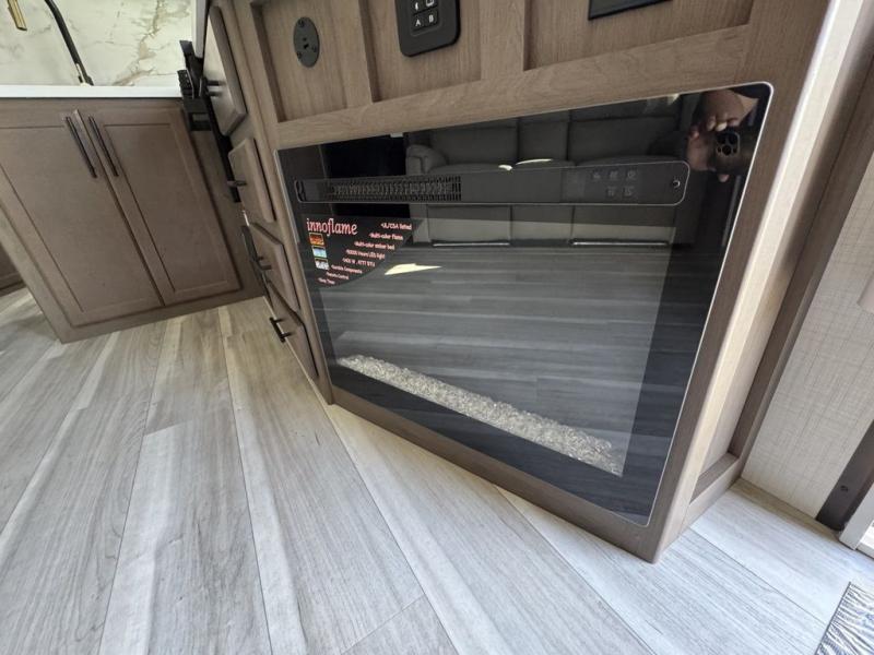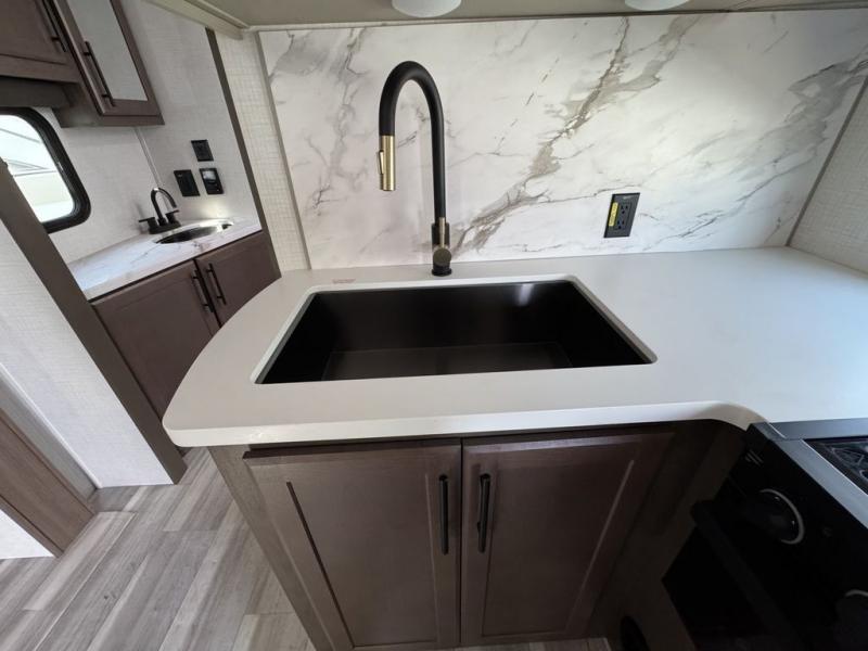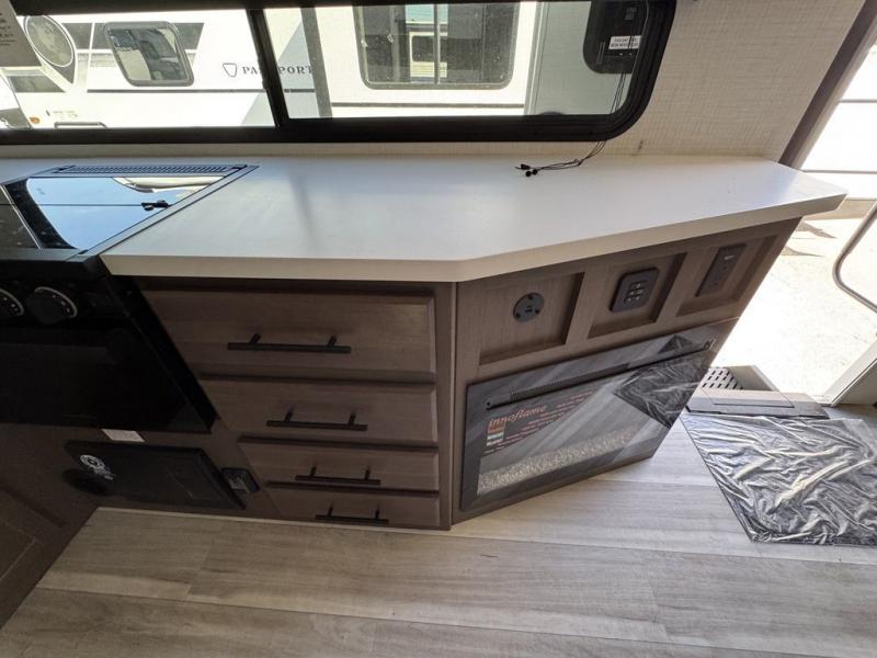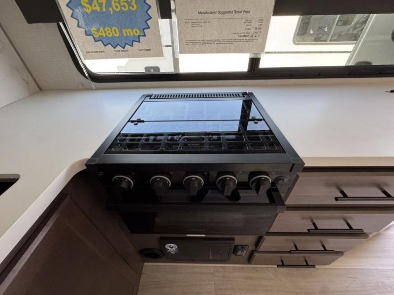 This Cougar Half-Ton travel trailer has an excellent dining area with its huge rear U-shaped dinette! Right next to the dinette is a large slide out that holds the tri-fold sleeper sofa, 12V refrigerator, and a pantry. The kitchen has been excellently appointed with a Furrion range, seamless, pressed countertops, a stainless steel undermount sink, and a microwave, and you will be grateful that you can access both sides of the walk-through bathroom. The private bedroom is ultra convenient with its exterior entrance, king-size bed, and dual storage drawers and dual nightstands.