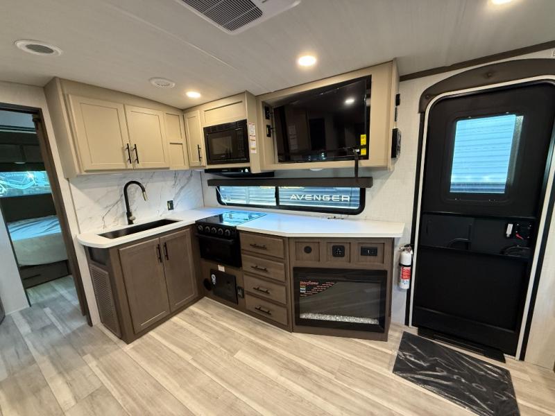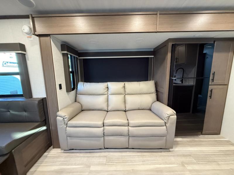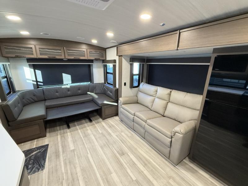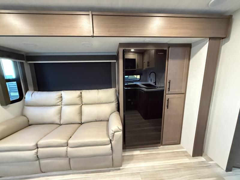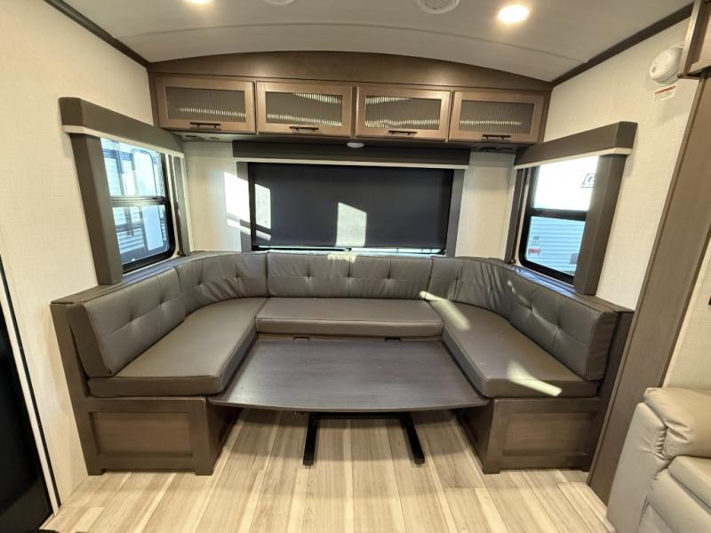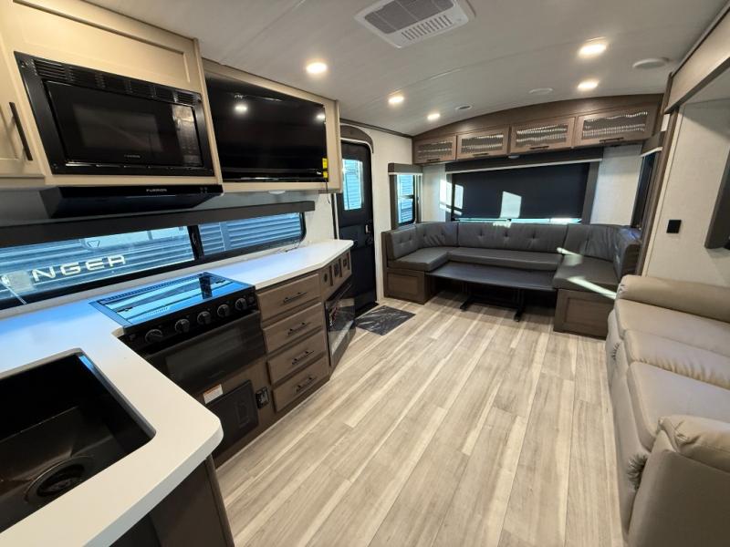 This Cougar Half-Ton travel trailer has an excellent dining area with its huge rear U-shaped dinette! Right next to the dinette is a large slide out that holds the tri-fold sleeper sofa, 12V refrigerator, and a pantry. The kitchen has been excellently appointed with a Furrion range, seamless, pressed countertops, a stainless steel undermount sink, and a microwave, and you will be grateful that you can access both sides of the walk-through bathroom. The private bedroom is ultra convenient with its exterior entrance, king-size bed, and dual storage drawers and dual nightstands.