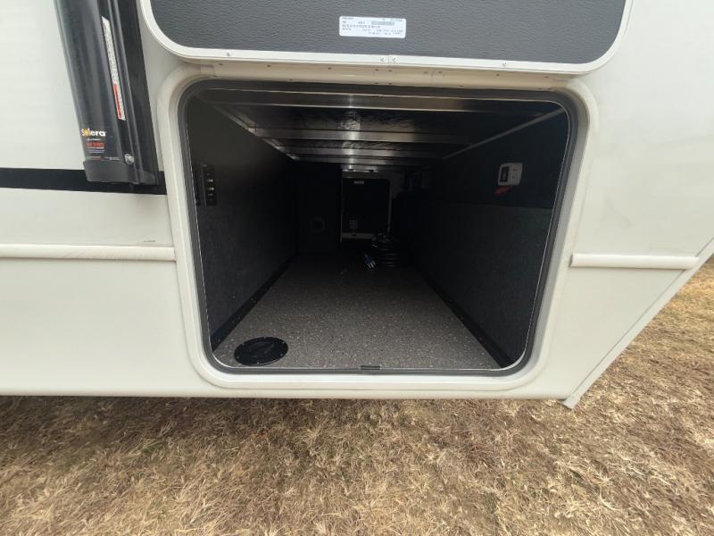 This Cougar Half-Ton travel trailer has an excellent dining area with its huge rear U-shaped dinette! Right next to the dinette is a large slide out that holds the tri-fold sleeper sofa, 12V refrigerator, and a pantry. The kitchen has been excellently appointed with a Furrion range, seamless, pressed countertops, a stainless steel undermount sink, and a microwave, and you will be grateful that you can access both sides of the walk-through bathroom. The private bedroom is ultra convenient with its exterior entrance, king-size bed, and dual storage drawers and dual nightstands.