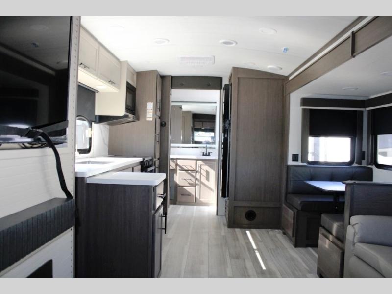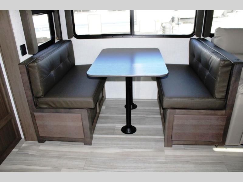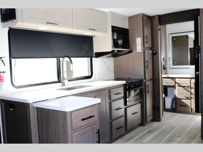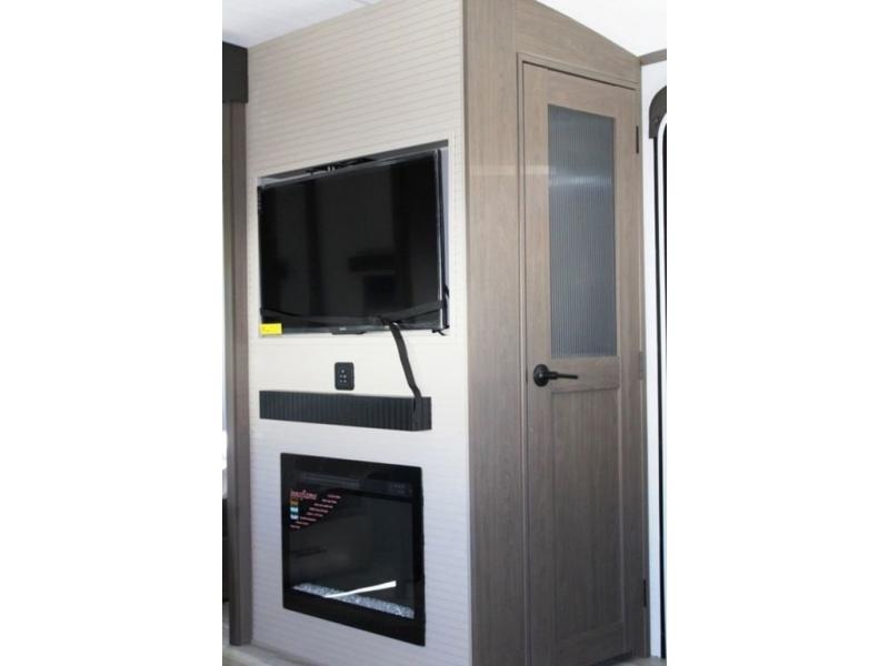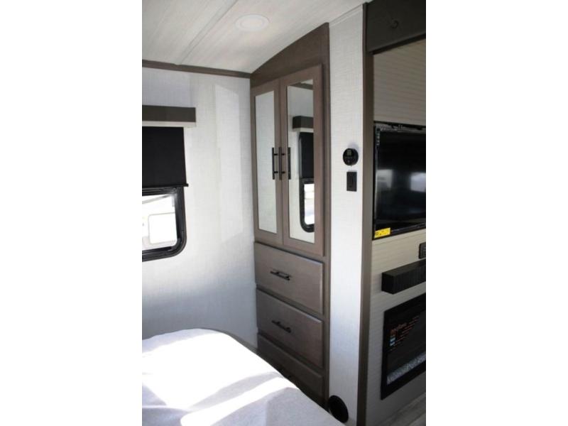Wherever you decide to camp in this travel trailer, you'll be met with comfort and convenience! The full rear bath includes a space saving sliding door, toilet, sink, and linen closet for towels. A large slide out provides more space to move about, and here you'll enjoy the tri-fold sleeper sofa and booth dinette with storage drawers. There is also a fireplace and TV across from the furniture to enjoy movie nights! The chef of your group can make meals on the cooktop or in the microwave, and there is a pull-out countertop for extra counter space. Up front, a private bedroom includes a king bed, dual nightstands, and washer and dryer prep.