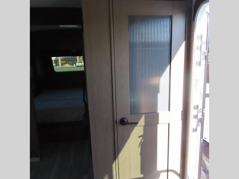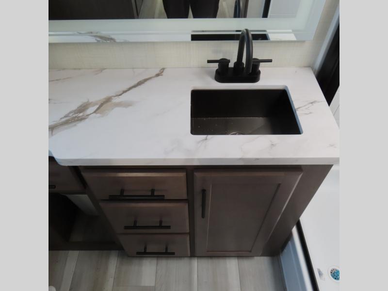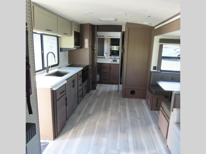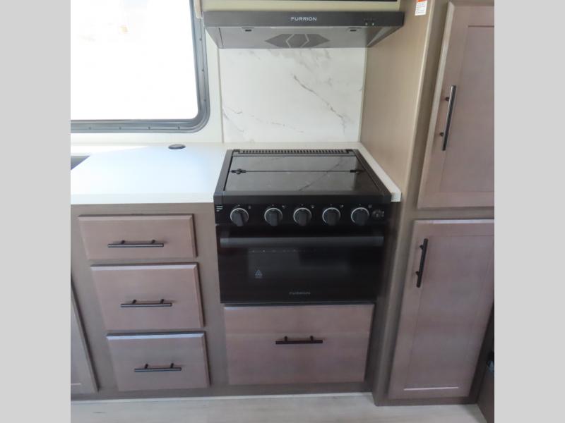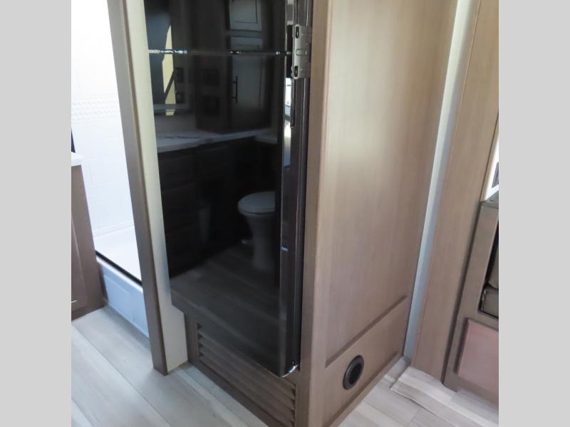 Wherever you decide to camp in this travel trailer, you'll be met with comfort and convenience! The full rear bath includes a space saving sliding door, toilet, sink, and linen closet for towels. A large slide out provides more space to move about, and here you'll enjoy the tri-fold sleeper sofa and booth dinette with storage drawers. There is also a fireplace and TV across from the furniture to enjoy movie nights! The chef of your group can make meals on the cooktop or in the microwave, and there is a pull-out countertop for extra counter space. Up front, a private bedroom includes a king bed, dual nightstands, and washer and dryer prep.