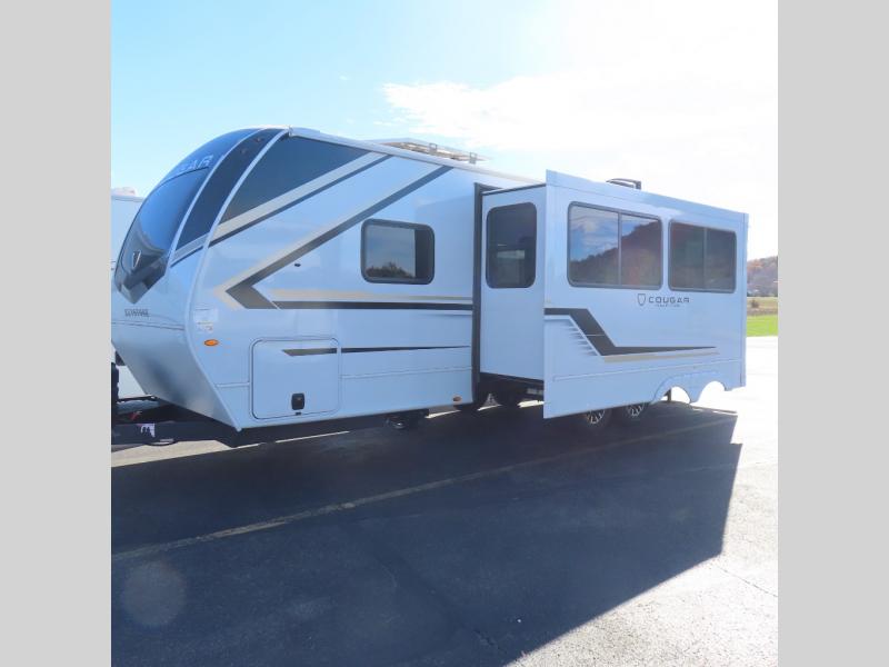 The Keystone Cougar Half-Ton fifth wheel and travel trailers are known as one of America's favorites for a reason! Some of those reasons are the exclusive features that come from Keystone, like the Winegard Air 360+ omni-directional rooftop antenna, the in-floor heating ducts, and the HyperCore composite wall construction with Vixen Fibrogloss high-gloss finish. The Cougar Half-Ton has a Climate Guard protection package with heat-deflecting white sidewalls, two roof attic vents, PEX plumbing and more to enjoy four season camping. Inside, you'll love the dimmable lighting, night roller shades throughout, shower skylight, and bedside USB outlets to keep your electronics charged.