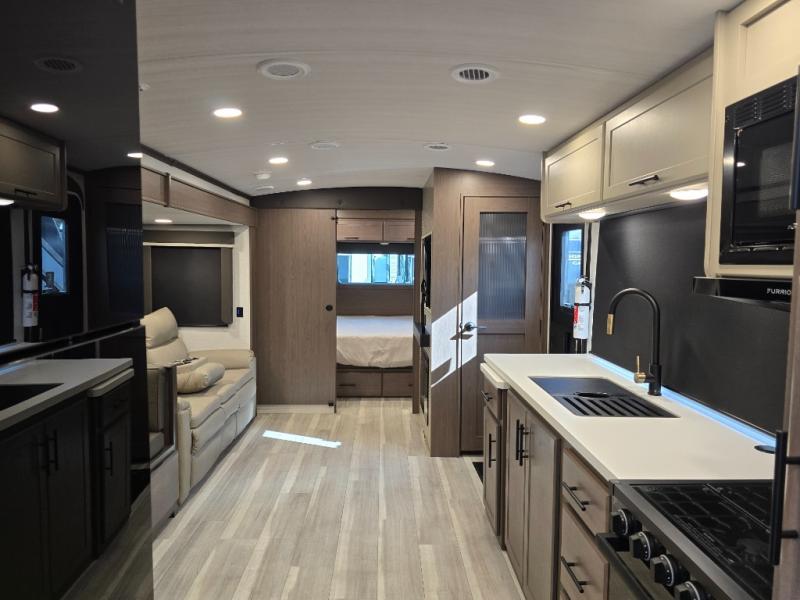 Well-equipped kitchen — solid-surface counters, undermount sink, high-rise faucet, and a booth dinette make meal prep and dining easy on the road.