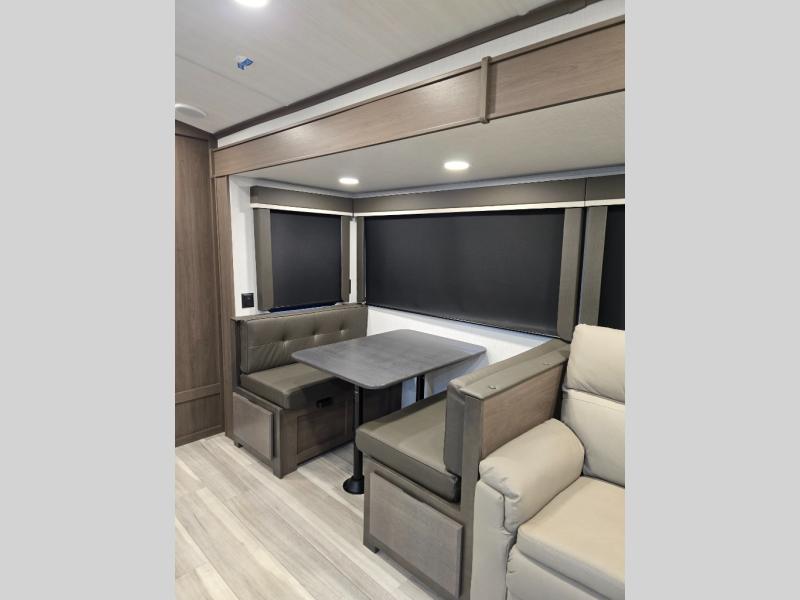 Comfortable living space — theater-style seating (with heat and massage option) paired with a booth dinette gives you flexible, cozy spaces for relaxing, dining, or entertaining.