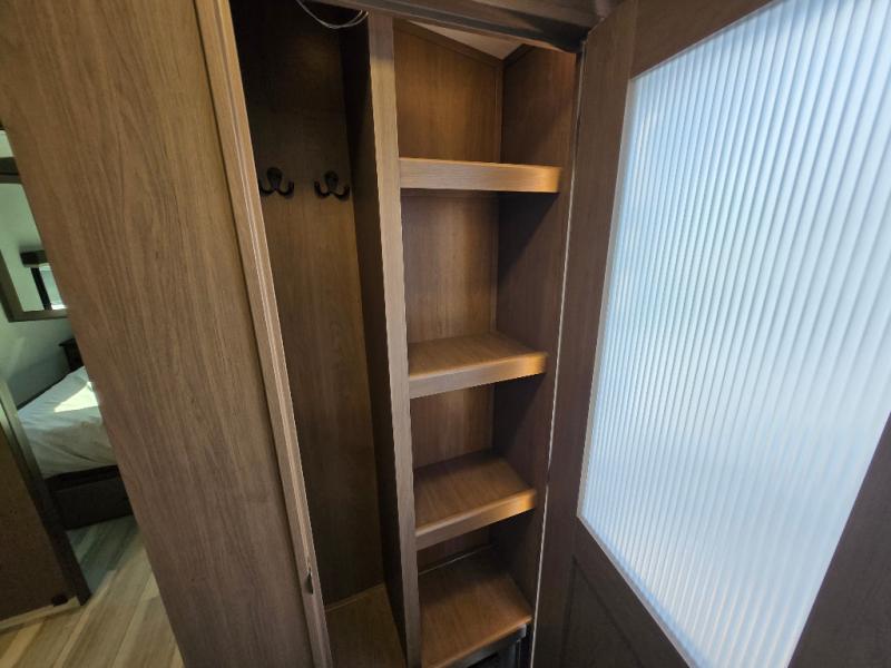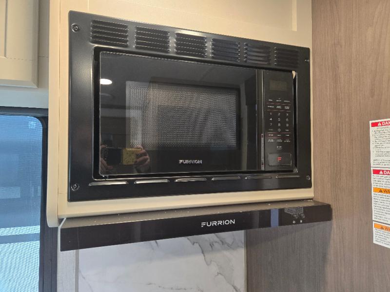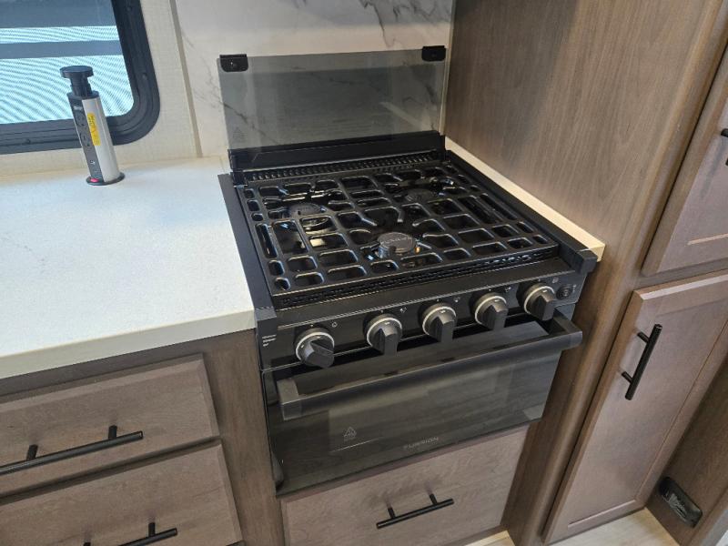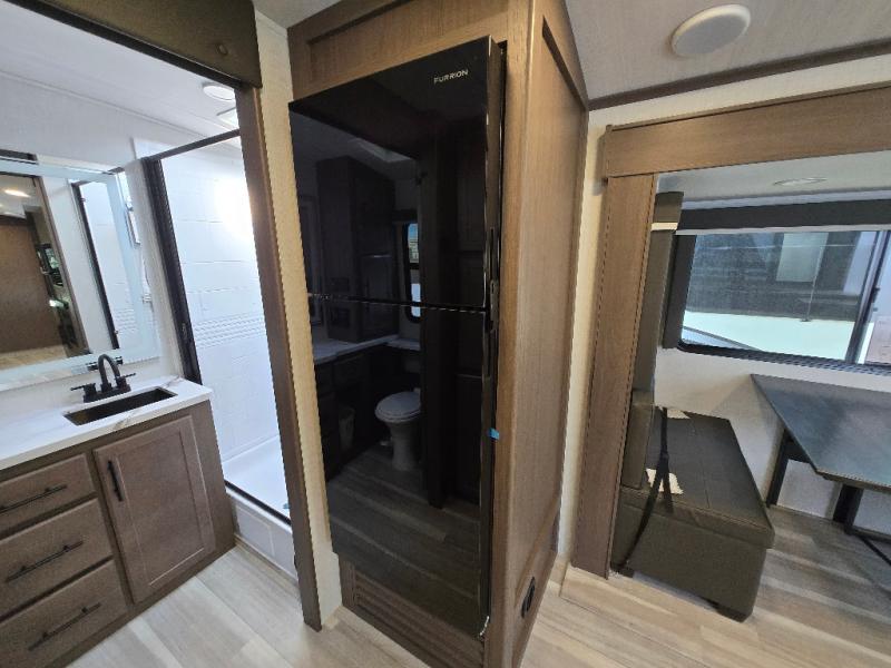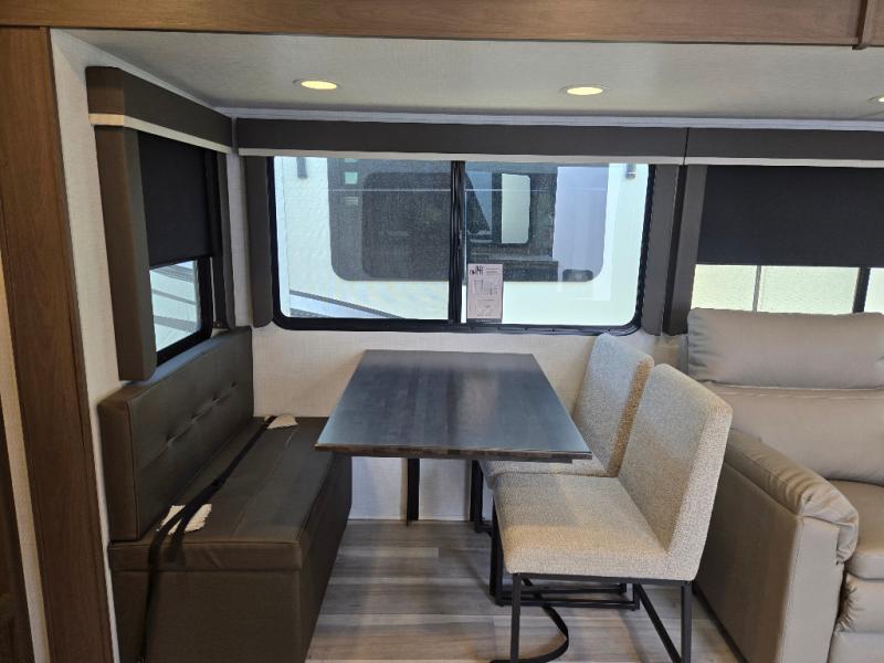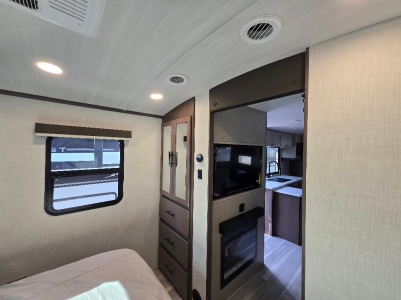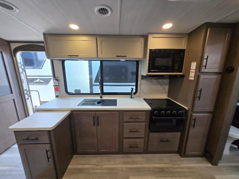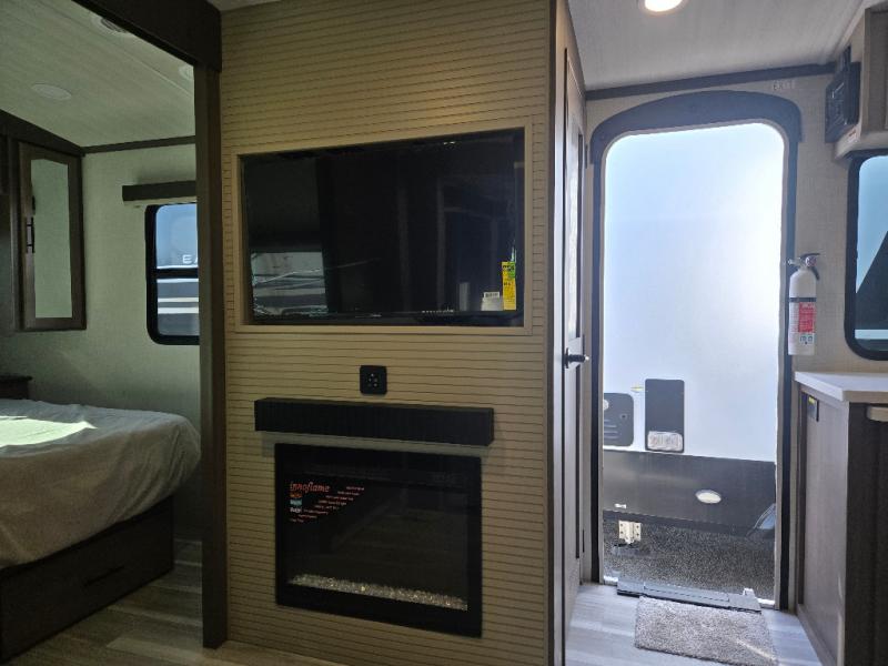 Wherever you decide to camp in this travel trailer, you'll be met with comfort and convenience! The full rear bath includes a space saving sliding door, toilet, sink, and linen closet for towels. A large slide out provides more space to move about, and here you'll enjoy the tri-fold sleeper sofa and booth dinette with storage drawers. There is also a fireplace and TV across from the furniture to enjoy movie nights! The chef of your group can make meals on the cooktop or in the microwave, and there is a pull-out countertop for extra counter space. Up front, a private bedroom includes a king bed, dual nightstands, and washer and dryer prep.