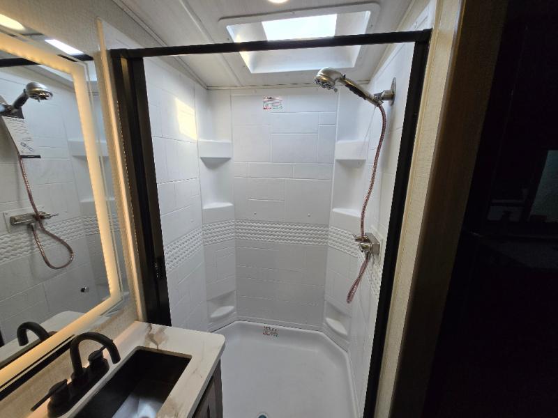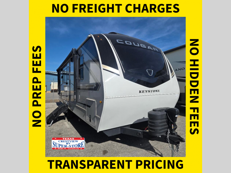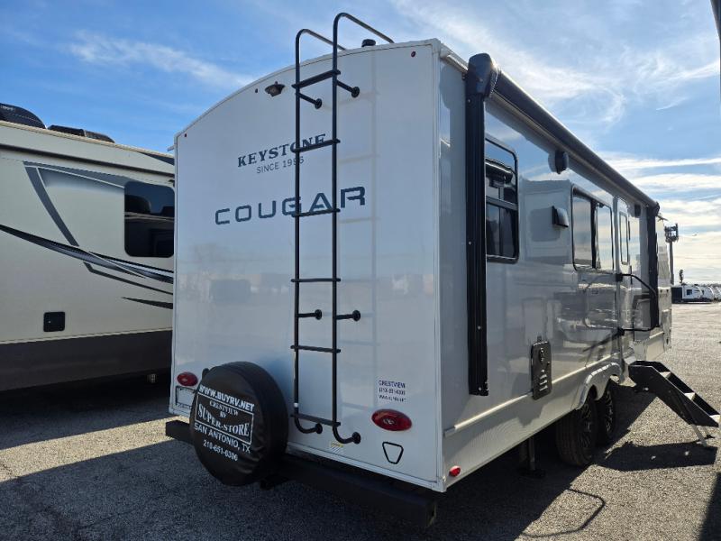 The Keystone Cougar Half-Ton fifth wheel and travel trailers are known as one of America's favorites for a reason! Some of those reasons are the exclusive features that come from Keystone, like the Winegard Air 360+ omni-directional rooftop antenna, the in-floor heating ducts, and the HyperCore composite wall construction with Vixen Fibrogloss high-gloss finish. The Cougar Half-Ton has a Climate Guard protection package with heat-deflecting white sidewalls, two roof attic vents, PEX plumbing and more to enjoy four season camping. Inside, you'll love the dimmable lighting, night roller shades throughout, shower skylight, and bedside USB outlets to keep your electronics charged.