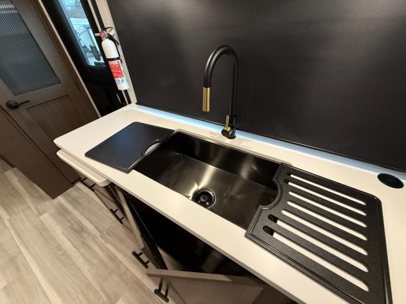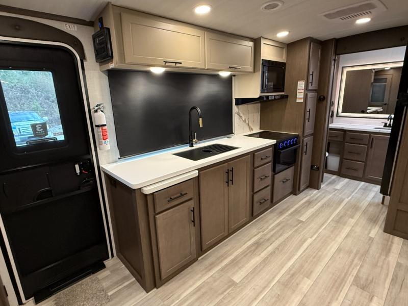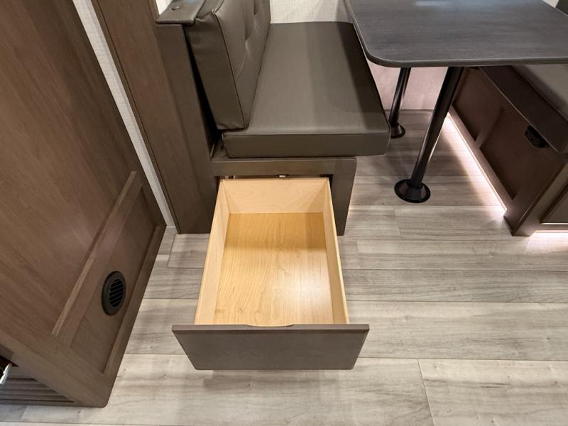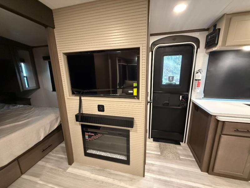 Wherever you decide to camp in this travel trailer, you'll be met with comfort and convenience! The full rear bath includes a space saving sliding door, toilet, sink, and linen closet for towels. A large slide out provides more space to move about, and here you'll enjoy the tri-fold sleeper sofa and booth dinette with storage drawers. There is also a fireplace and TV across from the furniture to enjoy movie nights! The chef of your group can make meals on the cooktop or in the microwave, and there is a pull-out countertop for extra counter space. Up front, a private bedroom includes a king bed, dual nightstands, and washer and dryer prep.