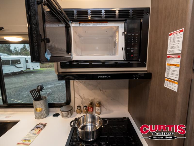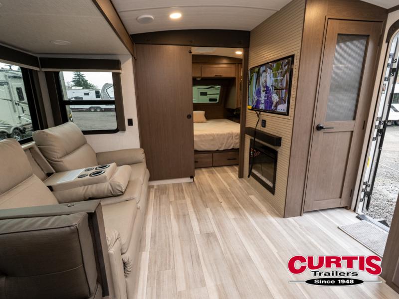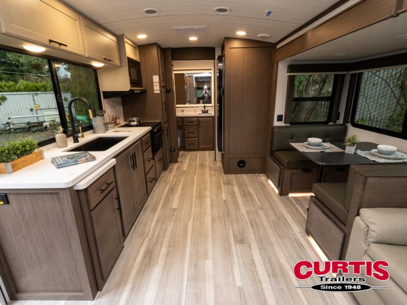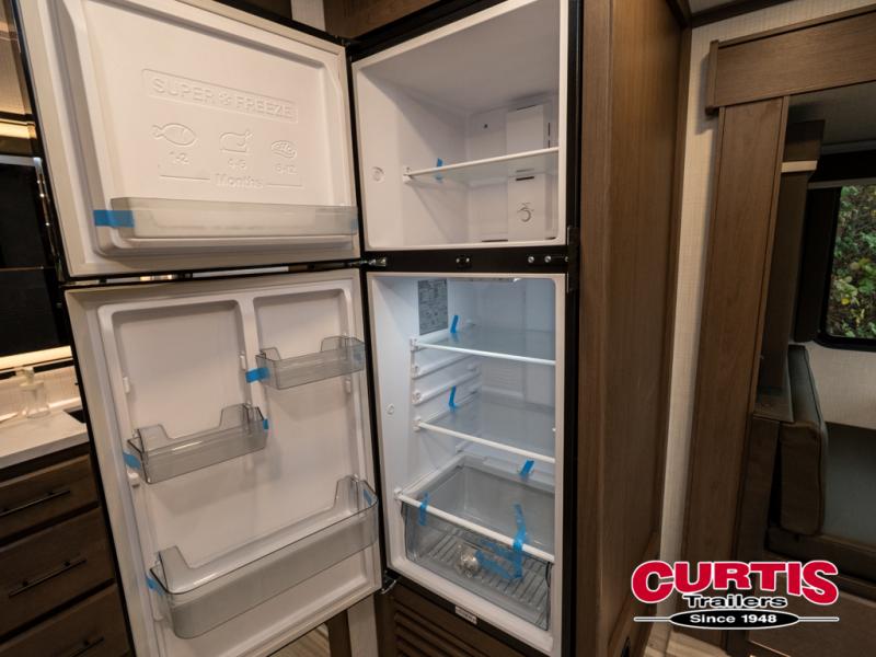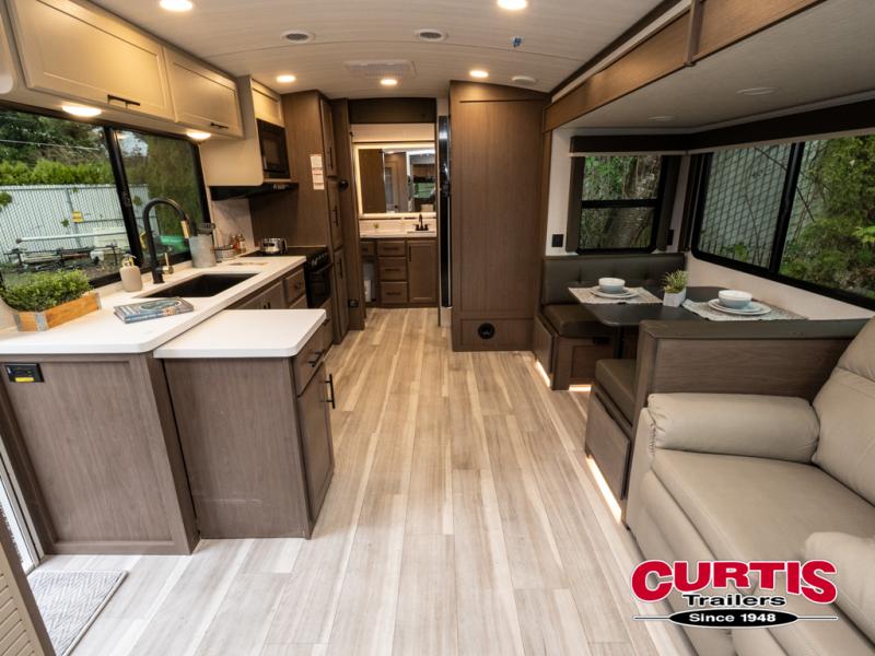 Wherever you decide to camp in this travel trailer, you'll be met with comfort and convenience! The full rear bath includes a space saving sliding door, toilet, sink, and linen closet for towels. A large slide out provides more space to move about, and here you'll enjoy the tri-fold sleeper sofa and booth dinette with storage drawers. There is also a fireplace and TV across from the furniture to enjoy movie nights! The chef of your group can make meals on the cooktop or in the microwave, and there is a pull-out countertop for extra counter space. Up front, a private bedroom includes a king bed, dual nightstands, and washer and dryer prep.