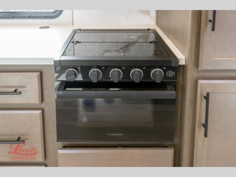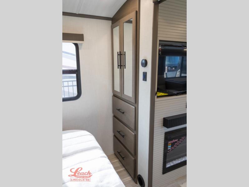 Wherever you decide to camp in this travel trailer, you'll be met with comfort and convenience! The full rear bath includes a space saving sliding door, toilet, sink, and linen closet for towels. A large slide out provides more space to move about, and here you'll enjoy the tri-fold sleeper sofa and booth dinette with storage drawers. There is also a fireplace and TV across from the furniture to enjoy movie nights! The chef of your group can make meals on the cooktop or in the microwave, and there is a pull-out countertop for extra counter space. Up front, a private bedroom includes a king bed, dual nightstands, and washer and dryer prep.