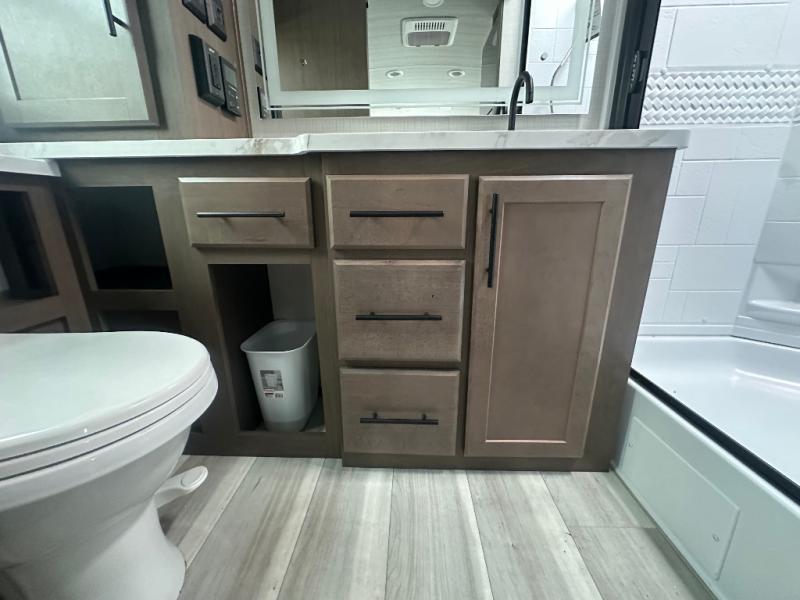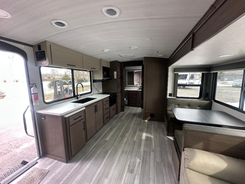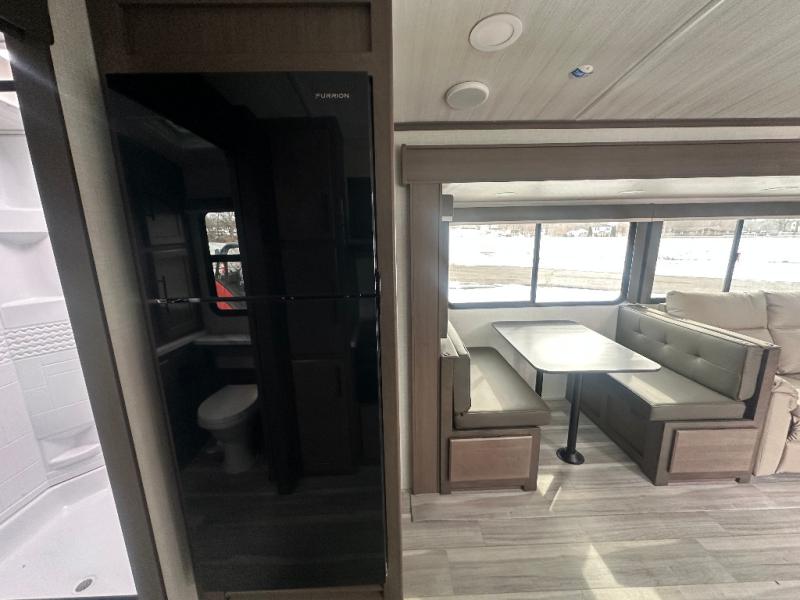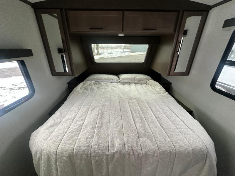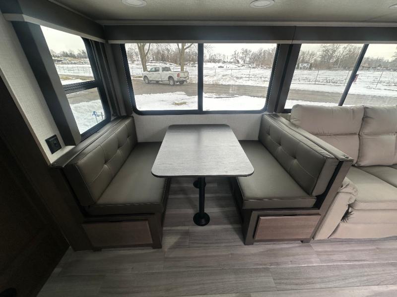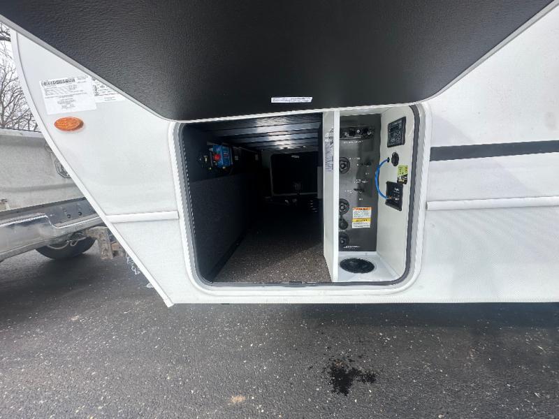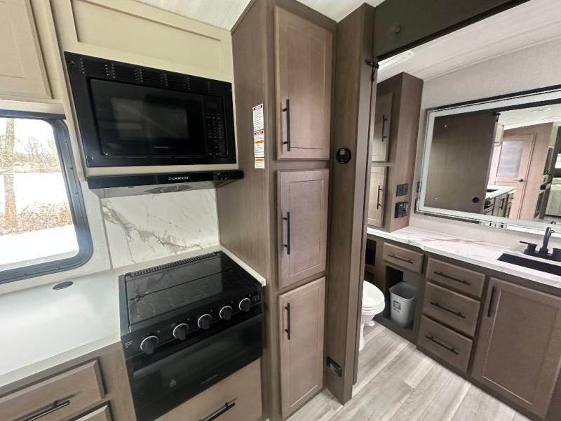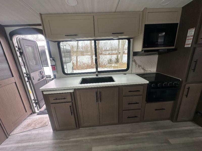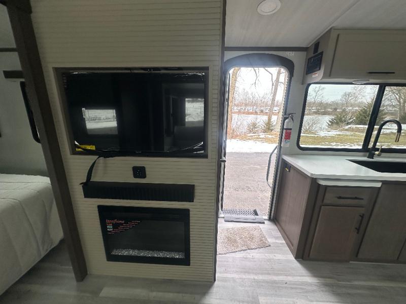 Wherever you decide to camp in this travel trailer, you'll be met with comfort and convenience! The full rear bath includes a space saving sliding door, toilet, sink, and linen closet for towels. A large slide out provides more space to move about, and here you'll enjoy the tri-fold sleeper sofa and booth dinette with storage drawers. There is also a fireplace and TV across from the furniture to enjoy movie nights! The chef of your group can make meals on the cooktop or in the microwave, and there is a pull-out countertop for extra counter space. Up front, a private bedroom includes a king bed, dual nightstands, and washer and dryer prep.