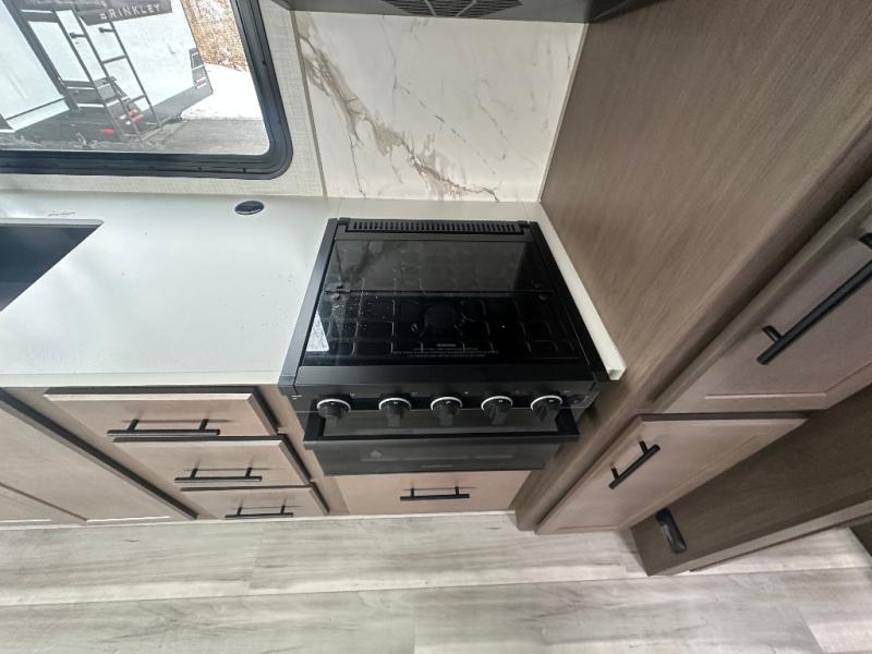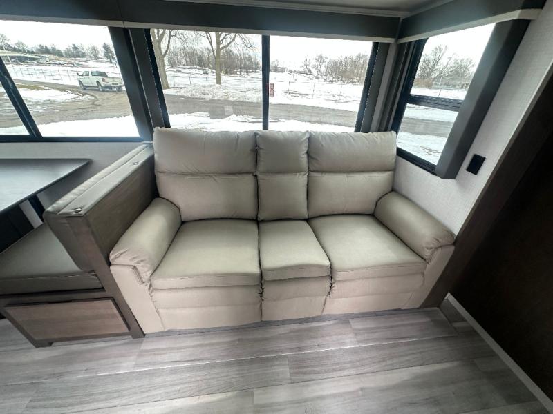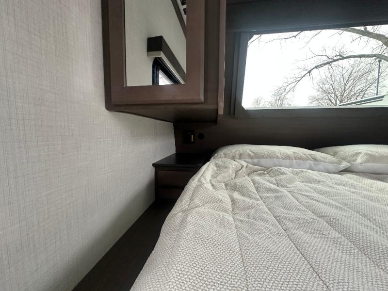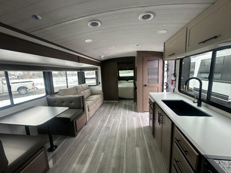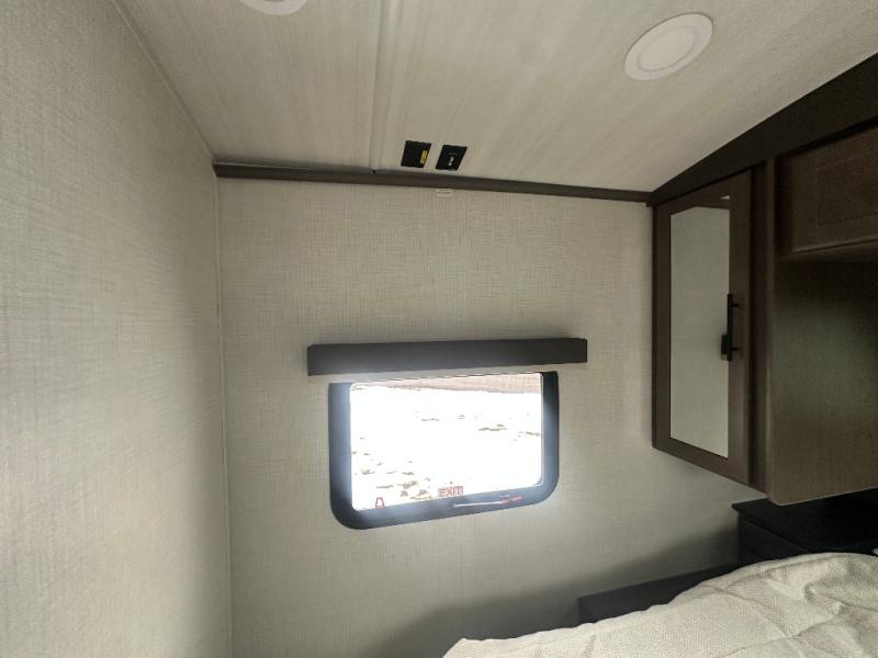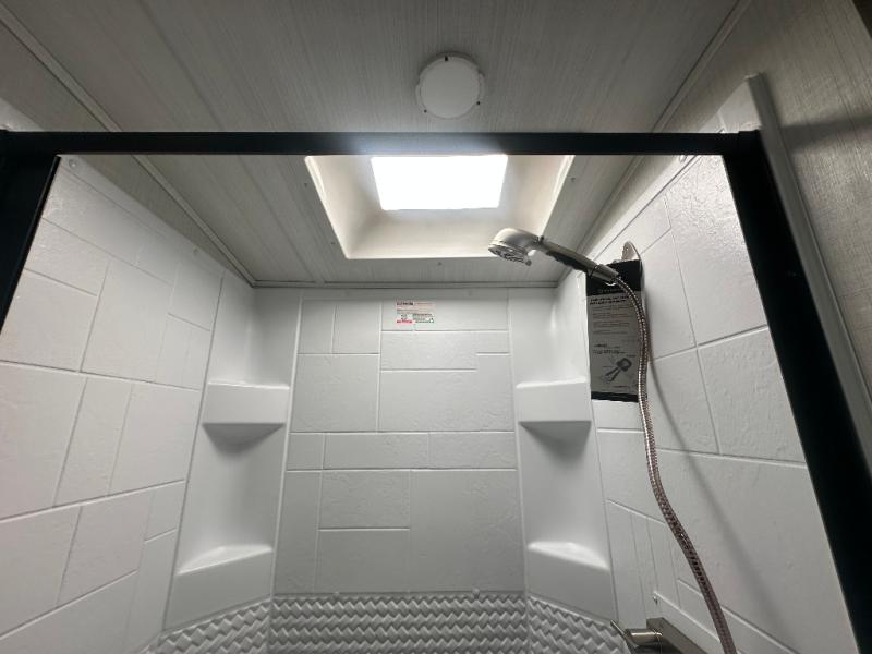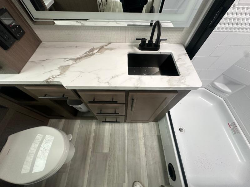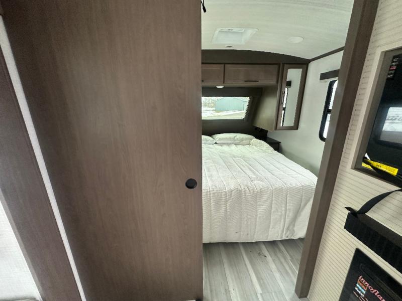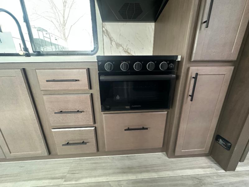 Wherever you decide to camp in this travel trailer, you'll be met with comfort and convenience! The full rear bath includes a space saving sliding door, toilet, sink, and linen closet for towels. A large slide out provides more space to move about, and here you'll enjoy the tri-fold sleeper sofa and booth dinette with storage drawers. There is also a fireplace and TV across from the furniture to enjoy movie nights! The chef of your group can make meals on the cooktop or in the microwave, and there is a pull-out countertop for extra counter space. Up front, a private bedroom includes a king bed, dual nightstands, and washer and dryer prep.