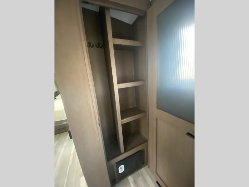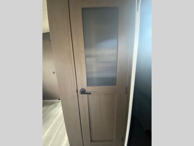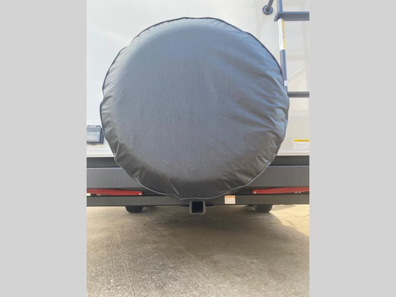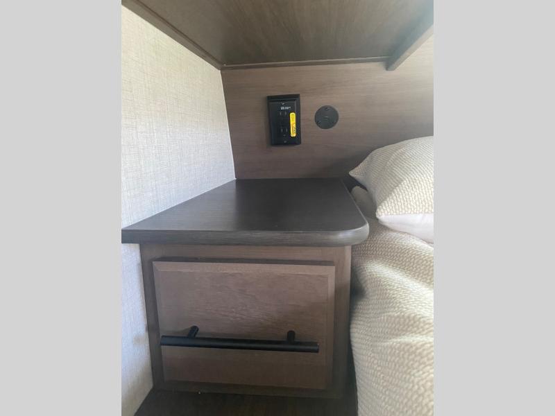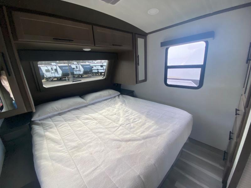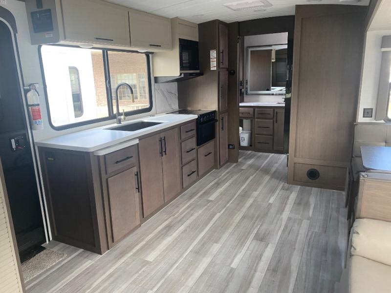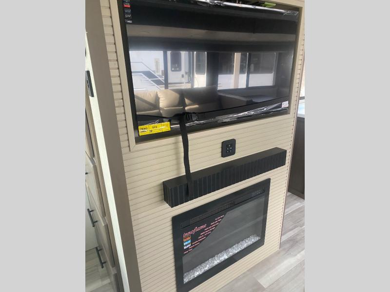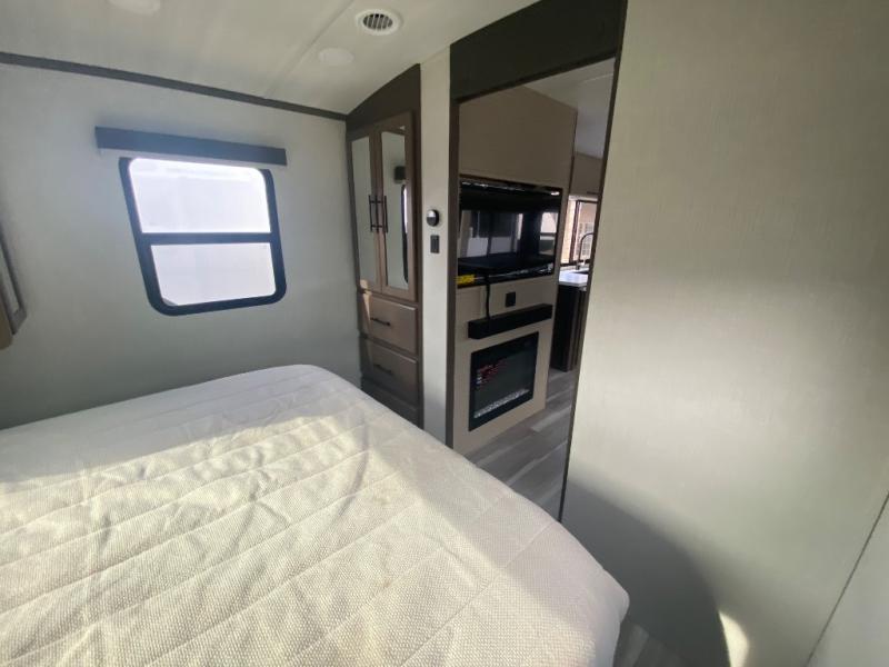 Wherever you decide to camp in this travel trailer, you'll be met with comfort and convenience! The full rear bath includes a space saving sliding door, toilet, sink, and linen closet for towels. A large slide out provides more space to move about, and here you'll enjoy the tri-fold sleeper sofa and booth dinette with storage drawers. There is also a fireplace and TV across from the furniture to enjoy movie nights! The chef of your group can make meals on the cooktop or in the microwave, and there is a pull-out countertop for extra counter space. Up front, a private bedroom includes a king bed, dual nightstands, and washer and dryer prep.