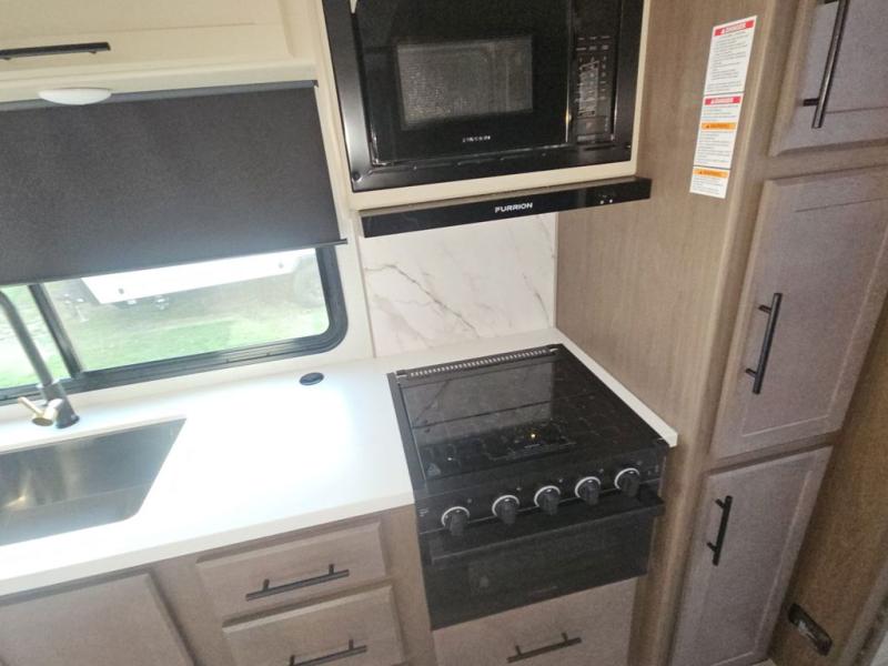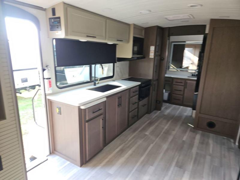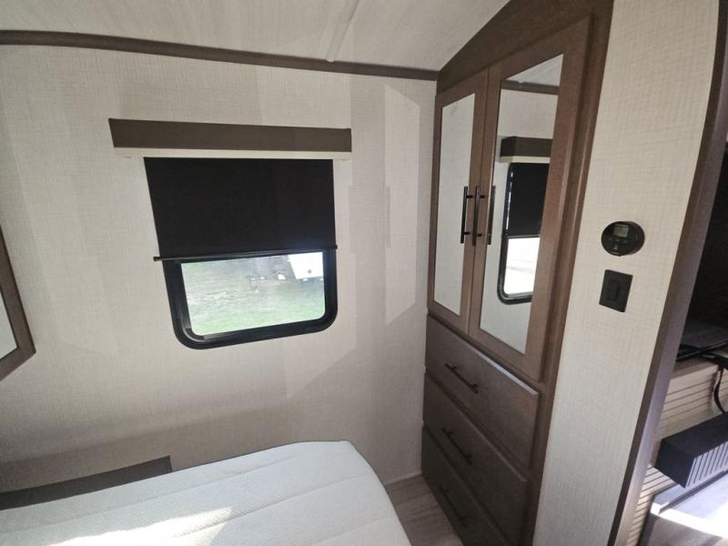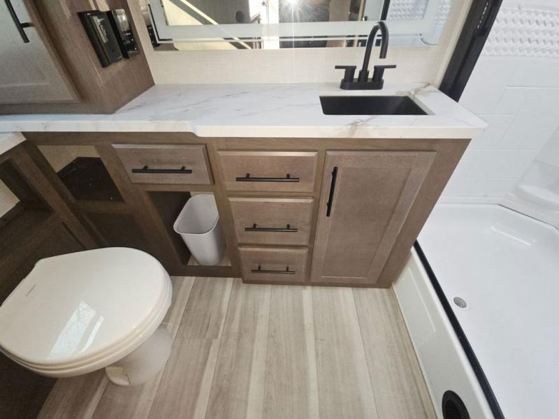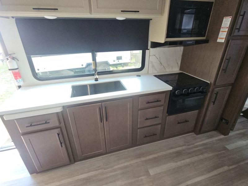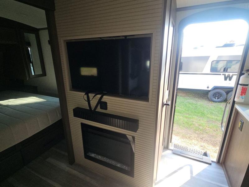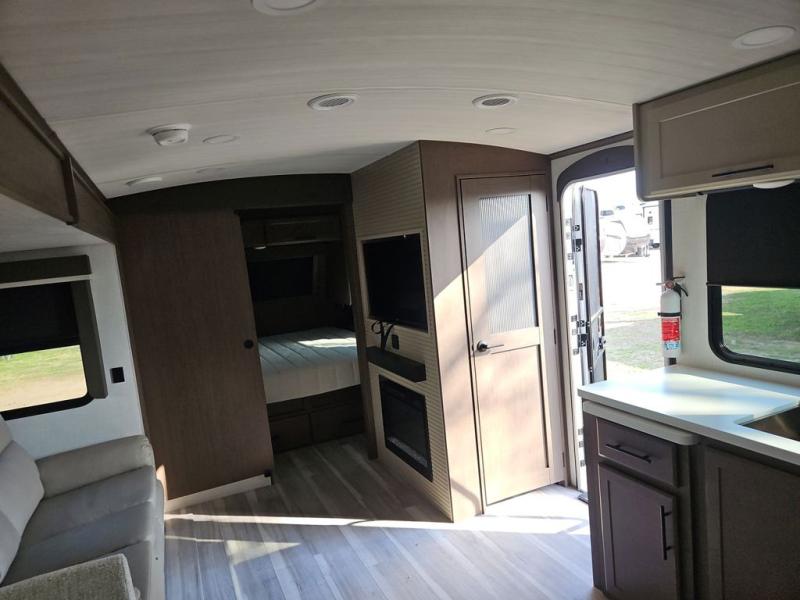 Wherever you decide to camp in this travel trailer, you'll be met with comfort and convenience! The full rear bath includes a space saving sliding door, toilet, sink, and linen closet for towels. A large slide out provides more space to move about, and here you'll enjoy the tri-fold sleeper sofa and booth dinette with storage drawers. There is also a fireplace and TV across from the furniture to enjoy movie nights! The chef of your group can make meals on the cooktop or in the microwave, and there is a pull-out countertop for extra counter space. Up front, a private bedroom includes a king bed, dual nightstands, and washer and dryer prep.