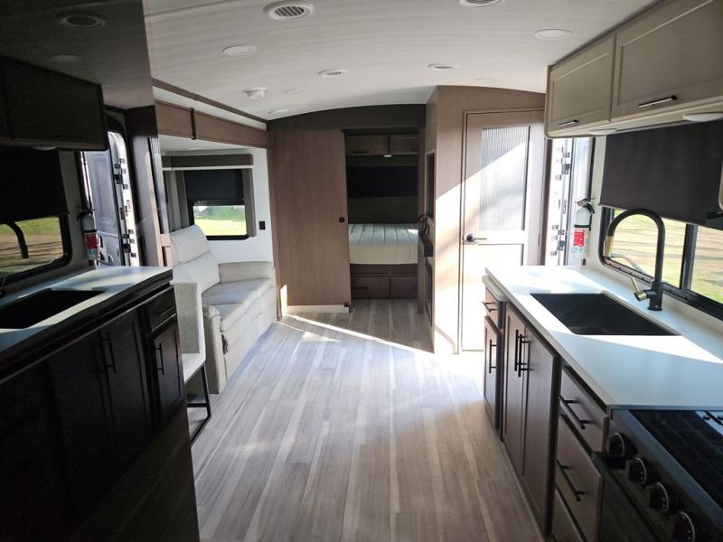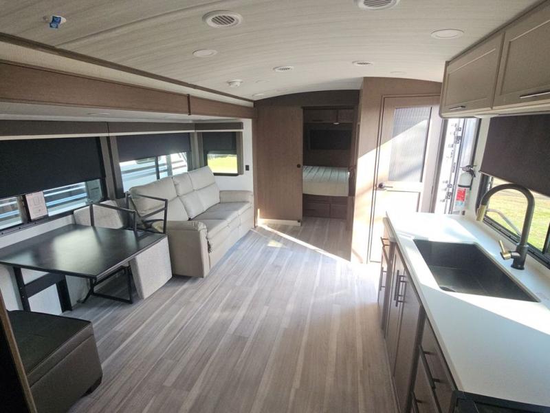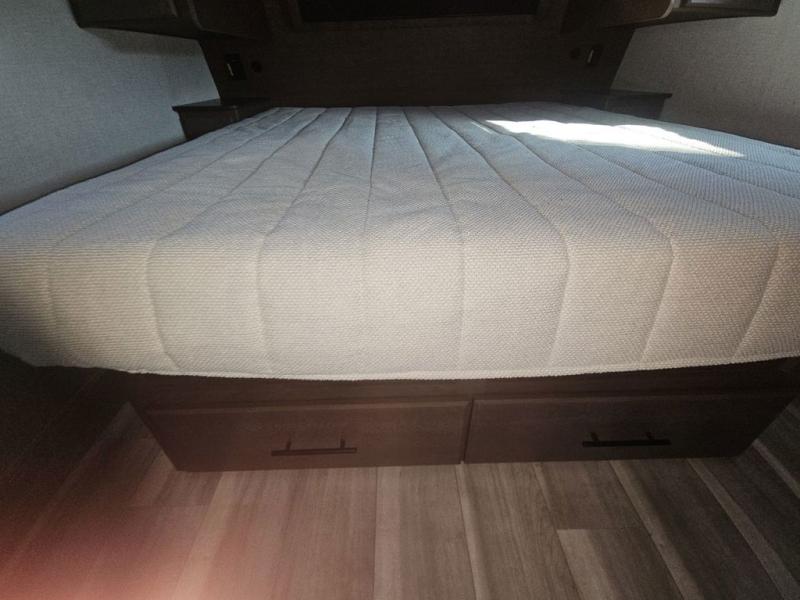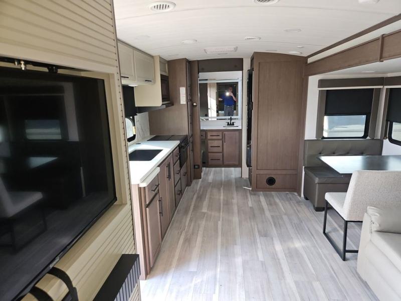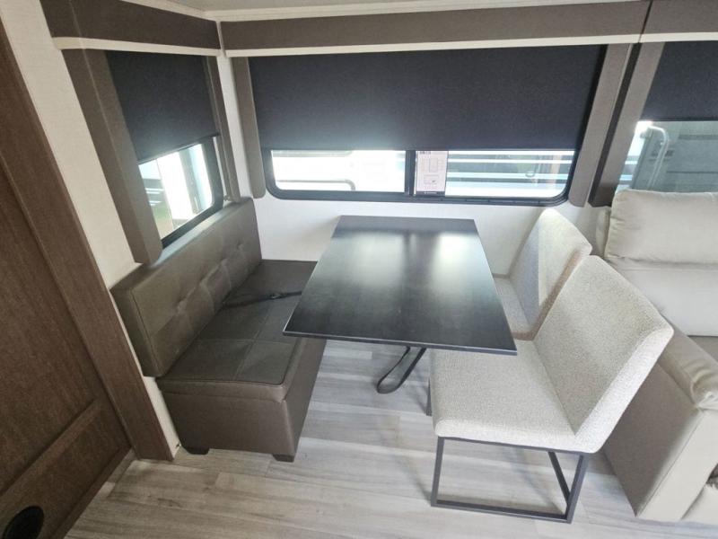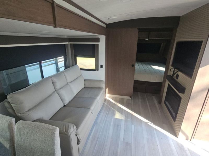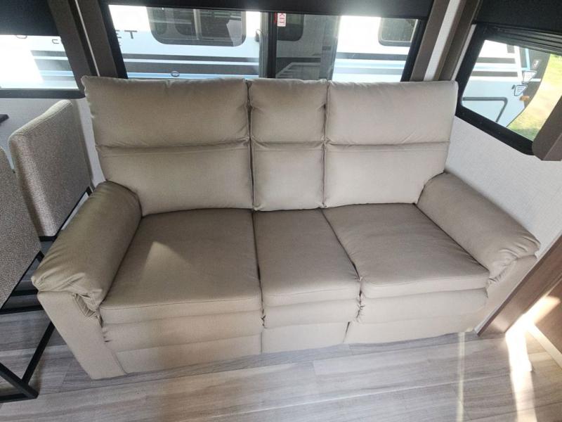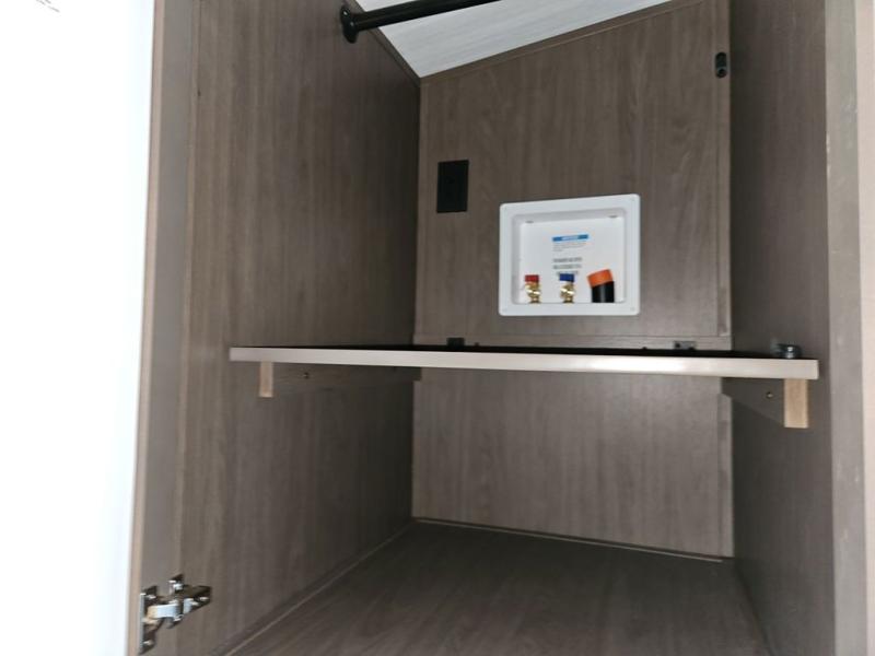 Wherever you decide to camp in this travel trailer, you'll be met with comfort and convenience! The full rear bath includes a space saving sliding door, toilet, sink, and linen closet for towels. A large slide out provides more space to move about, and here you'll enjoy the tri-fold sleeper sofa and booth dinette with storage drawers. There is also a fireplace and TV across from the furniture to enjoy movie nights! The chef of your group can make meals on the cooktop or in the microwave, and there is a pull-out countertop for extra counter space. Up front, a private bedroom includes a king bed, dual nightstands, and washer and dryer prep.