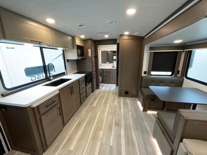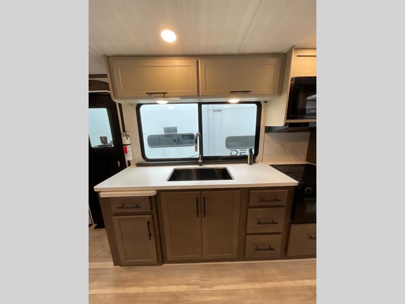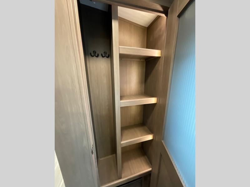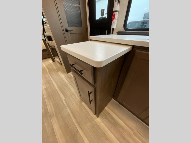 Wherever you decide to camp in this travel trailer, you'll be met with comfort and convenience! The full rear bath includes a space saving sliding door, toilet, sink, and linen closet for towels. A large slide out provides more space to move about, and here you'll enjoy the tri-fold sleeper sofa and booth dinette with storage drawers. There is also a fireplace and TV across from the furniture to enjoy movie nights! The chef of your group can make meals on the cooktop or in the microwave, and there is a pull-out countertop for extra counter space. Up front, a private bedroom includes a king bed, dual nightstands, and washer and dryer prep.