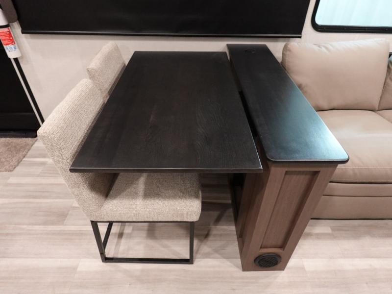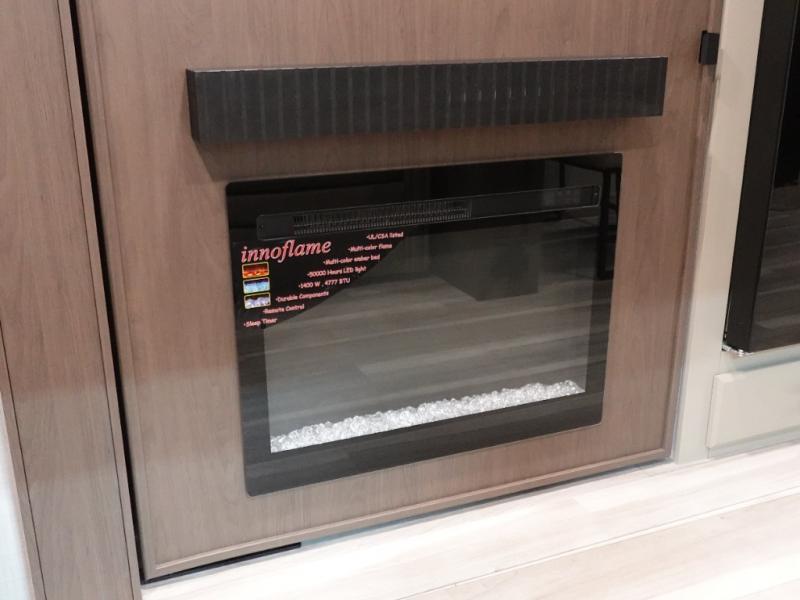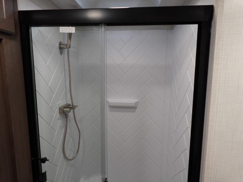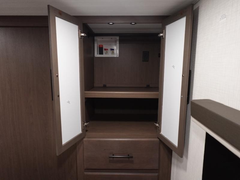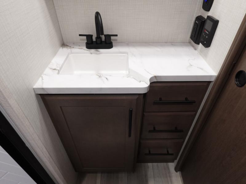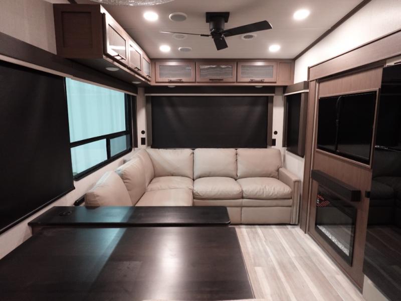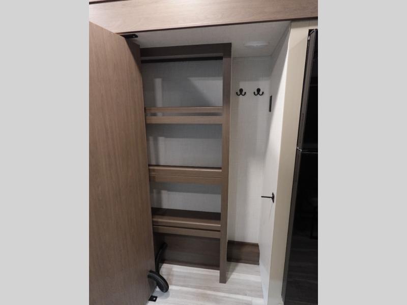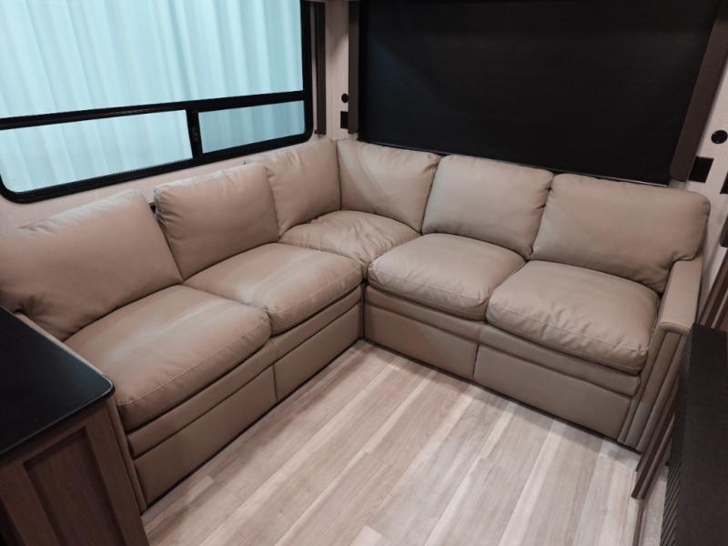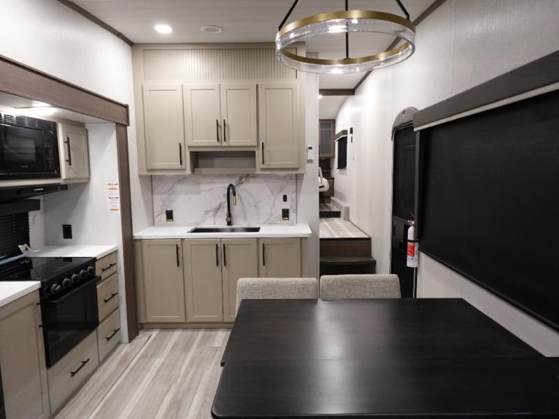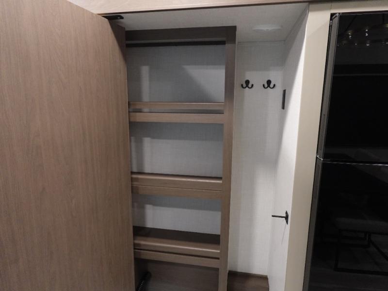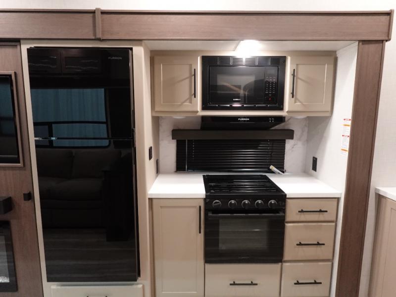 Comfort is just a step away in this fifth wheel with a large slide out. Here, you'll find the hidden pantry behind the pivoting entertainment door plus your kitchen appliances. The stainless steel sink will let you easily clean up, and the pivot dinette with two extra folding chairs provides versatile space to dine or work. Your crew can get comfortable on the L-shaped sofa after dinner, or head outdoors under the 18' power awning. A full bath lets you clean up after a day at the lake, and the front private bedroom with a king bed gives you your own space at night. There are also dual wardrobes and nightstands plus a wardrobe with washer and dryer prep for the option to go full-time!