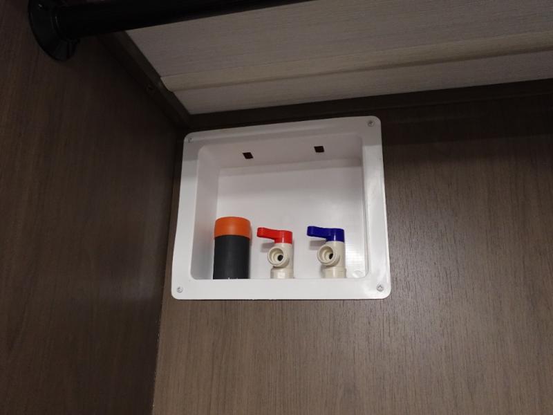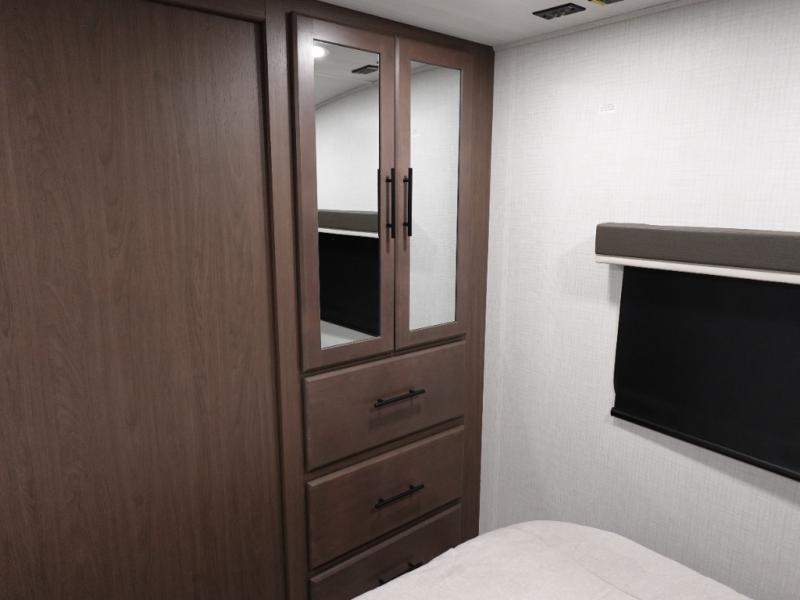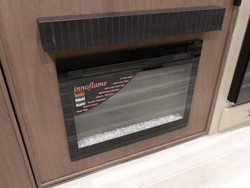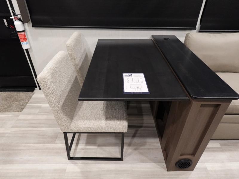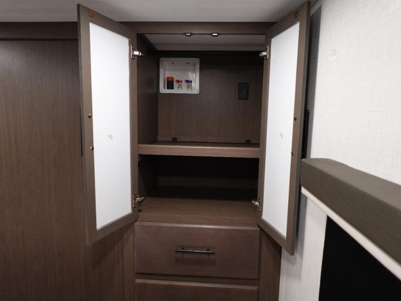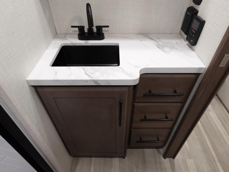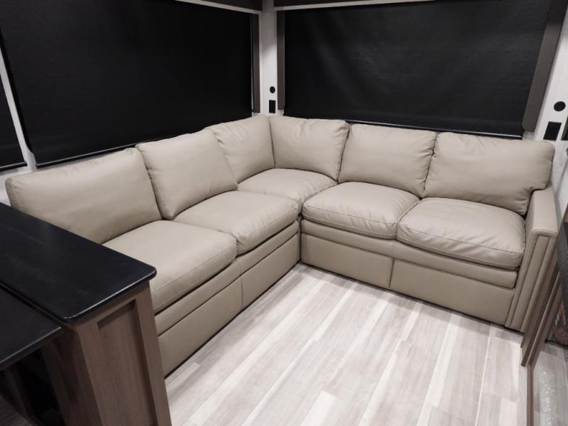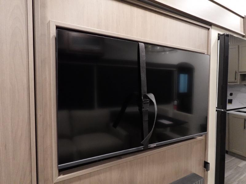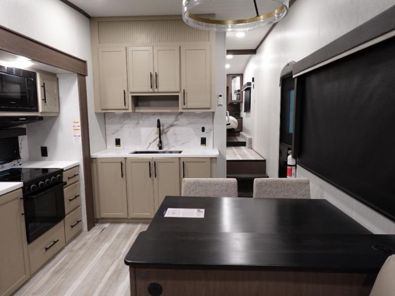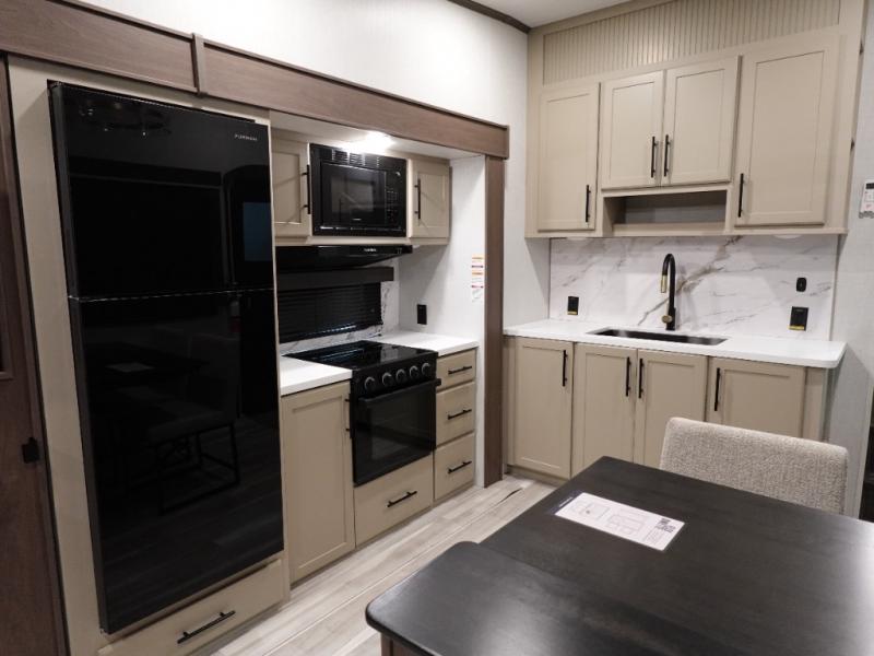 Comfort is just a step away in this fifth wheel with a large slide out. Here, you'll find the hidden pantry behind the pivoting entertainment door plus your kitchen appliances. The stainless steel double sink will let you easily clean up, and the sliding desk/dinette provides versatile space to dine or work. Your crew can get comfortable on the L-shaped sofa after dinner, or head outdoors under the 18' power awning. A full bath lets you clean up after a day at the lake, and the front private bedroom with a king bed gives you your own space at night. There are also dual wardrobes and nightstands plus a wardrobe with washer and dryer prep for the option to go full-time!