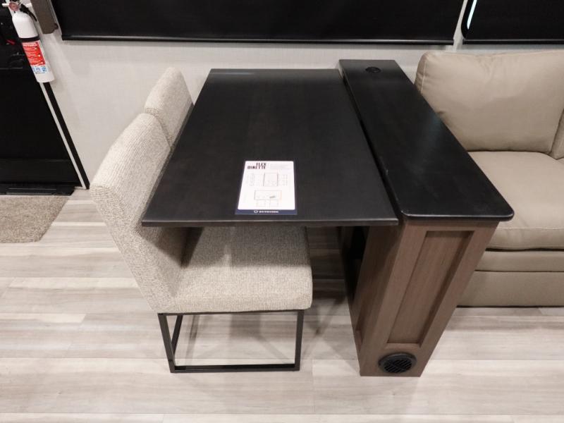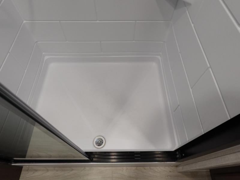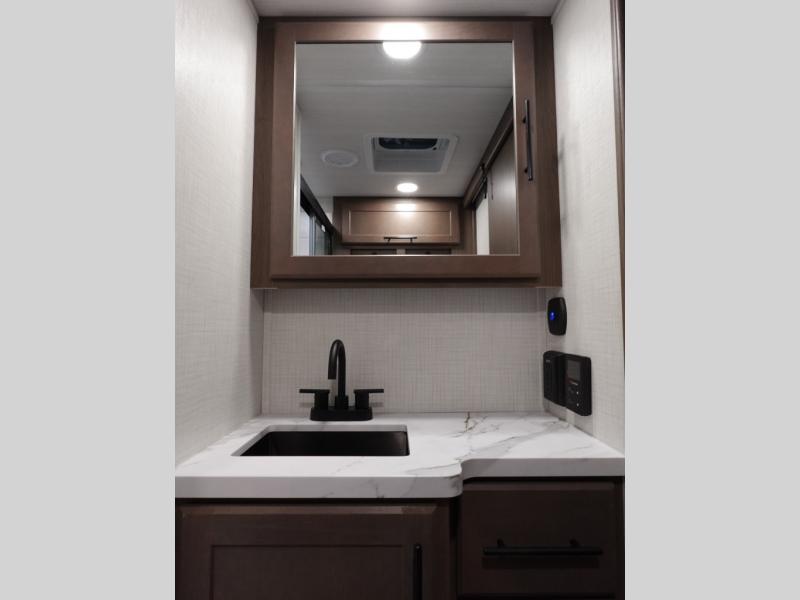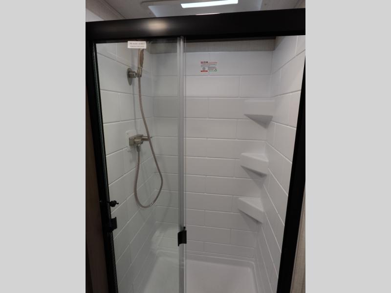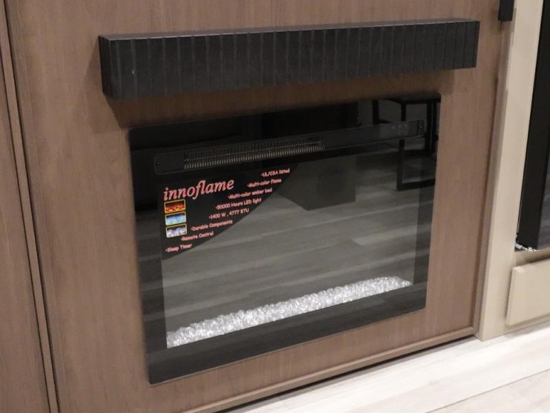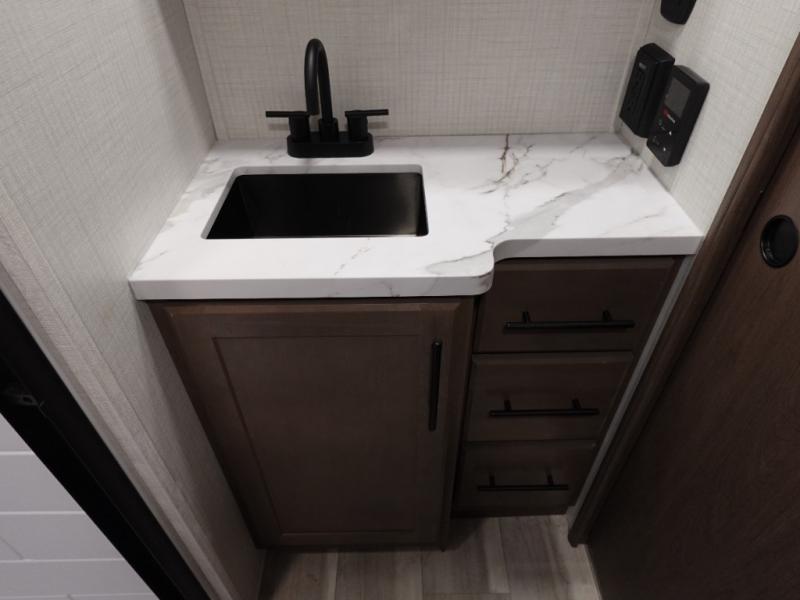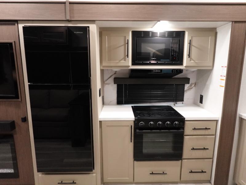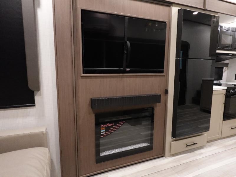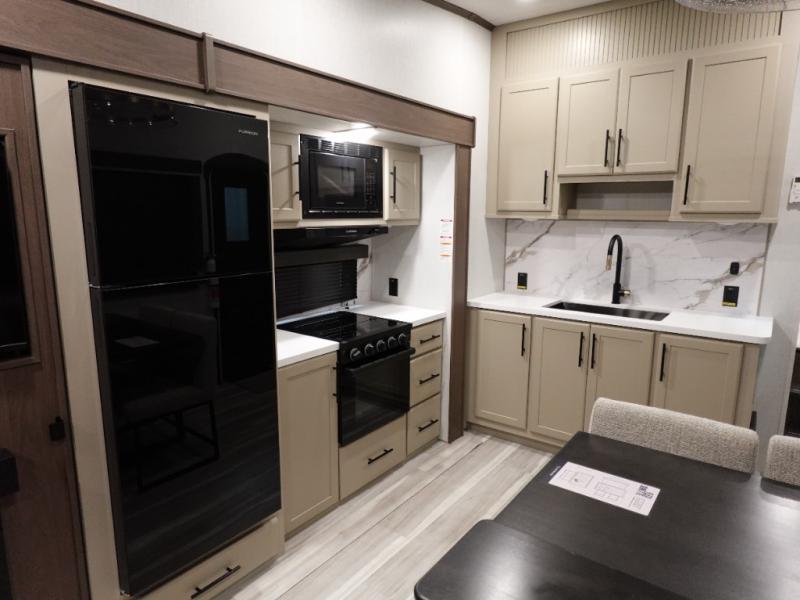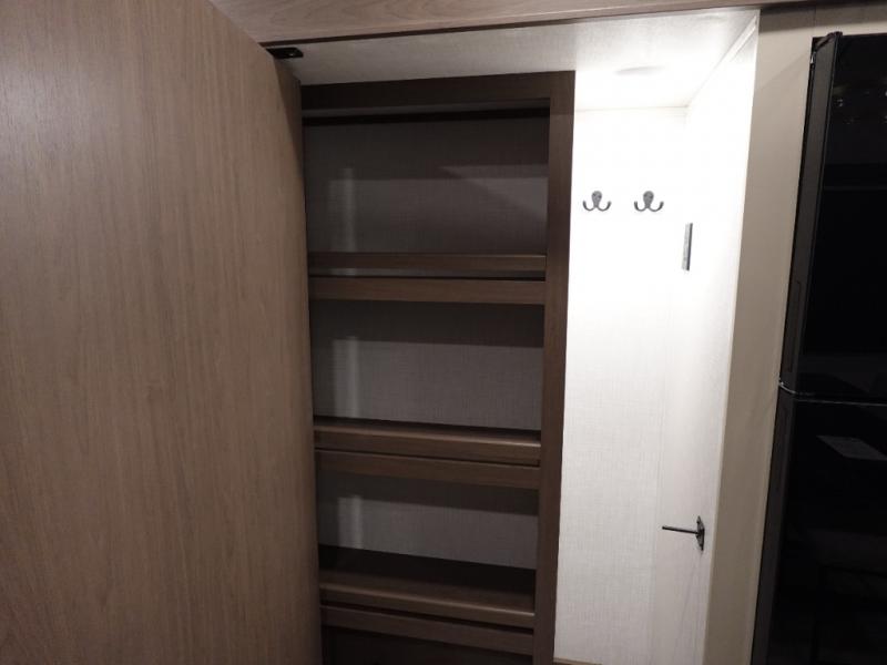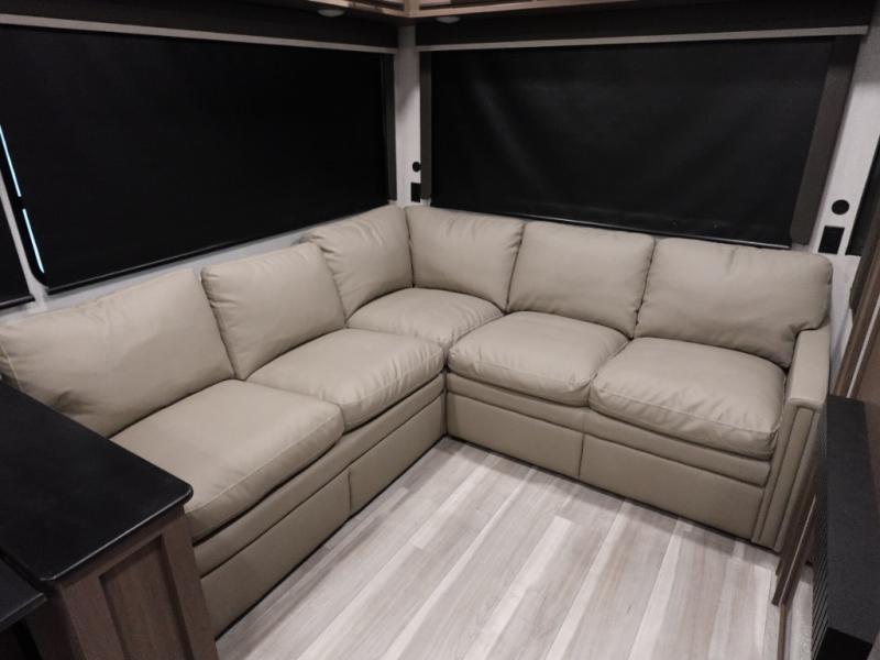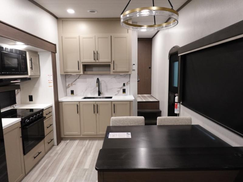Comfort is just a step away in this fifth wheel with a large slide out. Here, you'll find the hidden pantry behind the pivoting entertainment door plus your kitchen appliances. The stainless steel double sink will let you easily clean up, and the sliding desk/dinette provides versatile space to dine or work. Your crew can get comfortable on the L-shaped sofa after dinner, or head outdoors under the 18' power awning. A full bath lets you clean up after a day at the lake, and the front private bedroom with a queen bed gives you your own space at night.