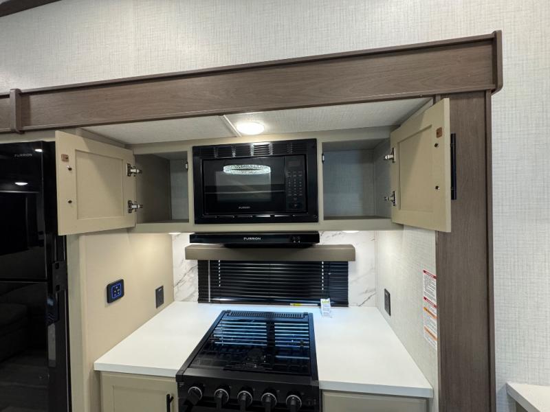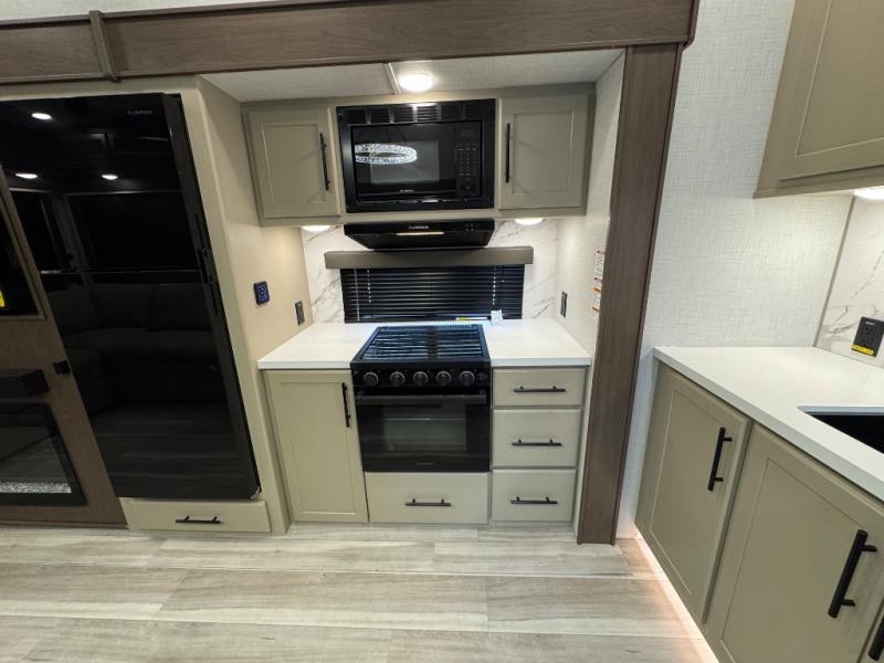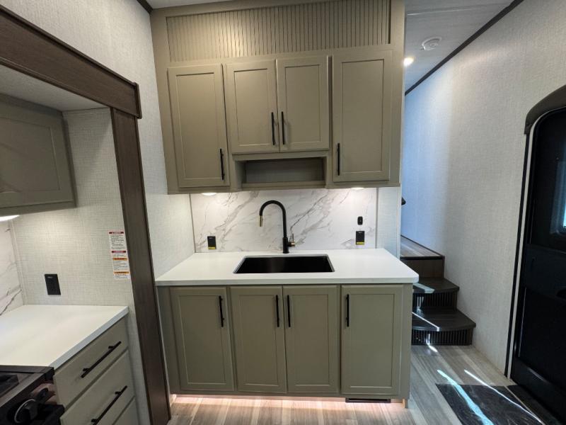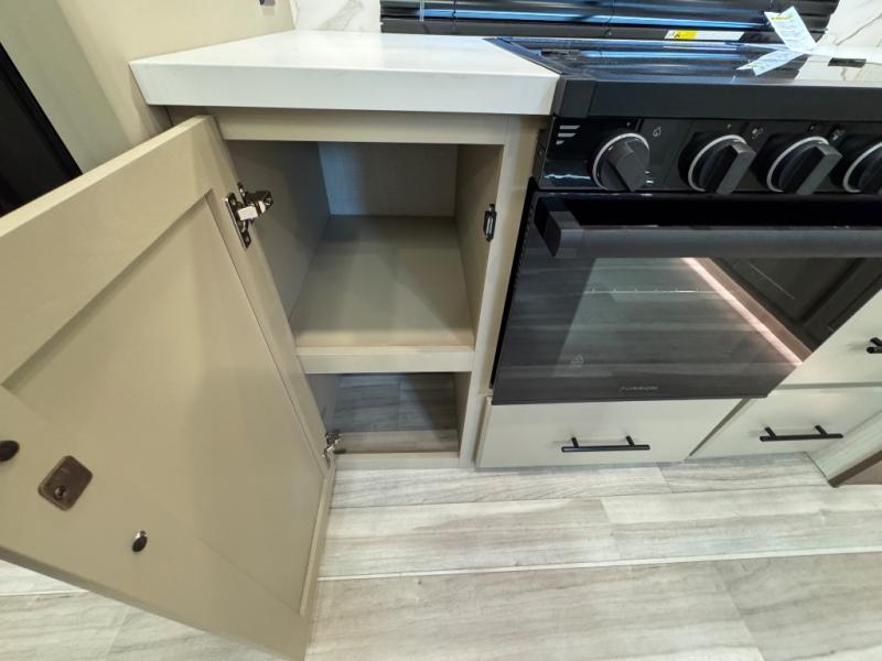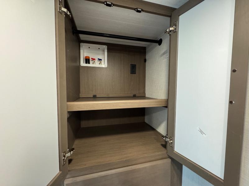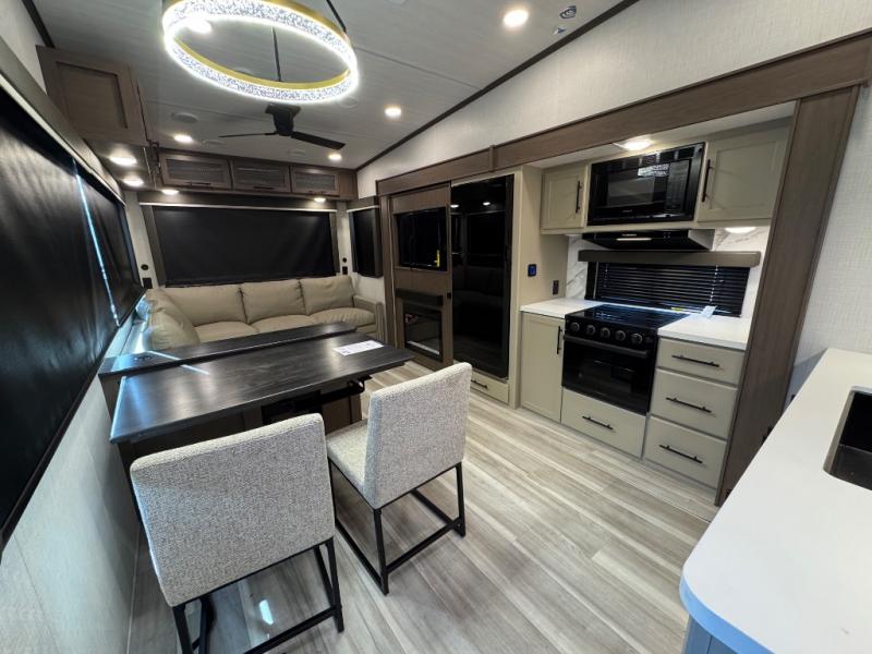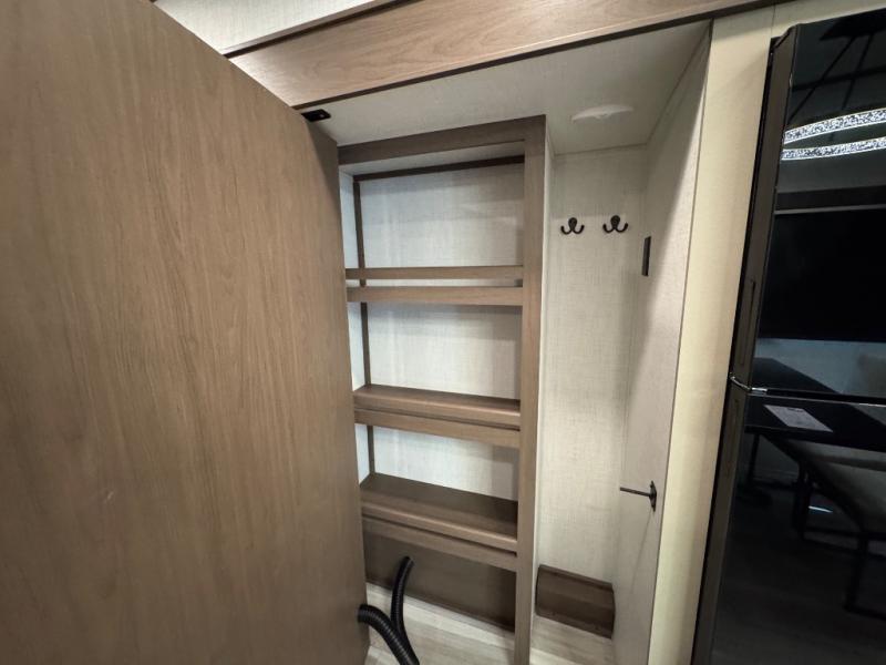 Comfort is just a step away in this fifth wheel with a large slide out. Here, you'll find the hidden pantry behind the pivoting entertainment door plus your kitchen appliances. The stainless steel sink will let you easily clean up, and the pivot dinette with two extra folding chairs provides versatile space to dine or work. Your crew can get comfortable on the L-shaped sofa after dinner, or head outdoors under the 18' power awning. A full bath lets you clean up after a day at the lake, and the front private bedroom with a king bed gives you your own space at night. There are also dual wardrobes and nightstands plus a wardrobe with washer and dryer prep for the option to go full-time!