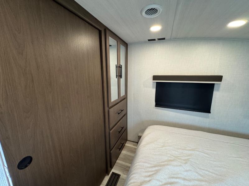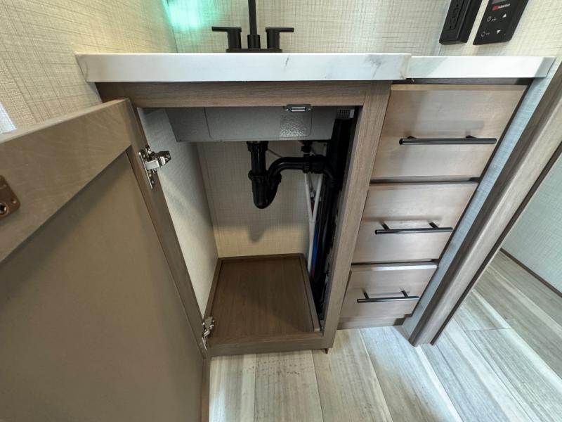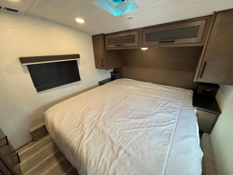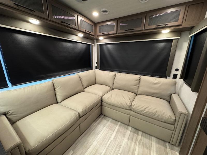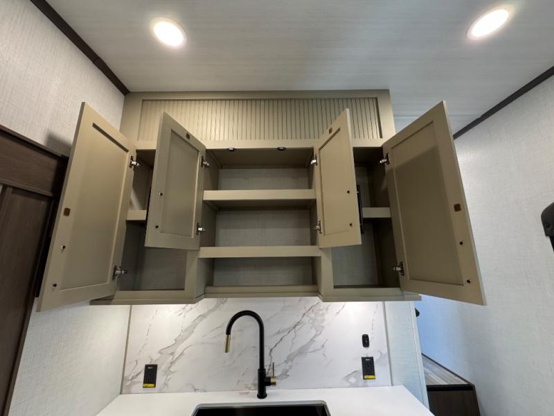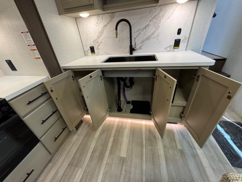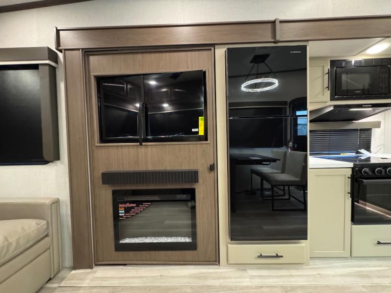 Comfort is just a step away in this fifth wheel with a large slide out. Here, you'll find the hidden pantry behind the pivoting entertainment door plus your kitchen appliances. The stainless steel sink will let you easily clean up, and the pivot dinette with two extra folding chairs provides versatile space to dine or work. Your crew can get comfortable on the L-shaped sofa after dinner, or head outdoors under the 18' power awning. A full bath lets you clean up after a day at the lake, and the front private bedroom with a king bed gives you your own space at night. There are also dual wardrobes and nightstands plus a wardrobe with washer and dryer prep for the option to go full-time!