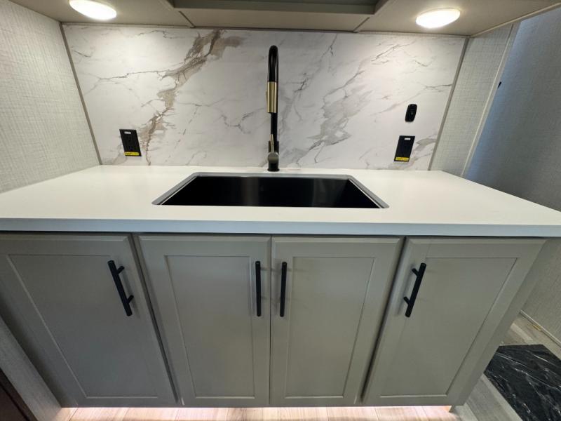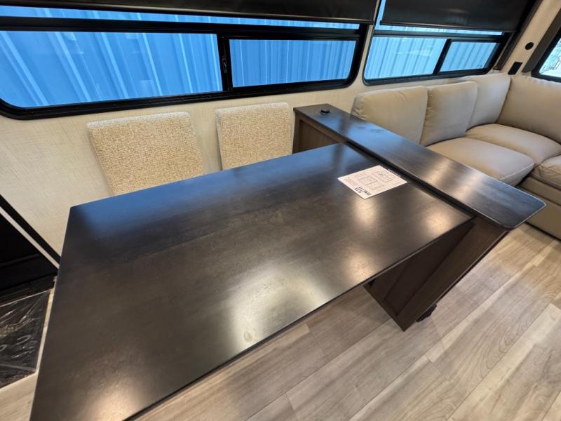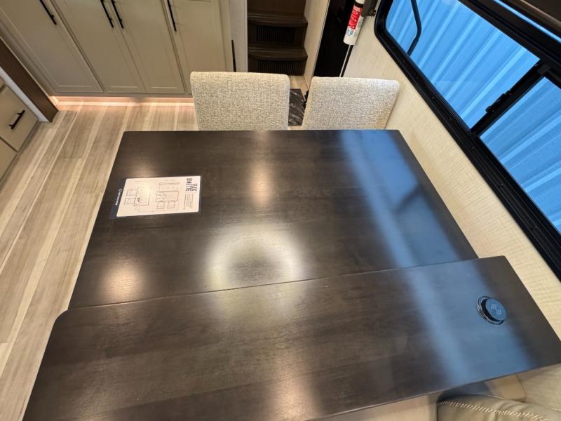 Comfort is just a step away in this fifth wheel with a large slide out. Here, you'll find the hidden pantry behind the pivoting entertainment door plus your kitchen appliances. The stainless steel sink will let you easily clean up, and the pivot dinette with two extra folding chairs provides versatile space to dine or work. Your crew can get comfortable on the L-shaped sofa after dinner, or head outdoors under the 18' power awning. A full bath lets you clean up after a day at the lake, and the front private bedroom with a king bed gives you your own space at night. There are also dual wardrobes and nightstands plus a wardrobe with washer and dryer prep for the option to go full-time!