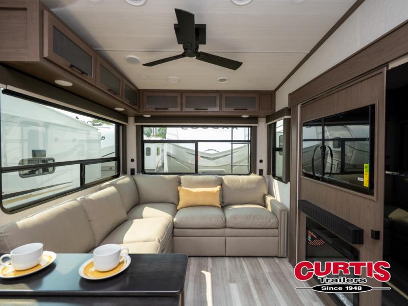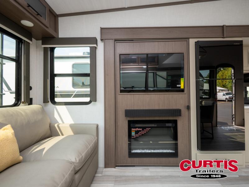 Comfort is just a step away in this fifth wheel with a large slide out. Here, you'll find the hidden pantry behind the pivoting entertainment door plus your kitchen appliances. The stainless steel sink will let you easily clean up, and the pivot dinette with two extra folding chairs provides versatile space to dine or work. Your crew can get comfortable on the L-shaped sofa after dinner, or head outdoors under the 18' power awning. A full bath lets you clean up after a day at the lake, and the front private bedroom with a king bed gives you your own space at night. There are also dual wardrobes and nightstands plus a wardrobe with washer and dryer prep for the option to go full-time!