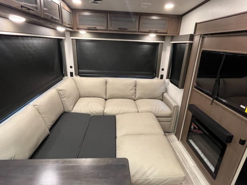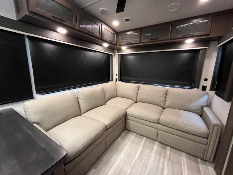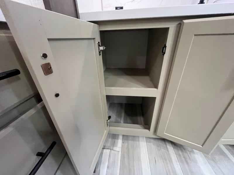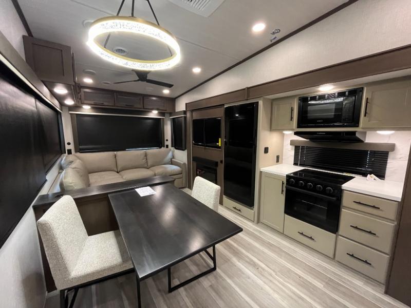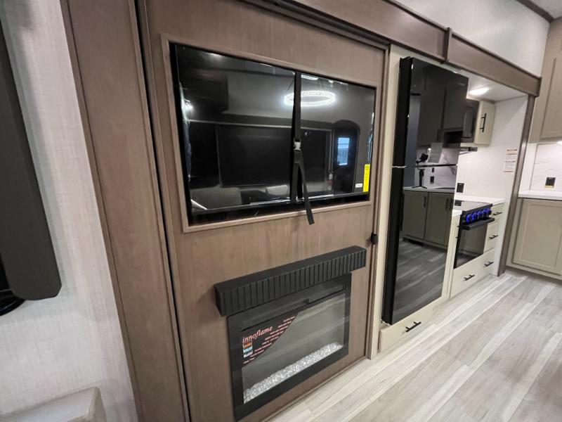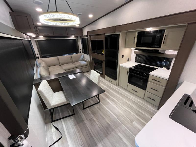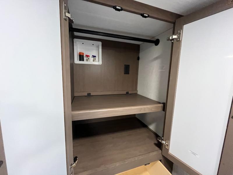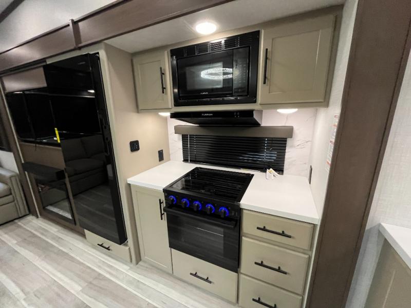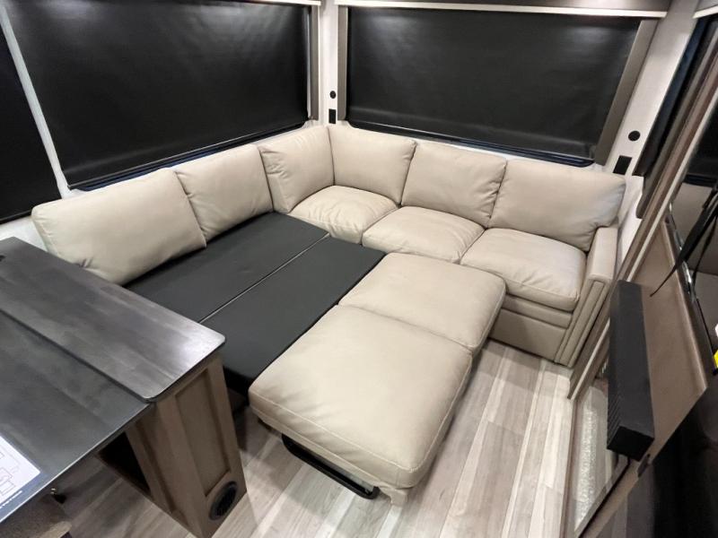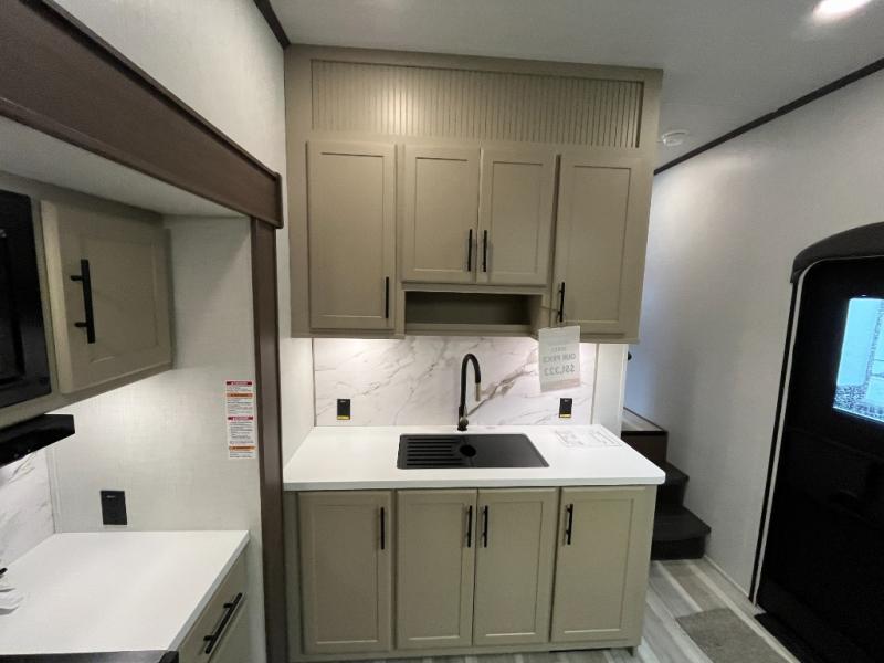 Comfort is just a step away in this fifth wheel with a large slide out. Here, you'll find the hidden pantry behind the pivoting entertainment door plus your kitchen appliances. The stainless steel sink will let you easily clean up, and the pivot dinette with two extra folding chairs provides versatile space to dine or work. Your crew can get comfortable on the L-shaped sofa after dinner, or head outdoors under the 18' power awning. A full bath lets you clean up after a day at the lake, and the front private bedroom with a king bed gives you your own space at night. There are also dual wardrobes and nightstands plus a wardrobe with washer and dryer prep for the option to go full-time!